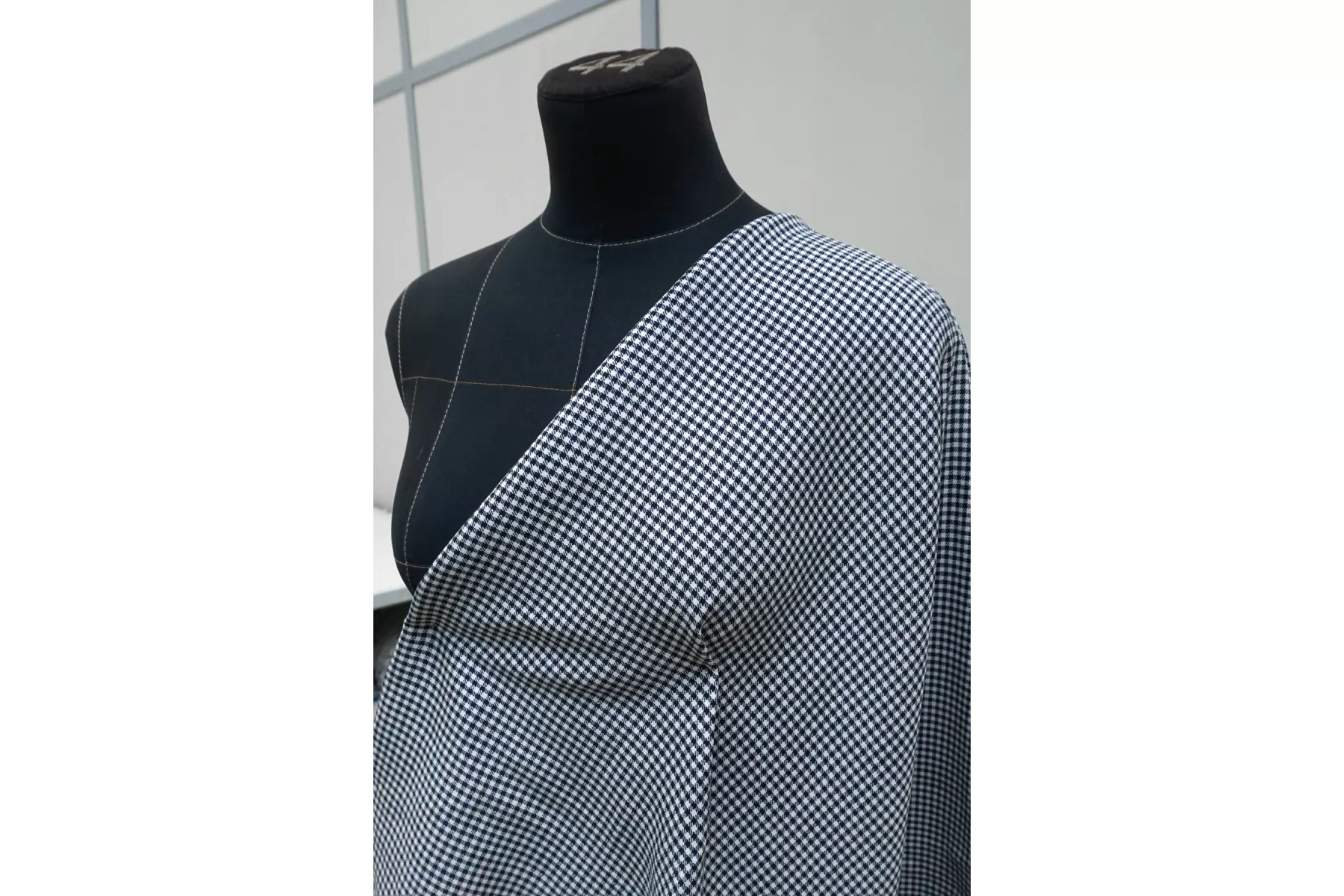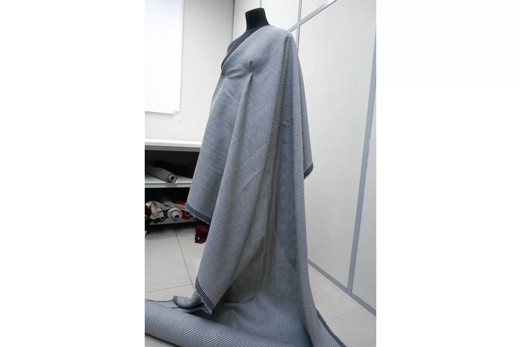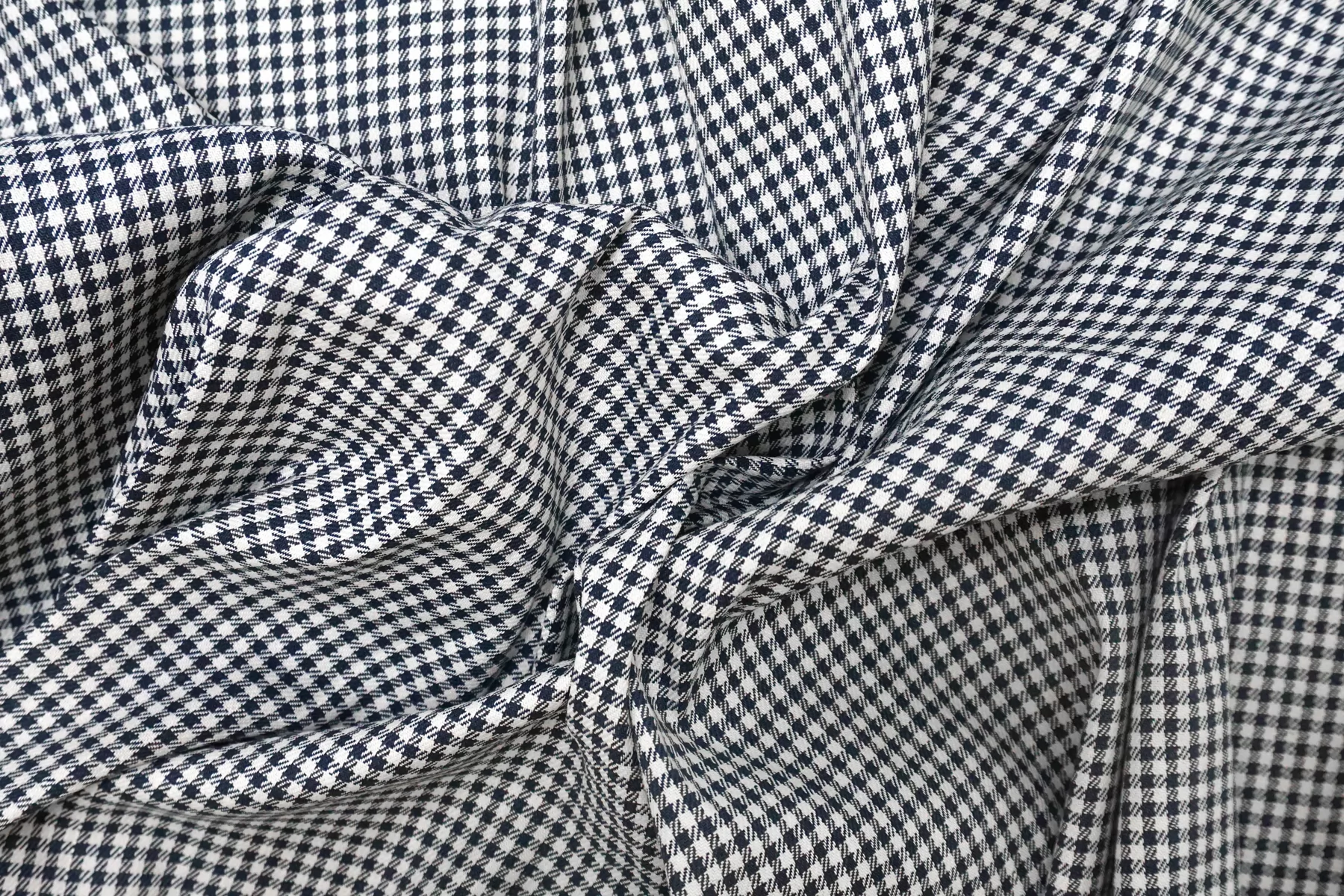 Прекрасный костюмный хлопок с узором-гусиной лапкой-клеткой из нитей белого и тёмно-синего цвета. Плотный, формодержащий, но при этом пластичный. Тянется, не просвечивает. Подойдет для пошива костюма, юбки, платья.