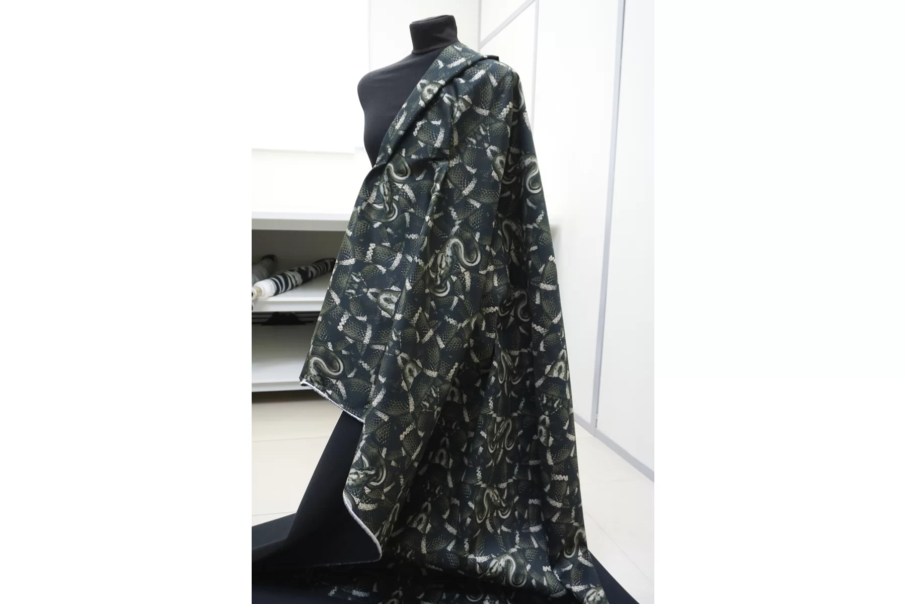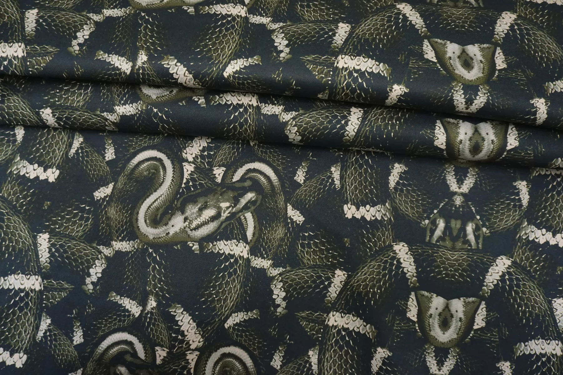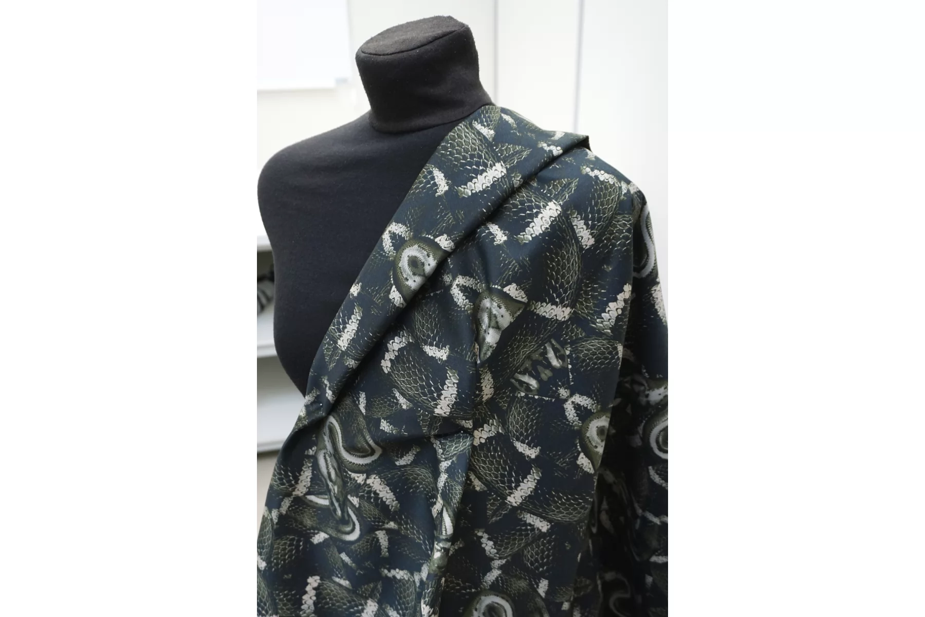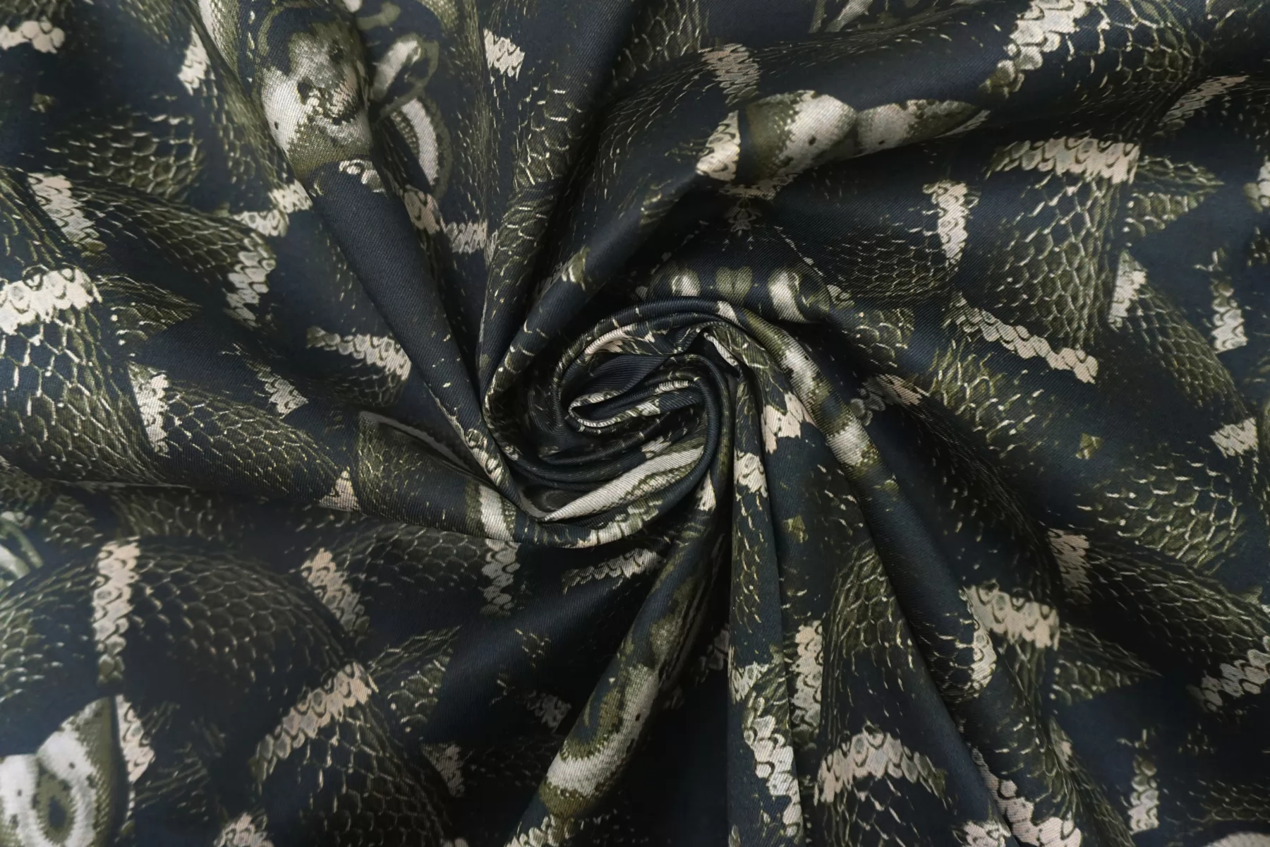 Костюмный хлопок с принтом в виде змей в чёрно-зелёно-бежевых тонах. Материал мягкий, пластичный, диагонального плетения. Отлично и упруго тянется за счет эластана. Не просвечивает. Достаточно плотный. Хорошо драпируется и держит форму. Мнется умеренно. Отличный вариант на платья, костюмы, юбки, жакеты. Подойдёт для пыльника или тренча, но учитывайте что ткань не отталкивает воду.