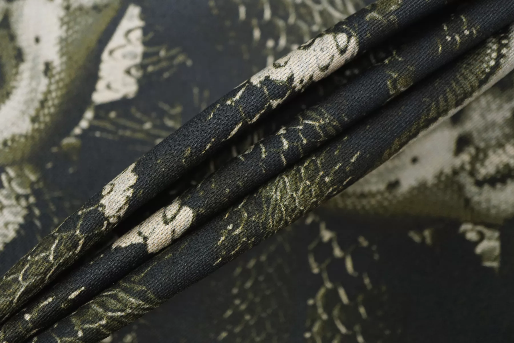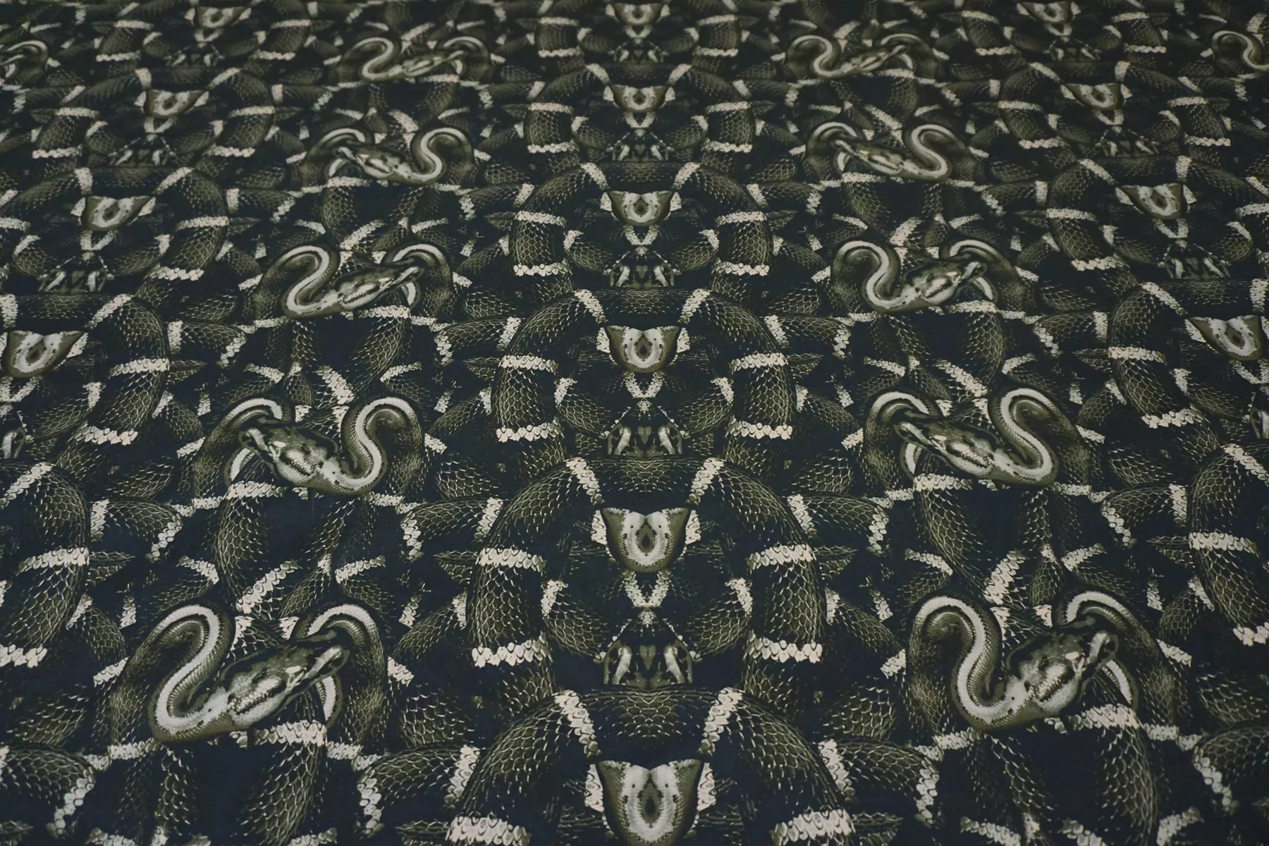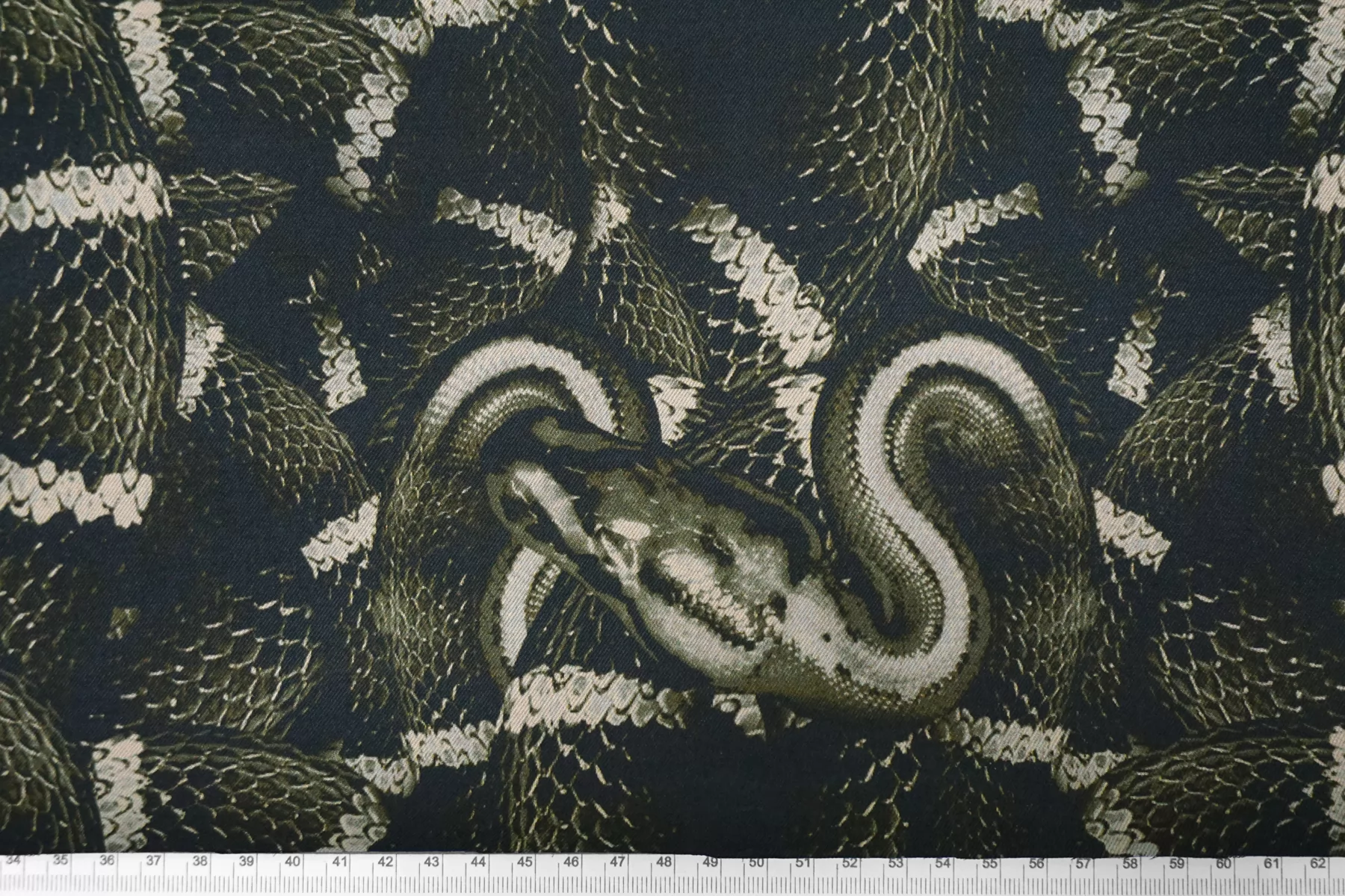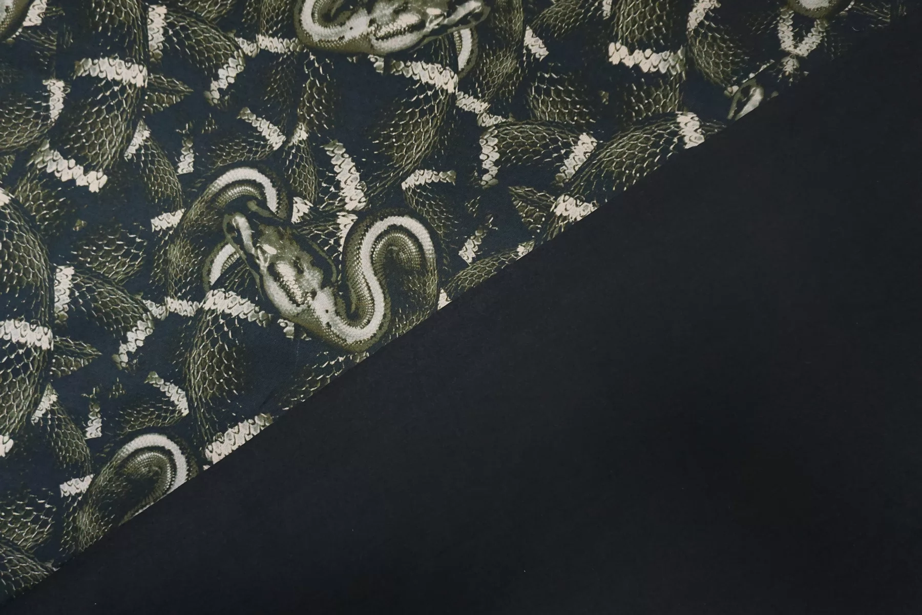 Костюмный хлопок с принтом в виде змей в чёрно-зелёно-бежевых тонах. Материал мягкий, пластичный, диагонального плетения. Отлично и упруго тянется за счет эластана. Не просвечивает. Достаточно плотный. Хорошо драпируется и держит форму. Мнется умеренно. Отличный вариант на платья, костюмы, юбки, жакеты. Подойдёт для пыльника или тренча, но учитывайте что ткань не отталкивает воду.