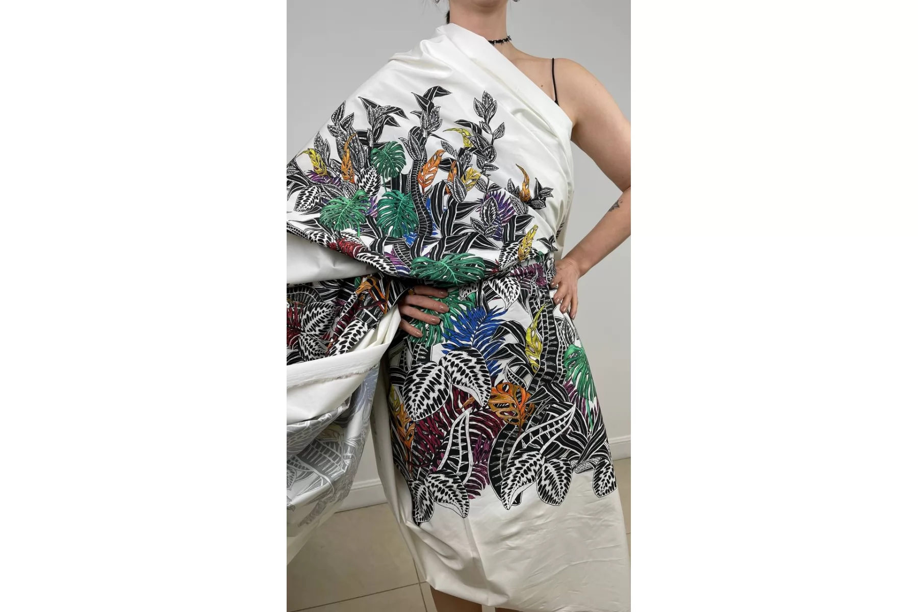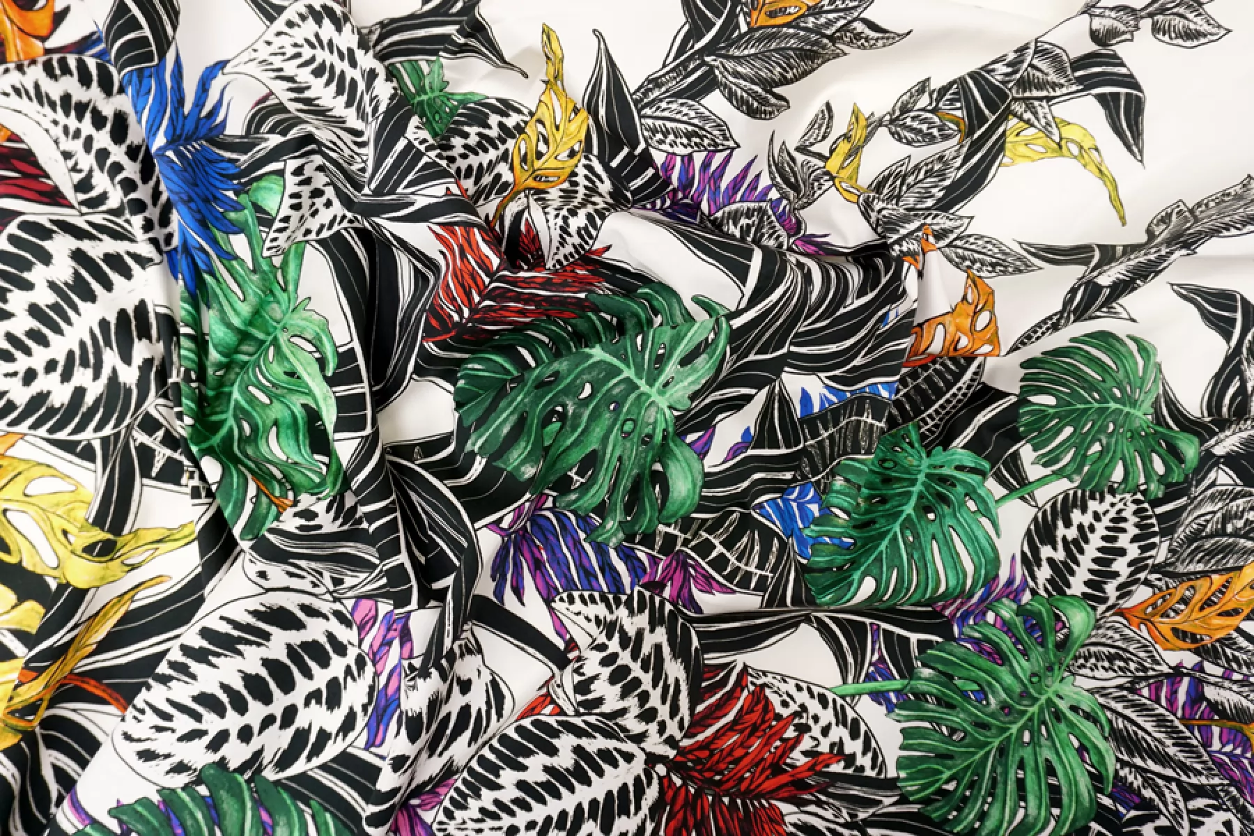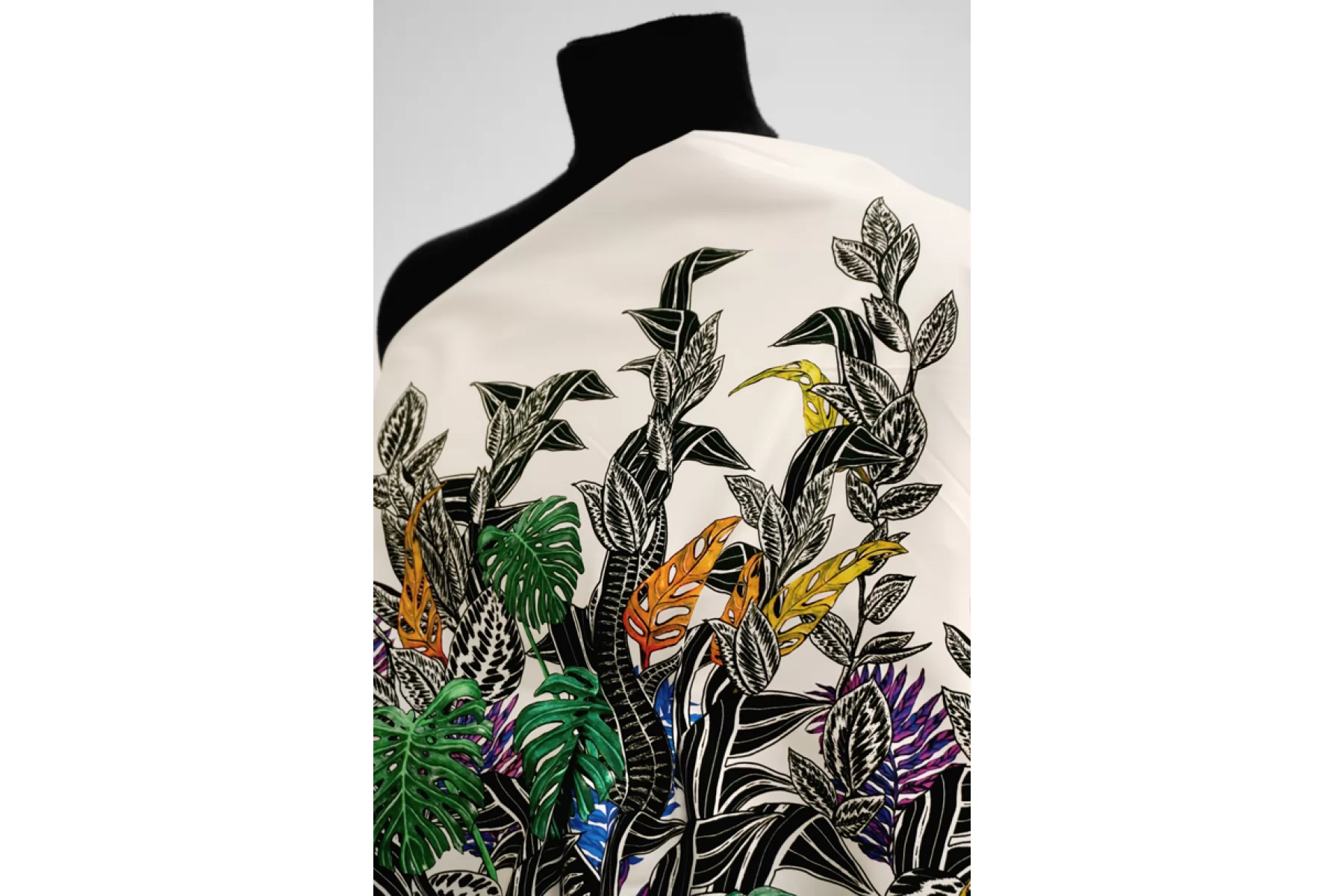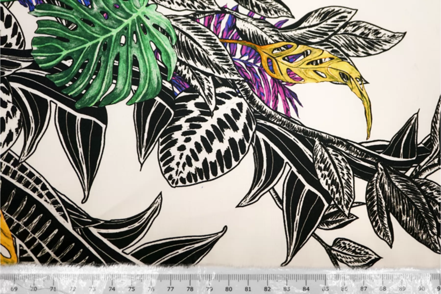 Хлопок стрейч диагонального плетения молочного цвета с каймовым принтом в виде листьев черных, зеленых, фиолетовых, желтых, оранжевых и красных. У принта есть повторение узора каждые 134 см, ткань режется кратно купону! Цена за купон 2572,8 руб. ! На ткани есть серые пятна, отстирываются! Гладкий наощупь, чувствуется плетение. Хорошо тянется. Держит форму. Не просвечивает. Идеально подойдет на брюки, платья, юбки, жакеты. Учитывайте усадку.