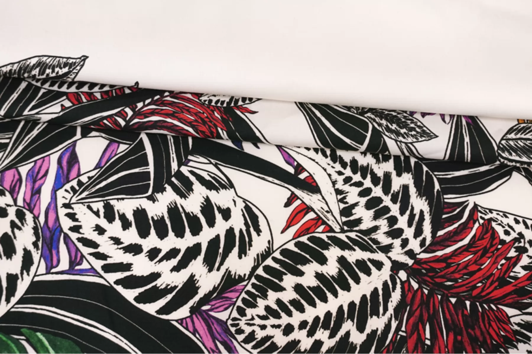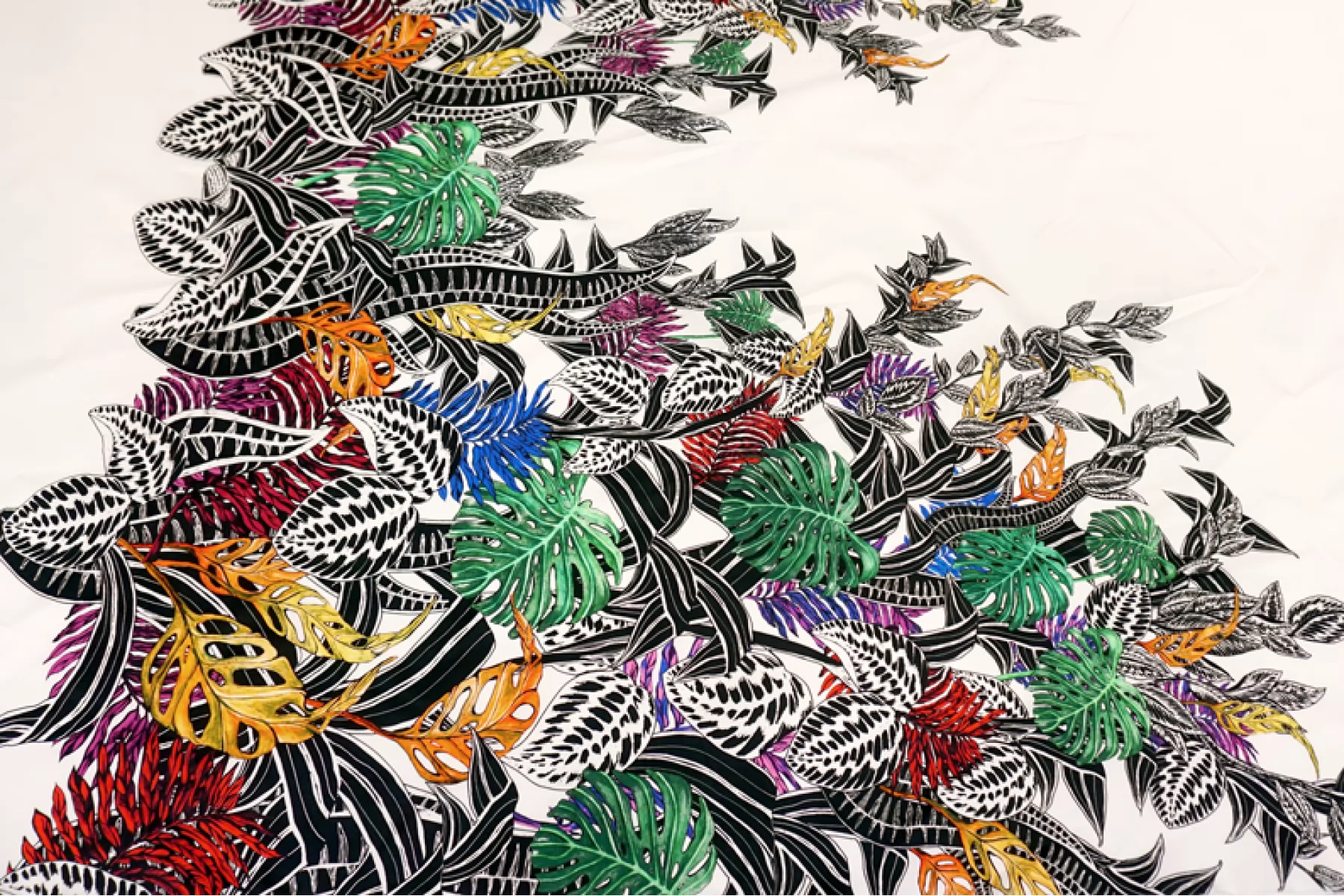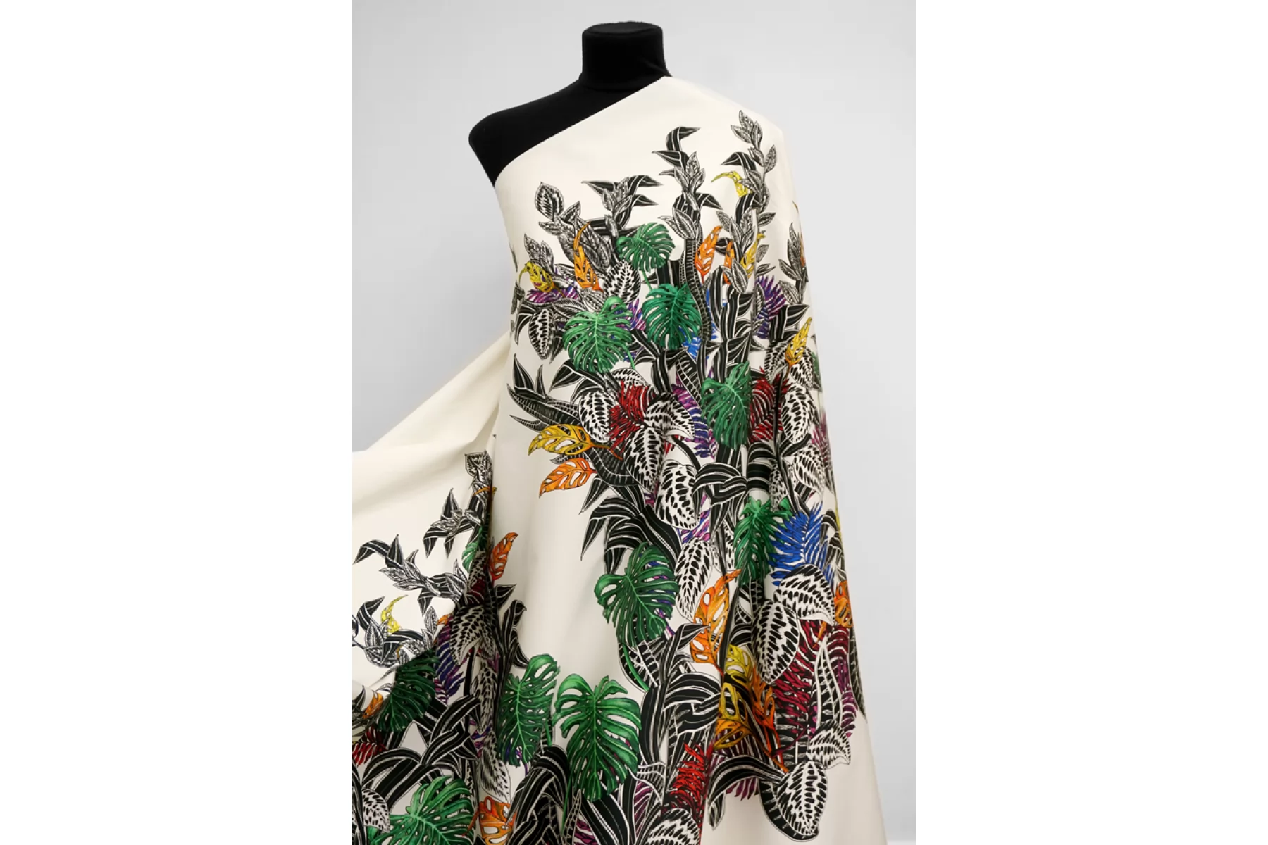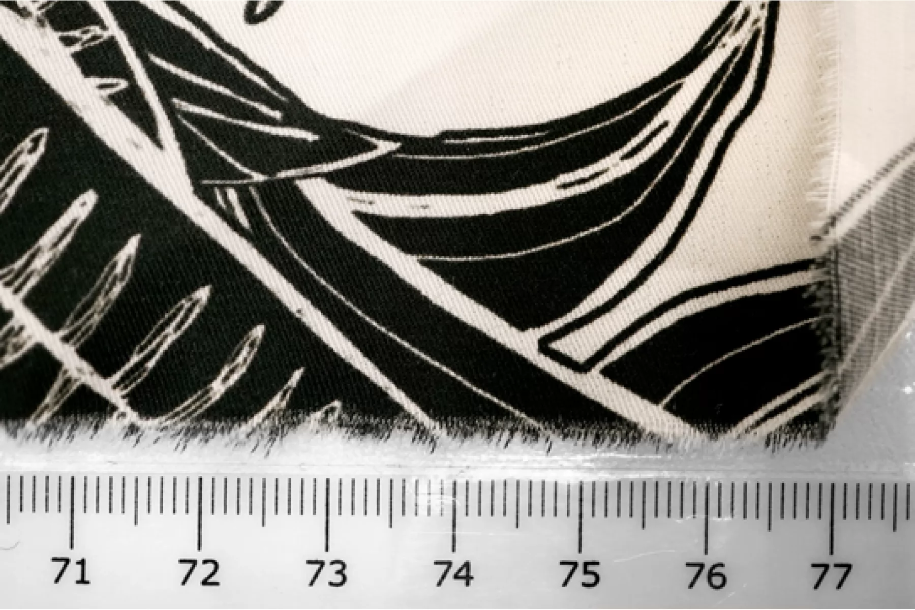 Хлопок стрейч диагонального плетения молочного цвета с каймовым принтом в виде листьев черных, зеленых, фиолетовых, желтых, оранжевых и красных. У принта есть повторение узора каждые 134 см, ткань режется кратно купону! Цена за купон 2572,8 руб. ! На ткани есть серые пятна, отстирываются! Гладкий наощупь, чувствуется плетение. Хорошо тянется. Держит форму. Не просвечивает. Идеально подойдет на брюки, платья, юбки, жакеты. Учитывайте усадку.