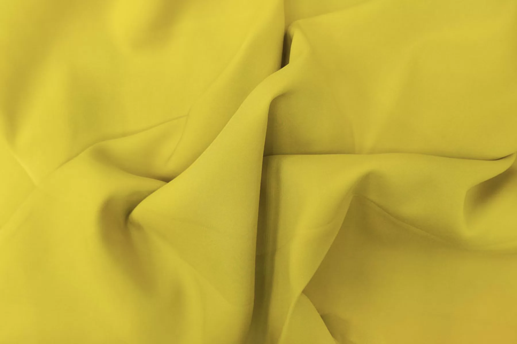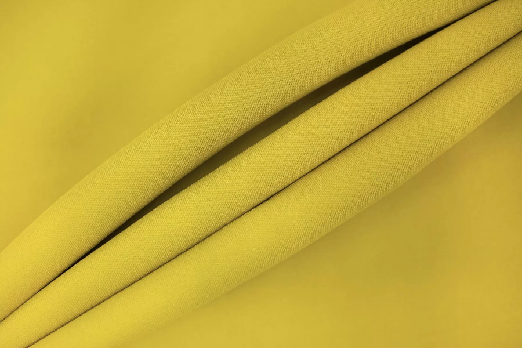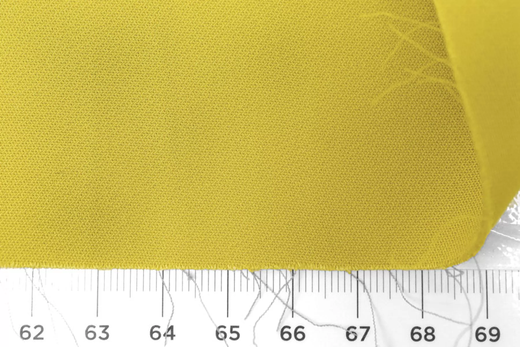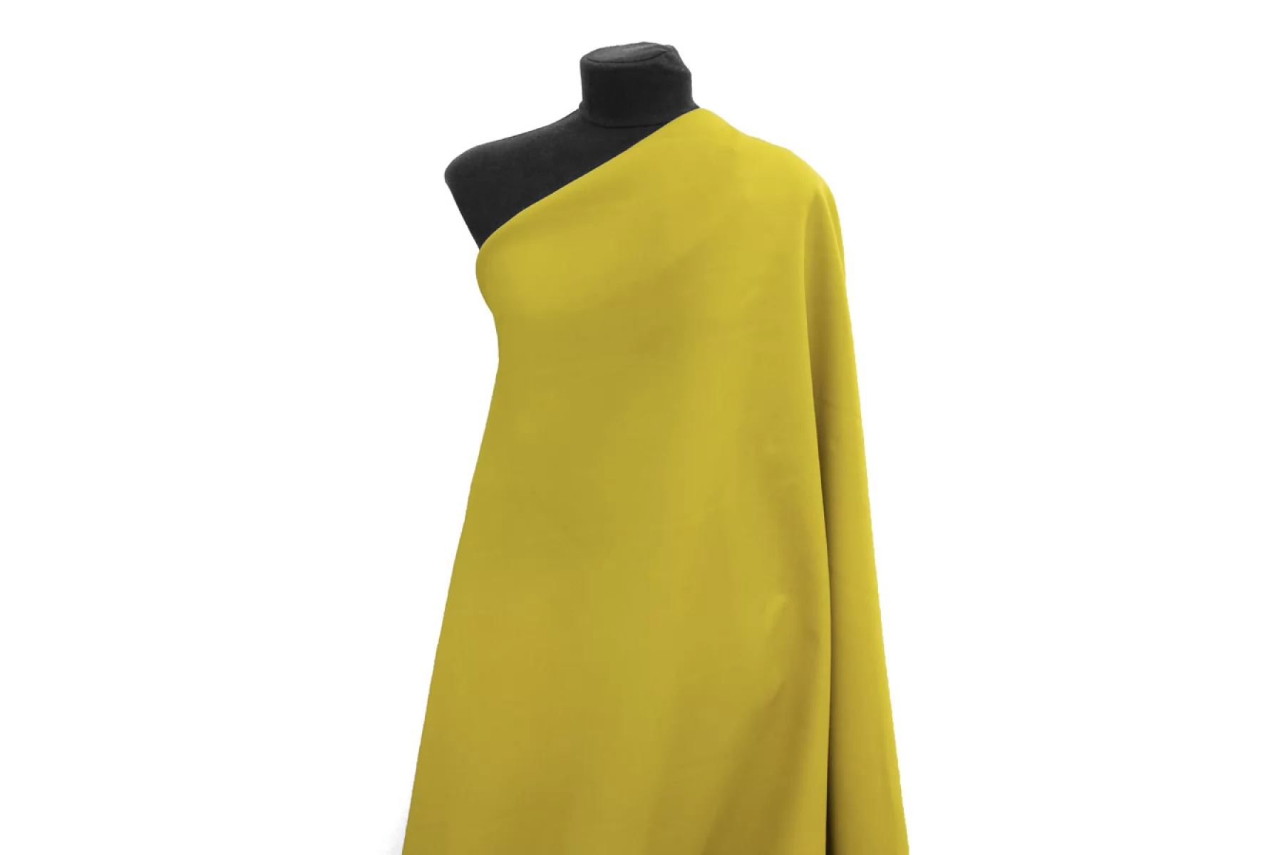 Итальянская вискоза-кади от Tom Ford, двухслойная, двусторонняя в насыщенном горчично-желтом цвете. Обе стороны выполнены с одинаковым плетением, слои соединены клеевым методом, разделяются без повреждения. По пластике напоминает неопрен, держит форму, образовывает объемные складки, не просвечивает, тянется. Подойдет на платье, жакет, нестандартный бомбер, юбку или брюки (подумайте над формой, это будет что-то не классическое).