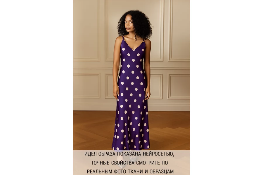 Двусторонняя вискоза атлас-кади в сливовом оттенке в очень крупный бежевый горох. Материал скользящий, приятный наощупь с красивым матовым блеском - с одной стороны, с другой стороны шероховатый. Не тянется. не просвечивает. Практически не мнется. Красиво струится и смотрится в складке и пластике. Прекрасный вариант на платья, юбки, блузки и одежду в бельевом стиле. При необходимости используйте подкладочный материал. Обязательно учитывайте усадку 5-10%. Изделия из данного материала рекомендуем шить тонкими иглами.