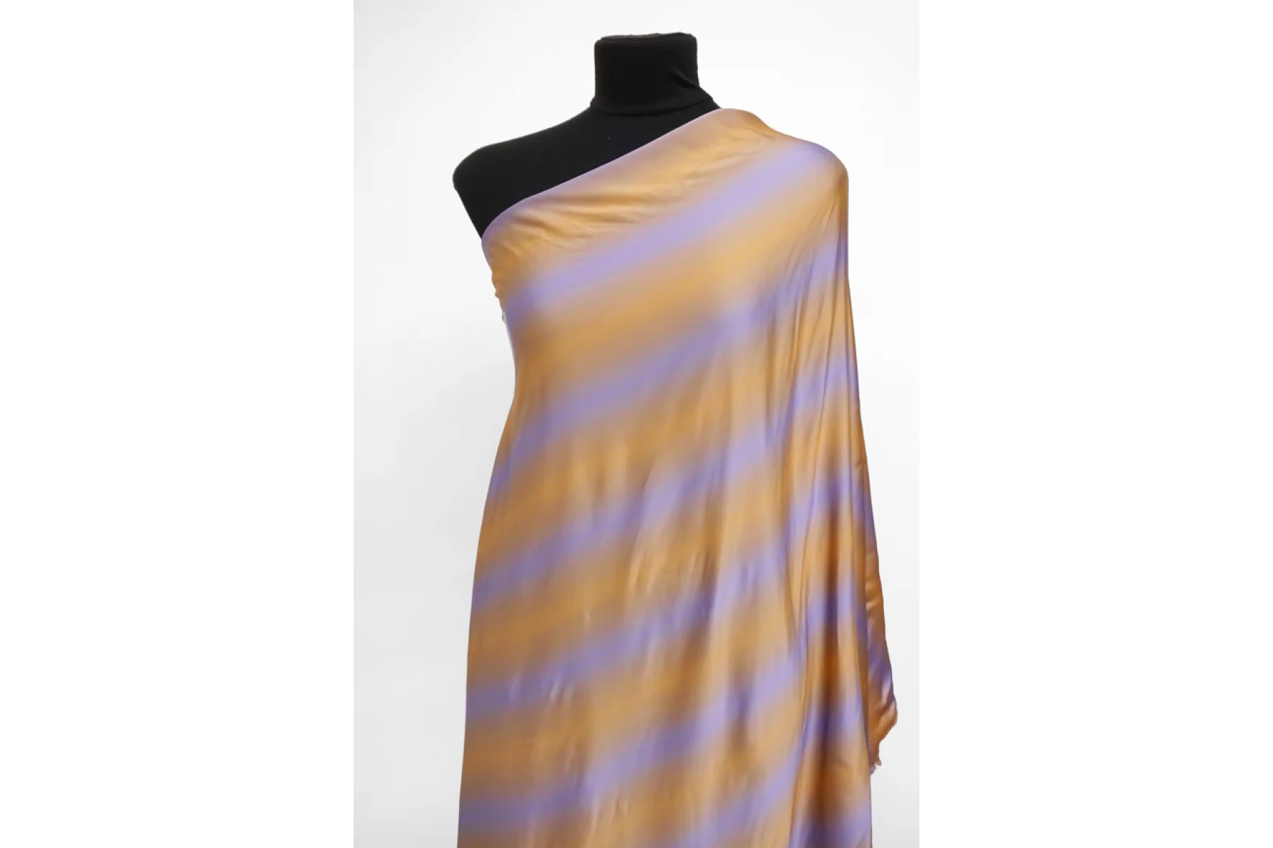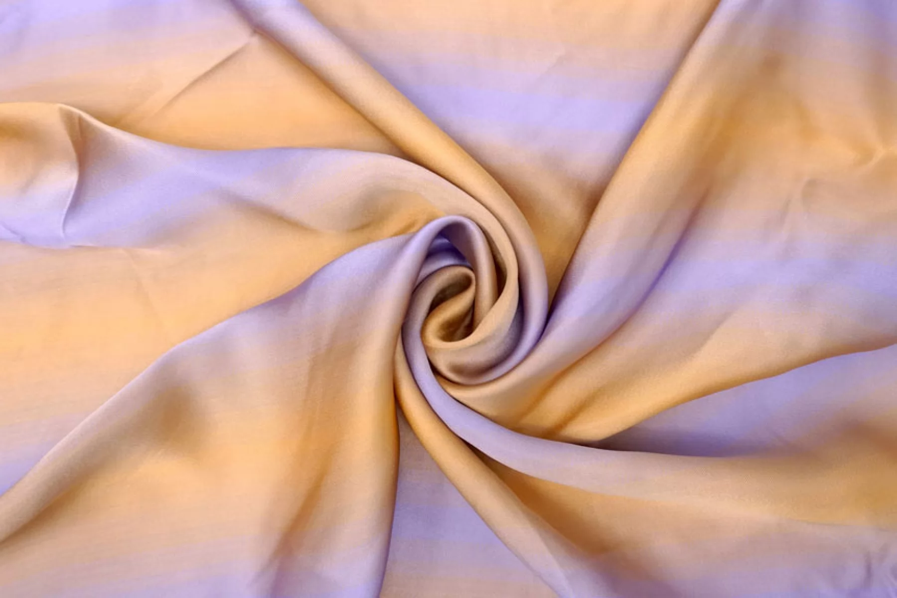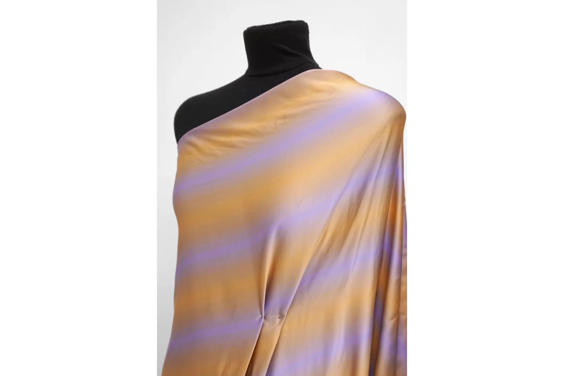 Очень красивая кади из вискозы с принтом деграде оттенков сиренево-лилового и песочно-золотистого. Приятная, скользящая, гладкая, мягкая, пластичная. Обладает красивым лоском. Плотная и тяжеленькая. Слегка сминается. Не просвечивает. Форму держит слабо. Хороша в пластике. Прекрасный вариант на платья, юбки, кимоно и мягкие жакеты, а также костюмы в пижамном стиле. Обязательно учитывайте усадку 5-10% .