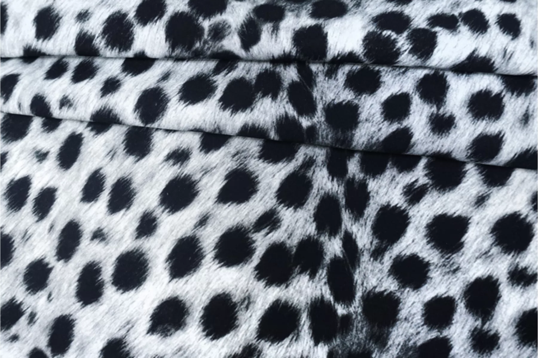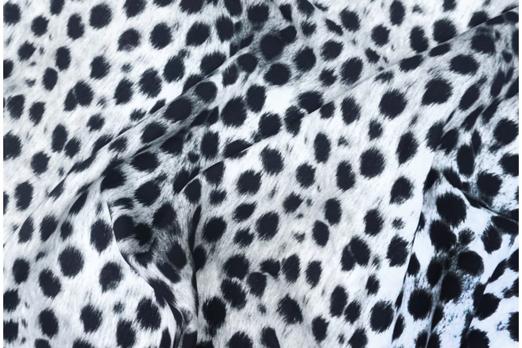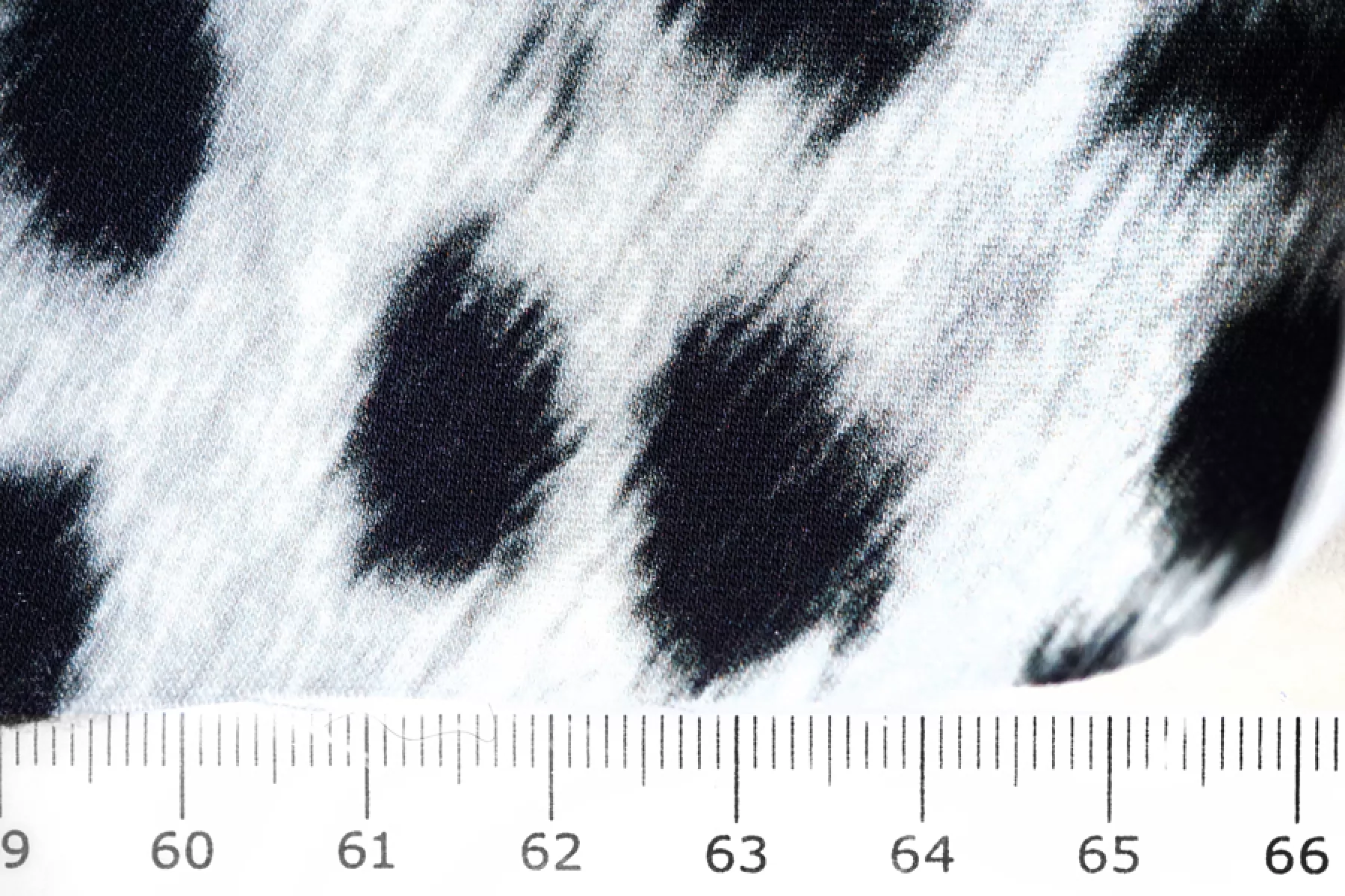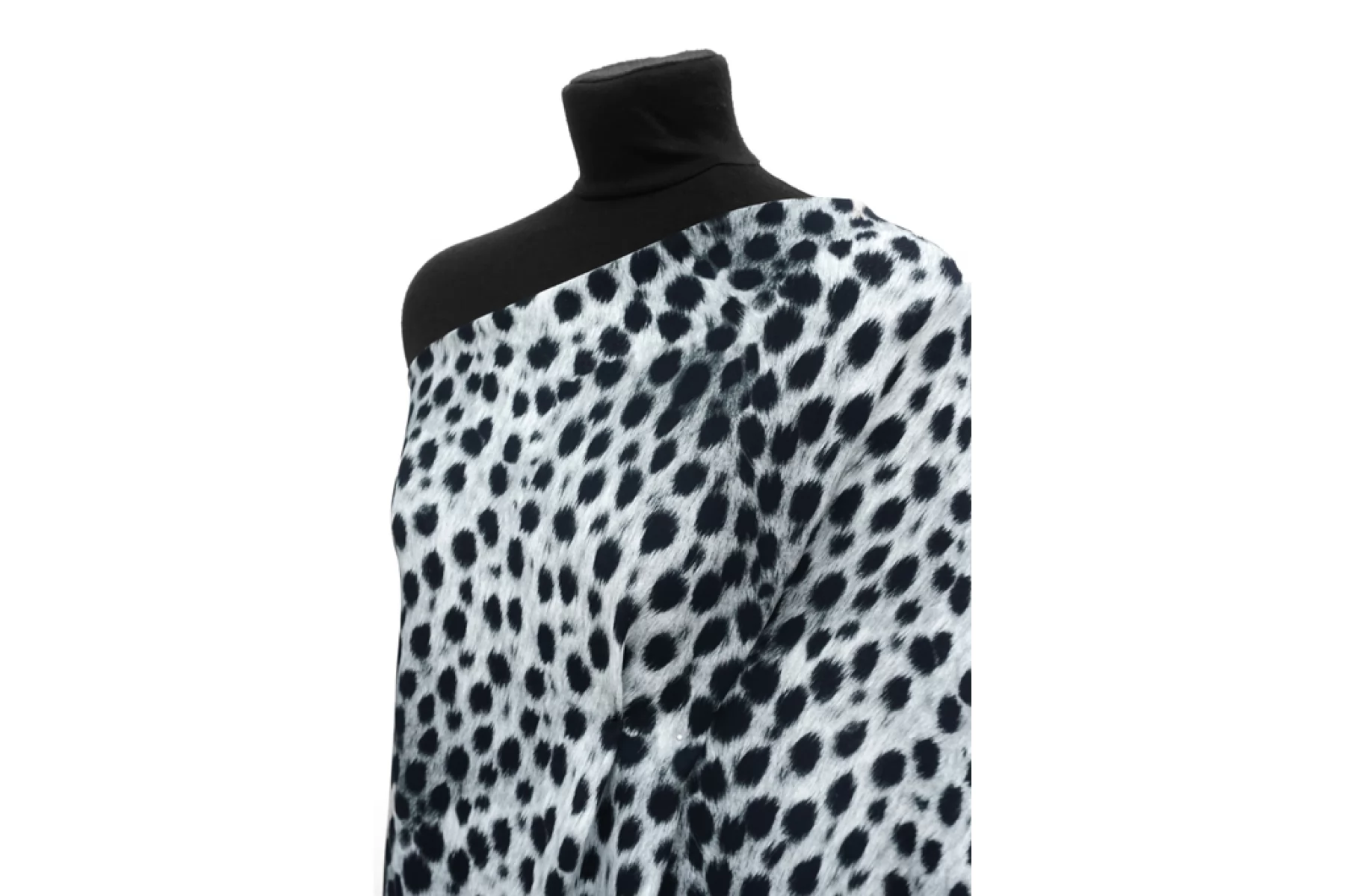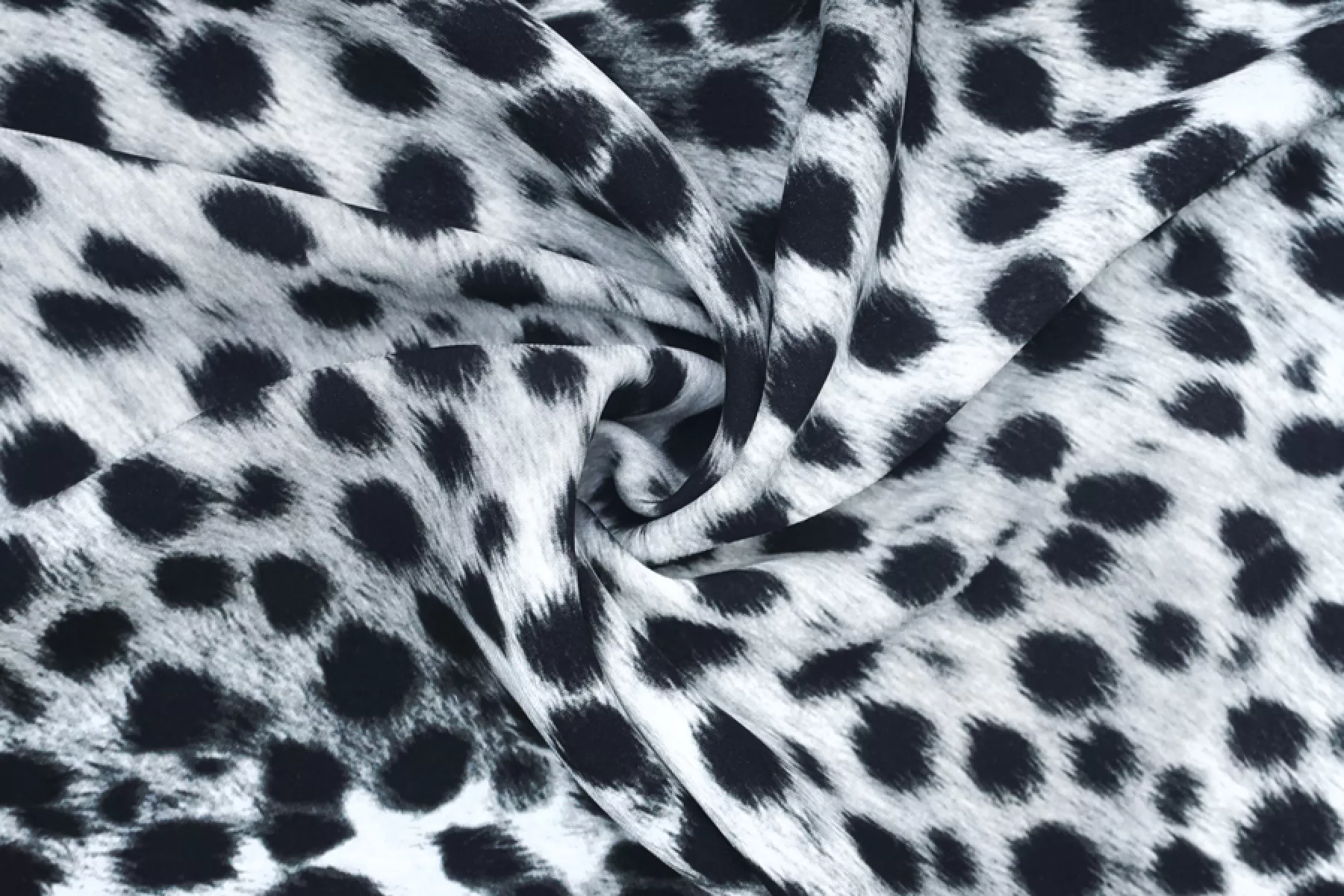 Очень интересная позиция - кади вискоза с анималистичным принтом серого цвета с черными пятнами под барса. С лицевой стороны плетение креповое - шероховатое. Материал плотный, не просвечивает. Слабо держит форму. Тянется благодаря эластану. Не мнется. Вариант на платье, брюки, юбки, рубашки. Обязательно учитывайте усадку 5-10%. Обратите внимание на ширину.