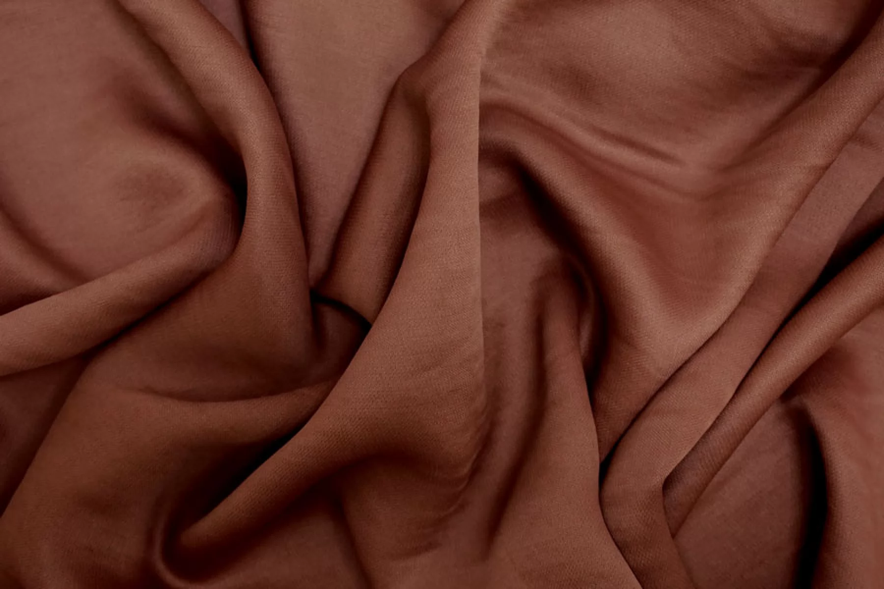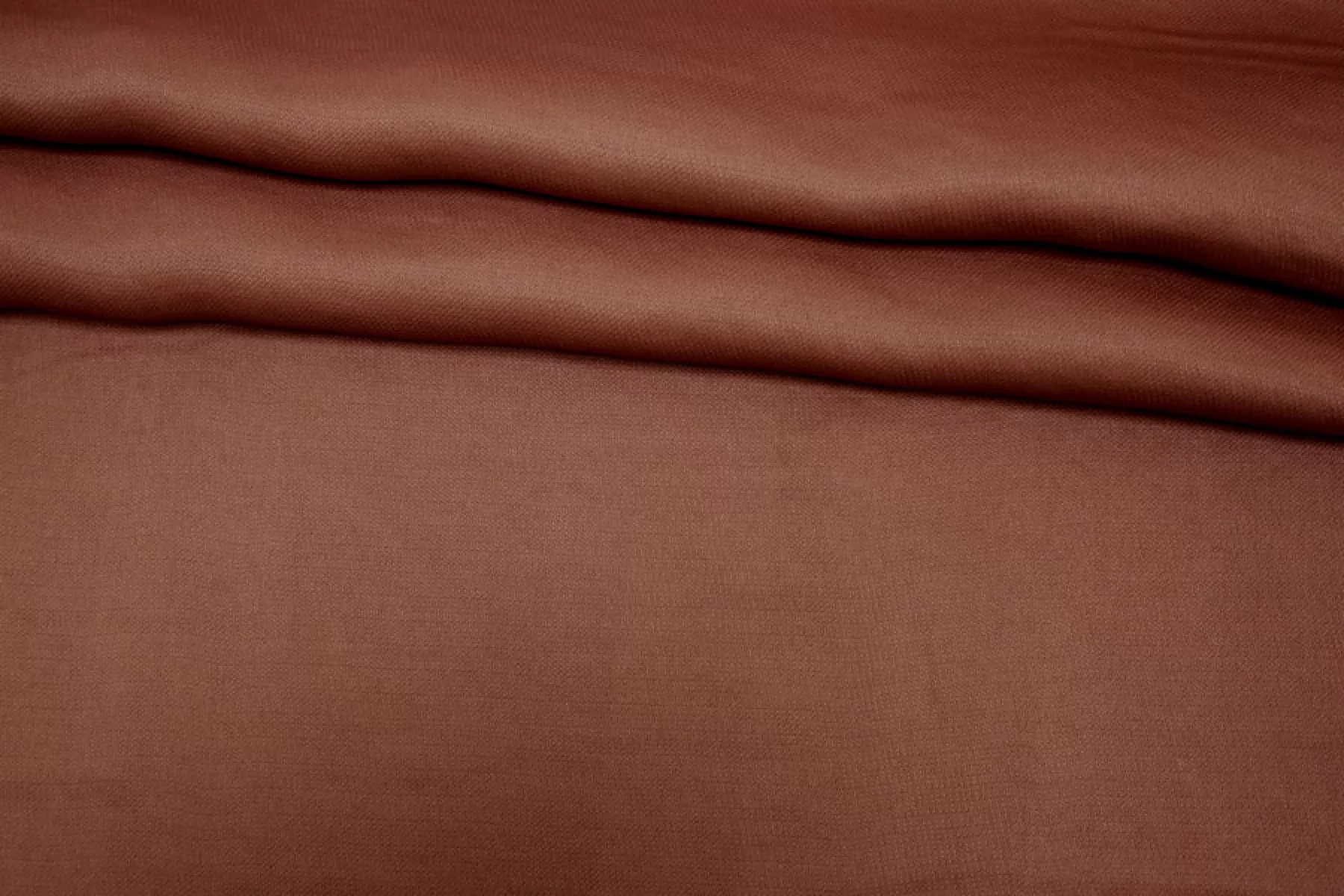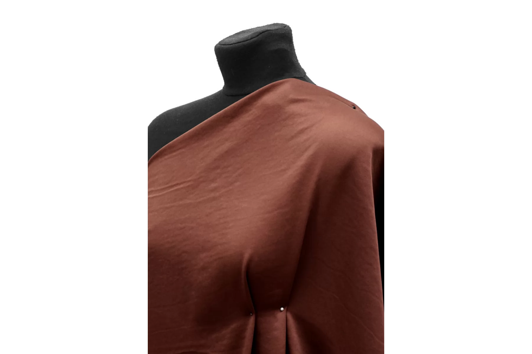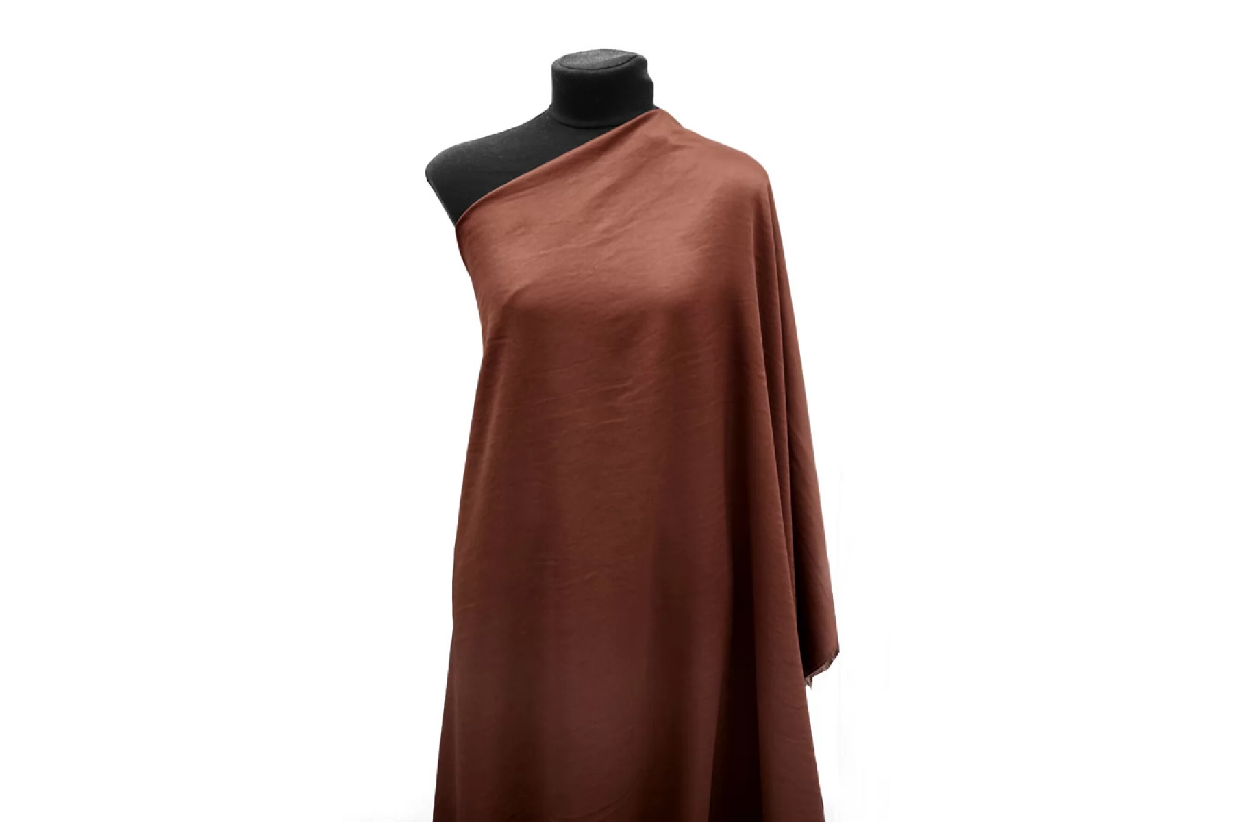 Прекрасная вискозная кади в сложном, неярком коричневом цвете с розовым подтоном. Материал пластичный, мягкий. Смотрится элегантно. У материала две стороны- одна креповая - шероховатая, другая - атласная - гладкая с нежным блеском. Не тянется, но слегка пружинит за счет плетения. Форму не держит, но красиво смотрится в складках и движении, ниспадает. Мнется слабо. Не просвечивает. Отличный вариант на платья, юбки, брюки, кимоно и одежду в пижамном стиле. Обязательно учитывайте возможную усадку 5-10%
