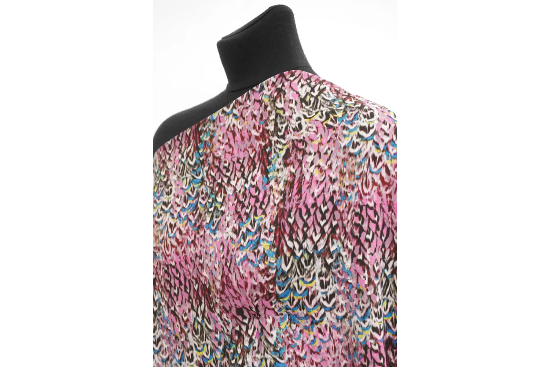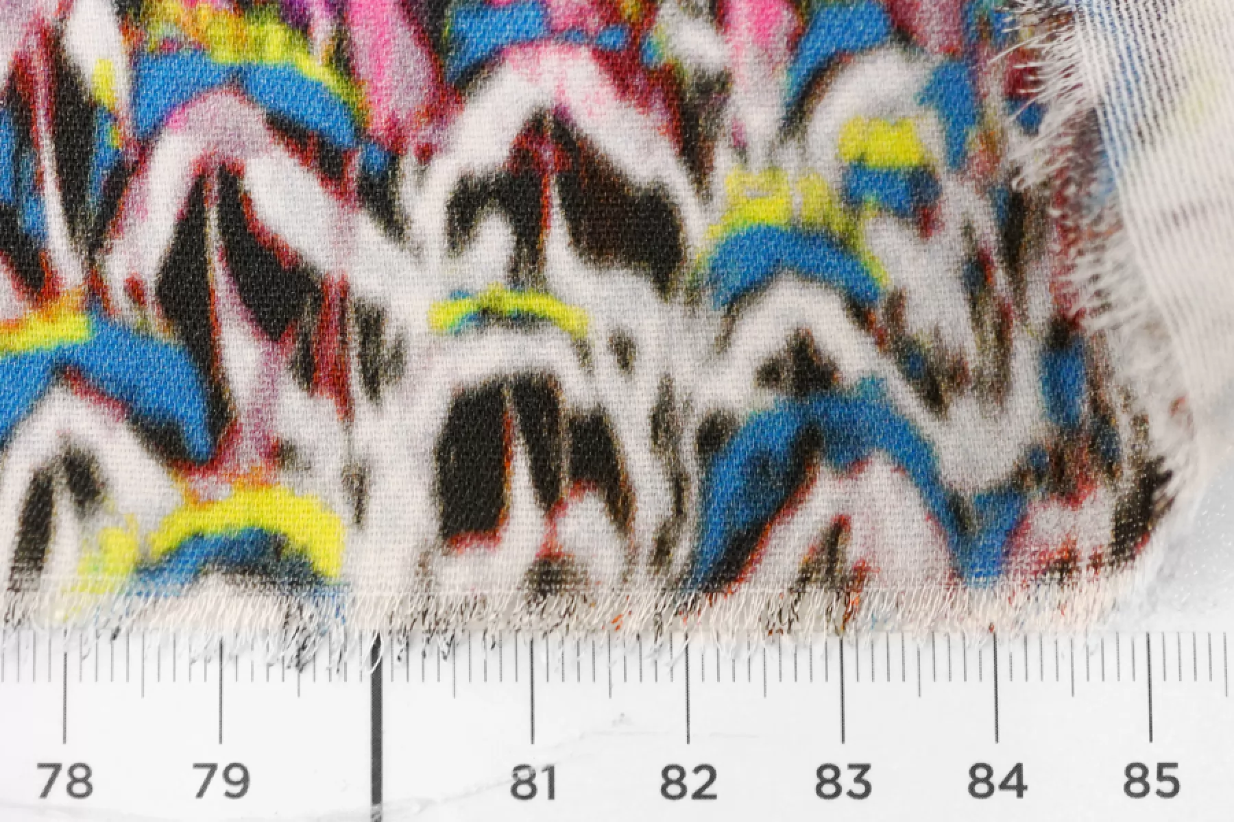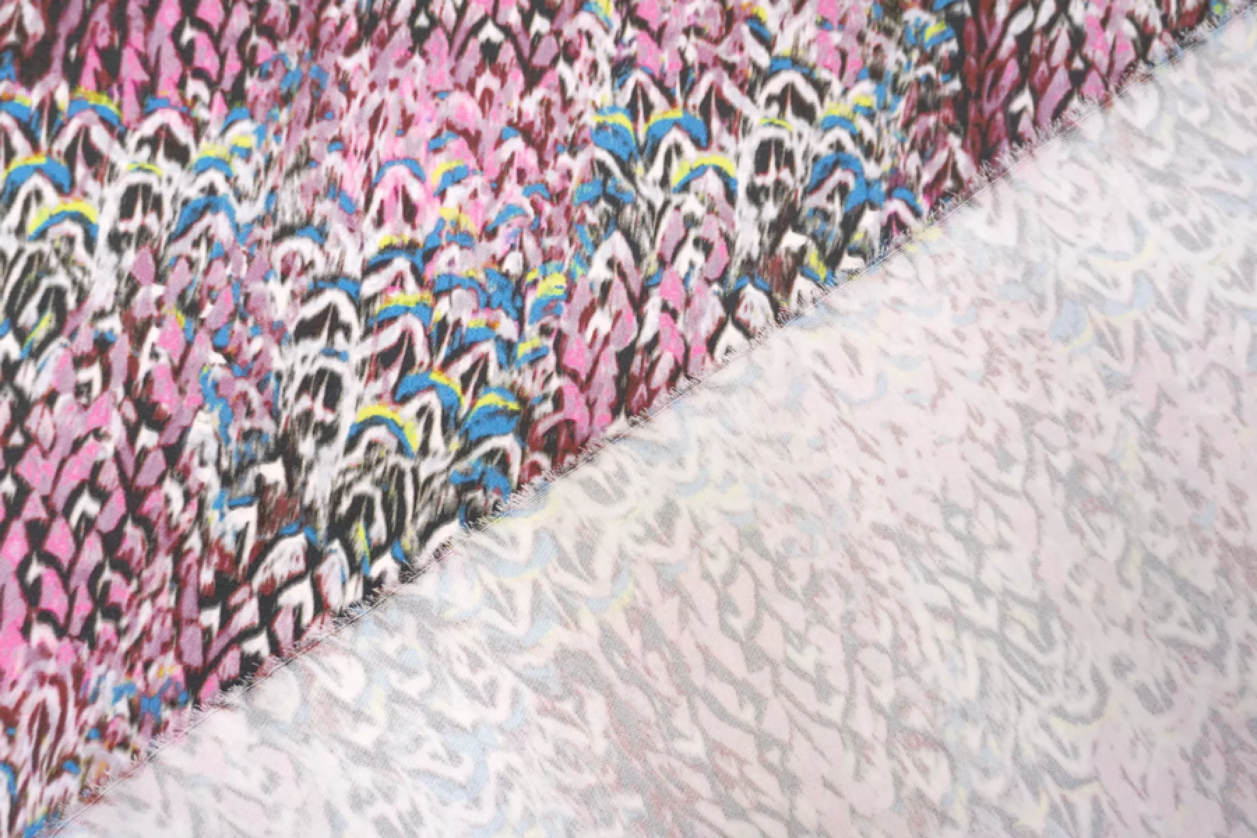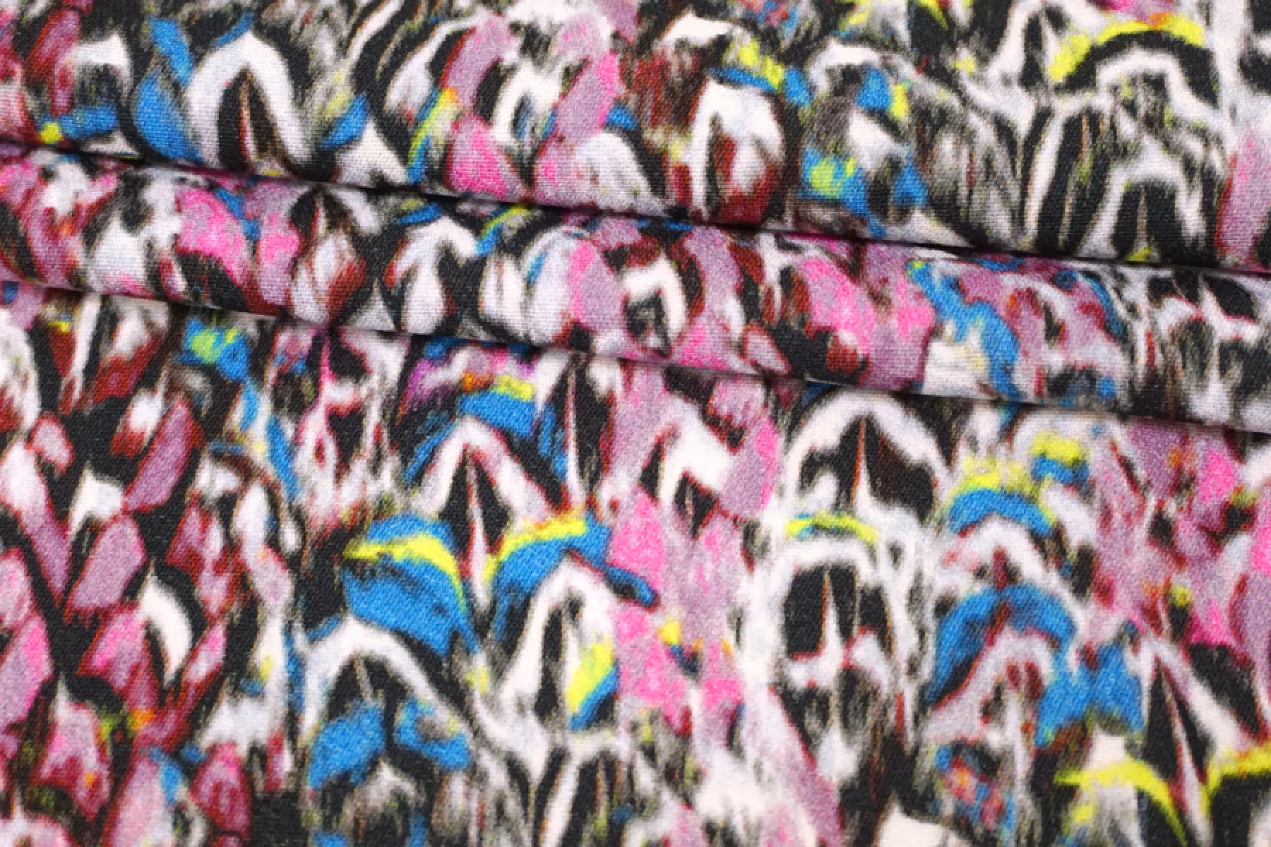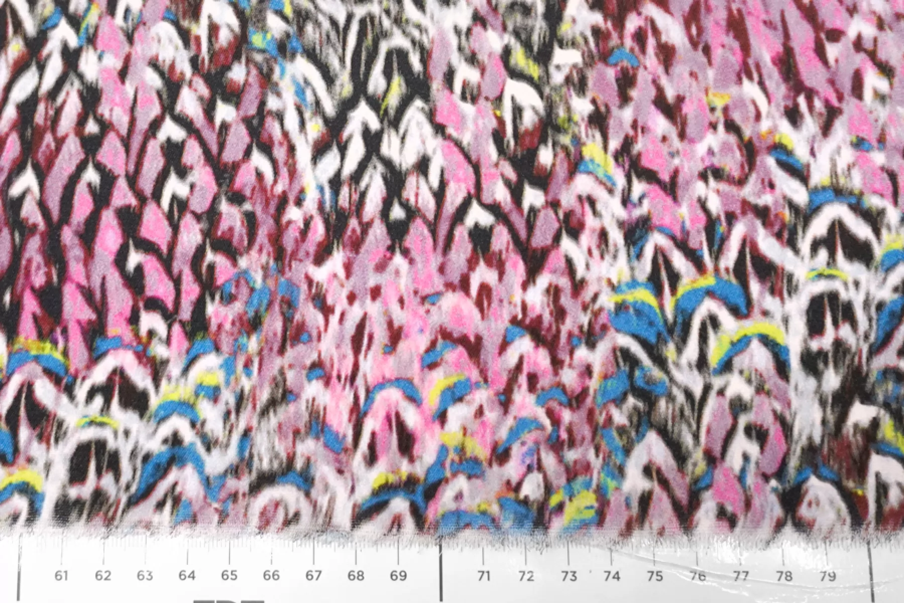 Вискозная кади от Escada с принтом в фиолетовых тонах. Плетение слегка шероховатое. Красива в пластике и хорошо пружинит за счет эластана и плетения. Не просвечивает. Слегка мнется. Отличный вариант на платья, юбки. Обязательно учитывайте усадку 5-10% .