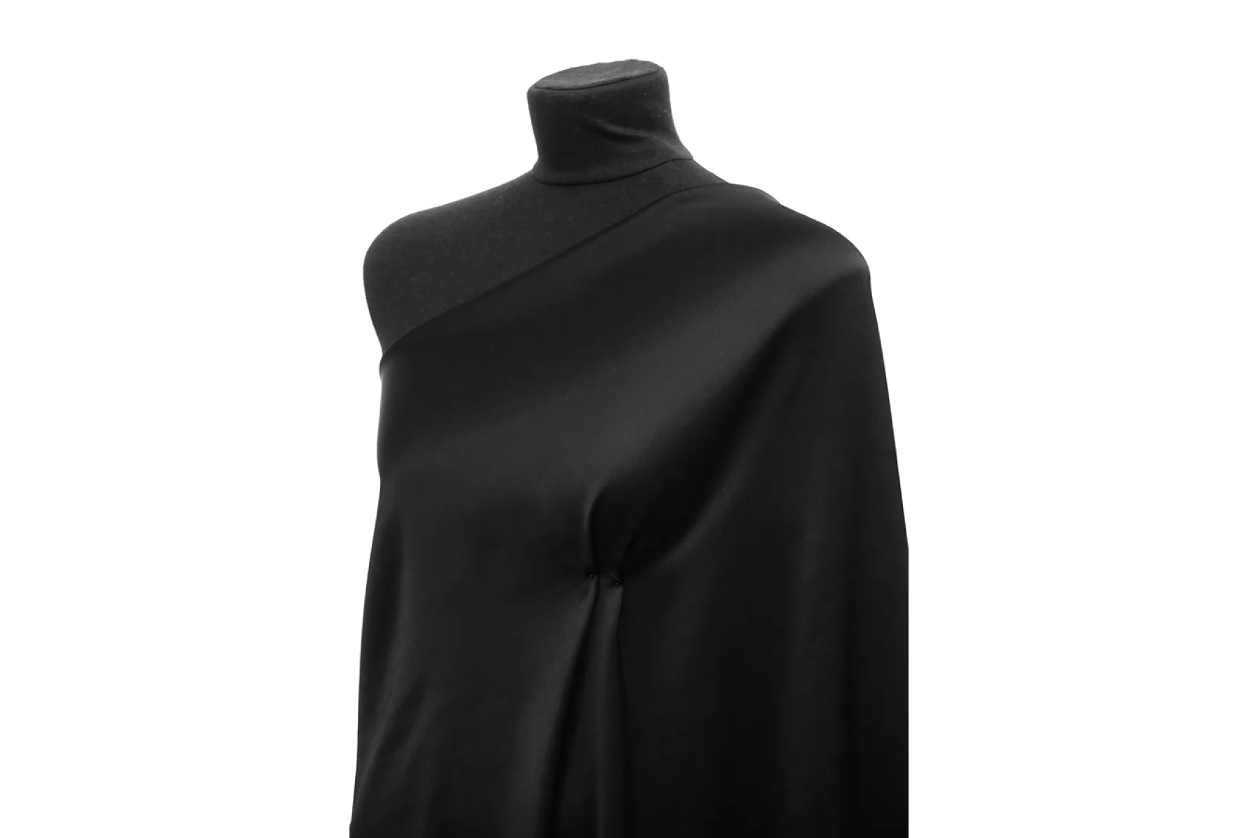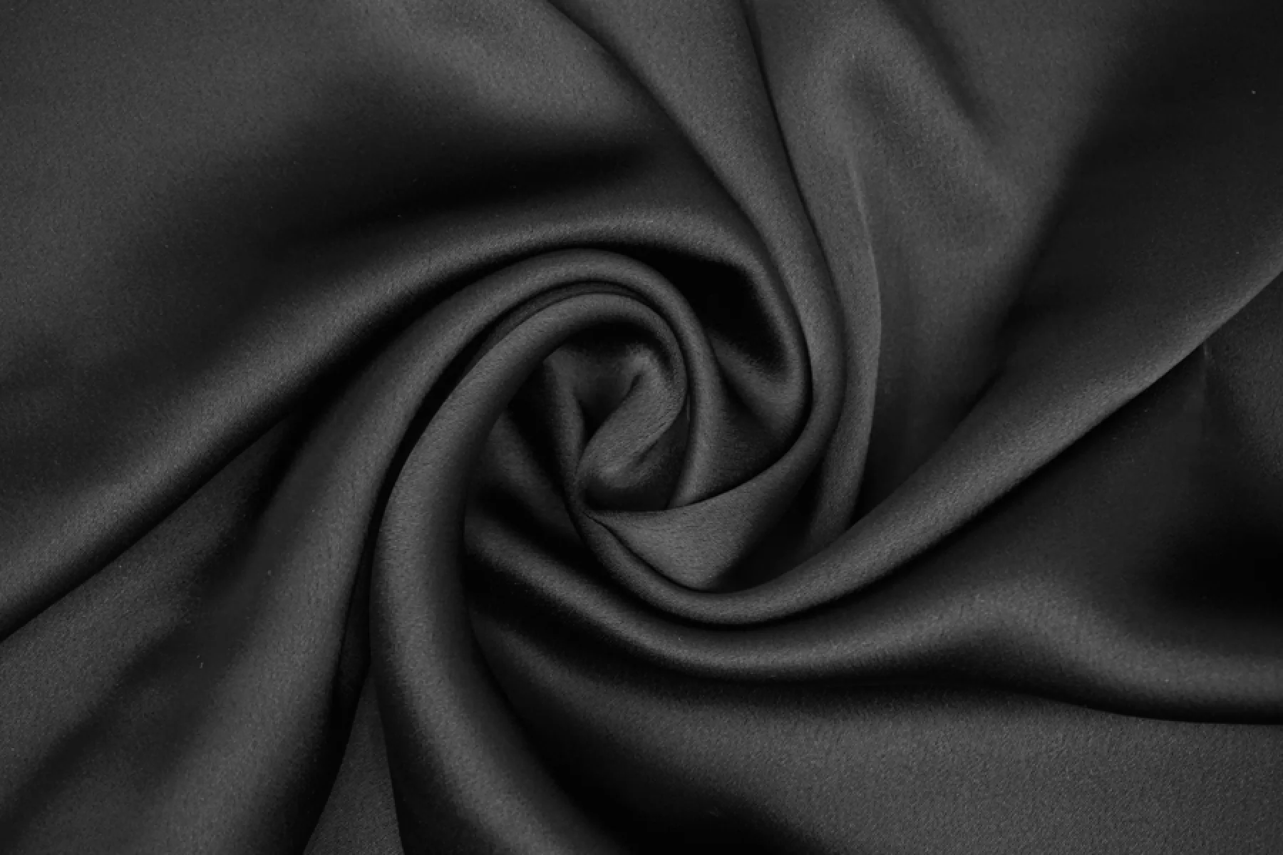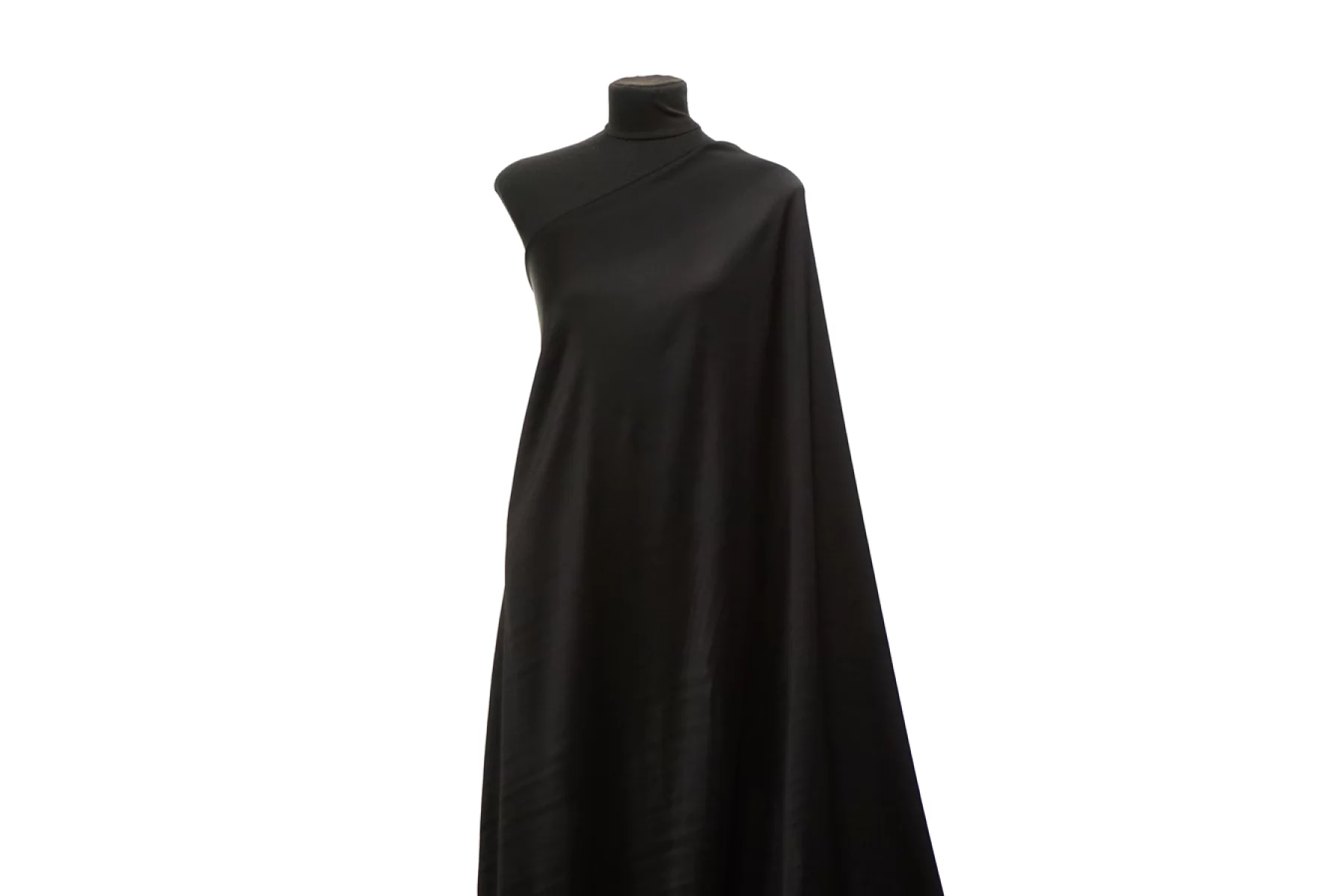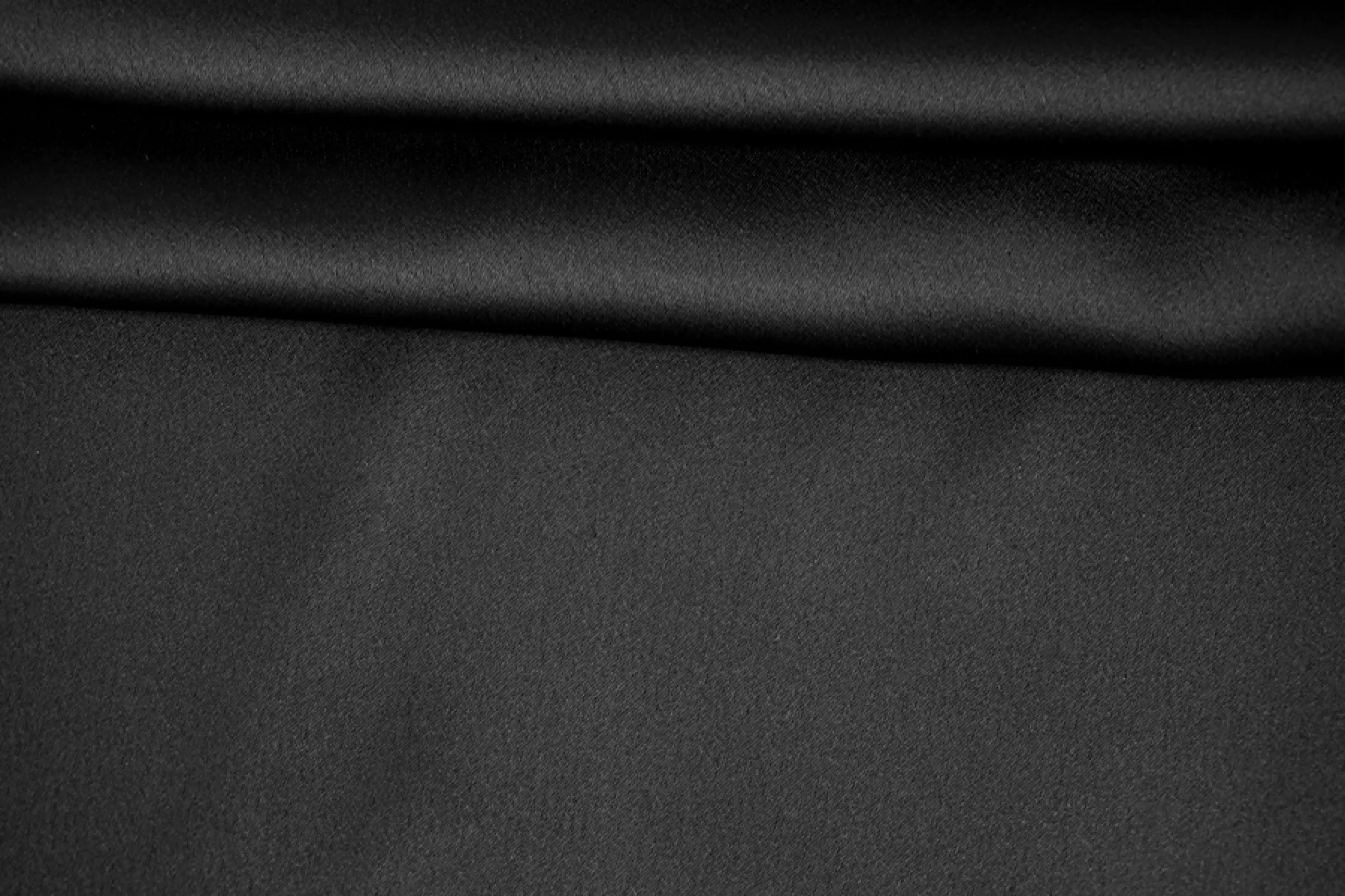 Внимание!! ВСТРЕЧАЮТСЯ ПОЛОСЫ КАЖДЫЕ 45СМ и пятна. Рабочая ширина 125 см! Плательно-блузочная вискозная кади черного оттенка. Тактильно очень приятная и мягкая, пластичная, лицевая сторона гладкая, обратная -шероховатая. Легкая, струящаяся. Обладает красивым лоском. Не тянется, но слегка пружинит за счет плетения. Не просвечивает, но если смотреть на просвет слегка заметен силуэт. Несильно сминается. Красиво смотрится в складке и движении. Форму практически не держит. Шьем платье, блузки, юбку, одежду в пижамном стиле. Обязательно учитывайте усадку порядка 5-10%