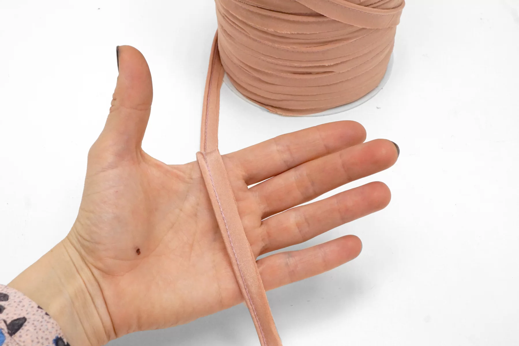 Кант отделочный атласный в розовом оттенке. Применяется для декорирования и укрепления отделочных швов. Ширина 1,2 см.