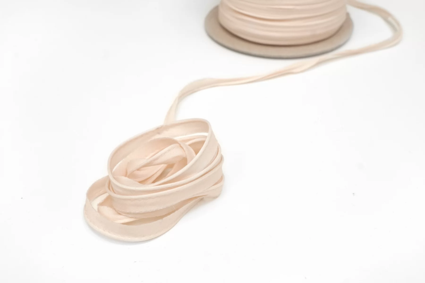 Кант отделочный атласный нежного кремового оттенка из ацетата. Применяется для декорирования и укрепления отделочных швов. Ширина 0,8 см.