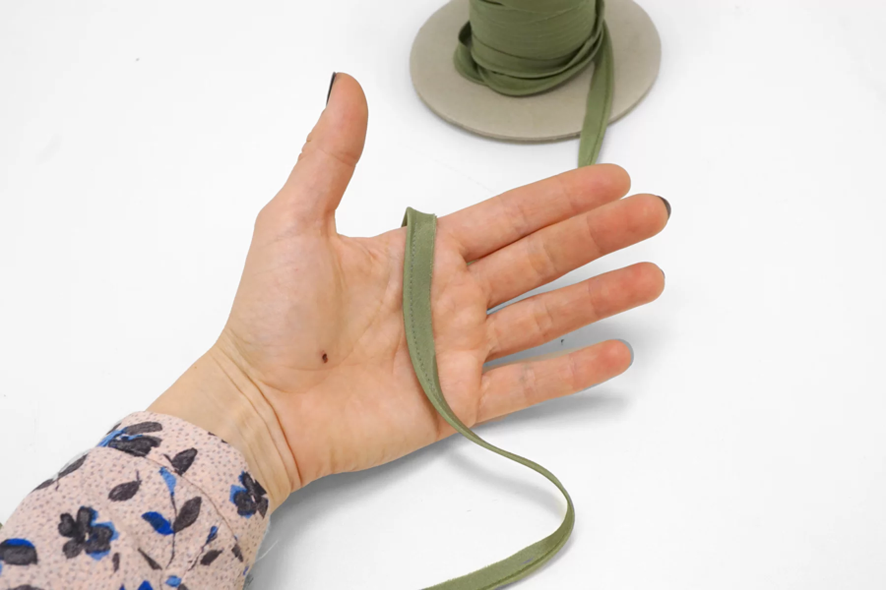 Кант отделочный атласный в оливковом оттенке . Применяется для декорирования и укрепления отделочных швов. Ширина 1 см.