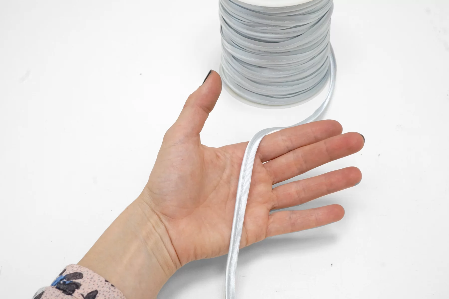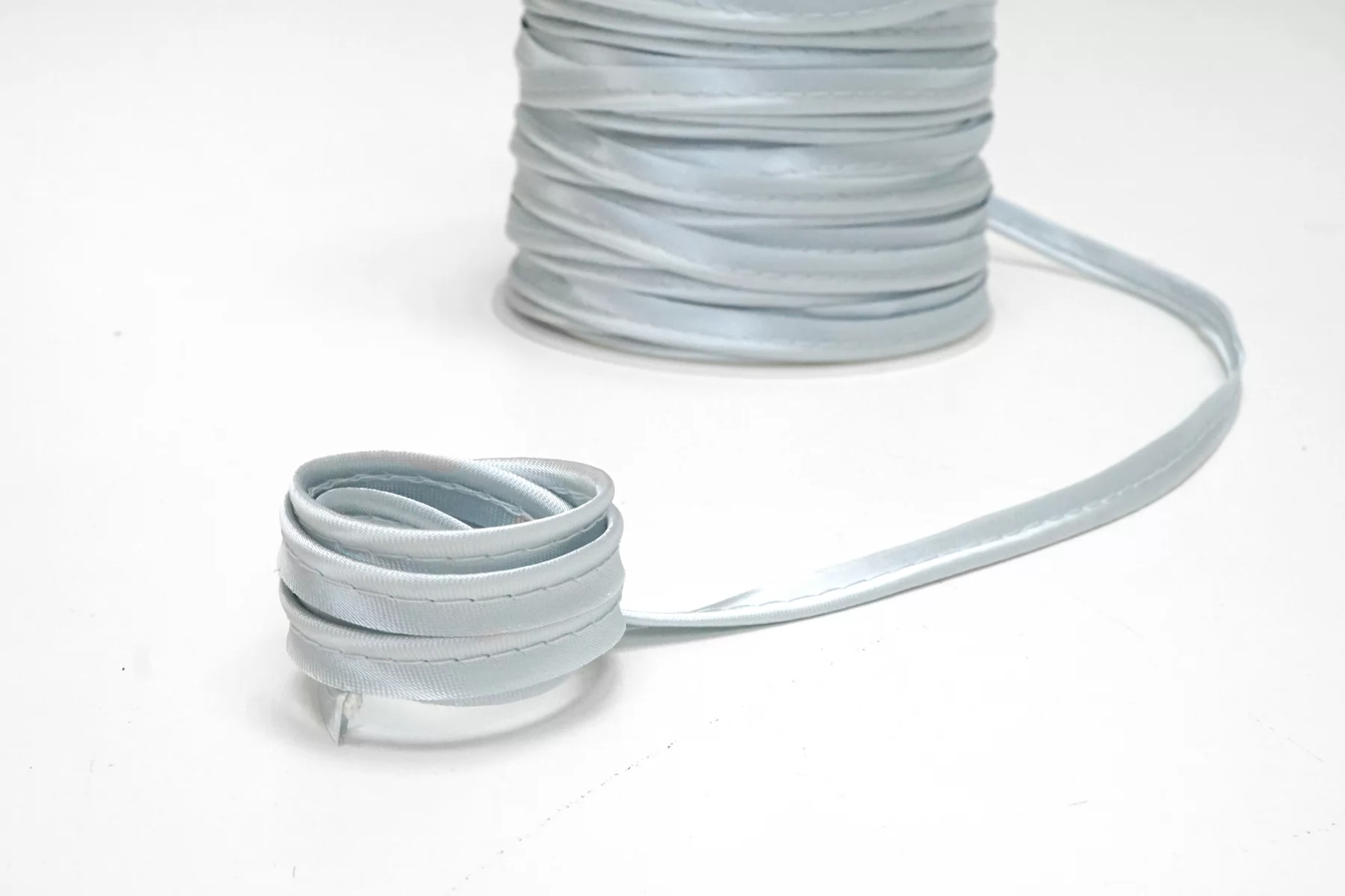 Кант отделочный атласный в светло-голубом оттенке . Применяется для декорирования и укрепления отделочных швов. Ширина 1 см.