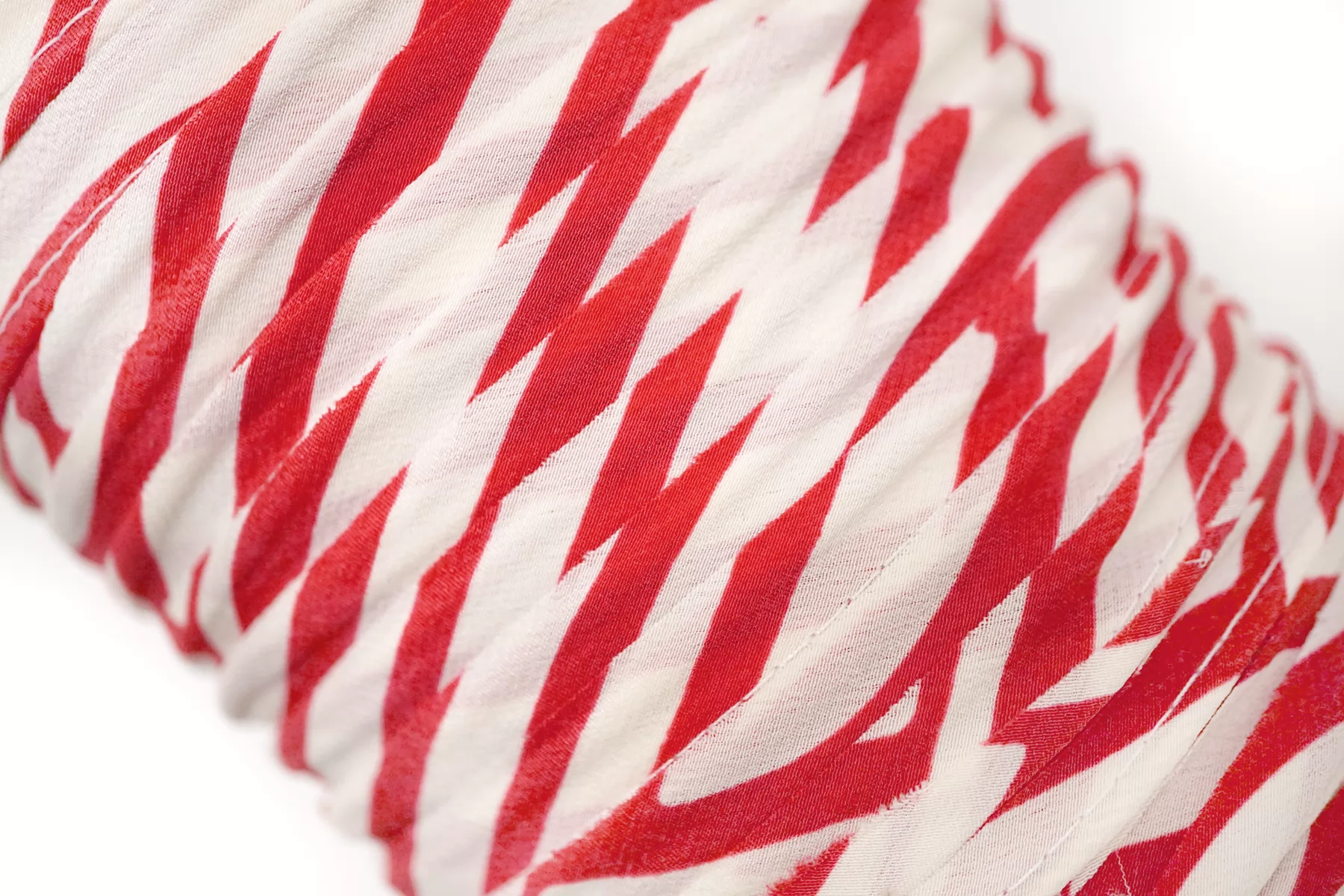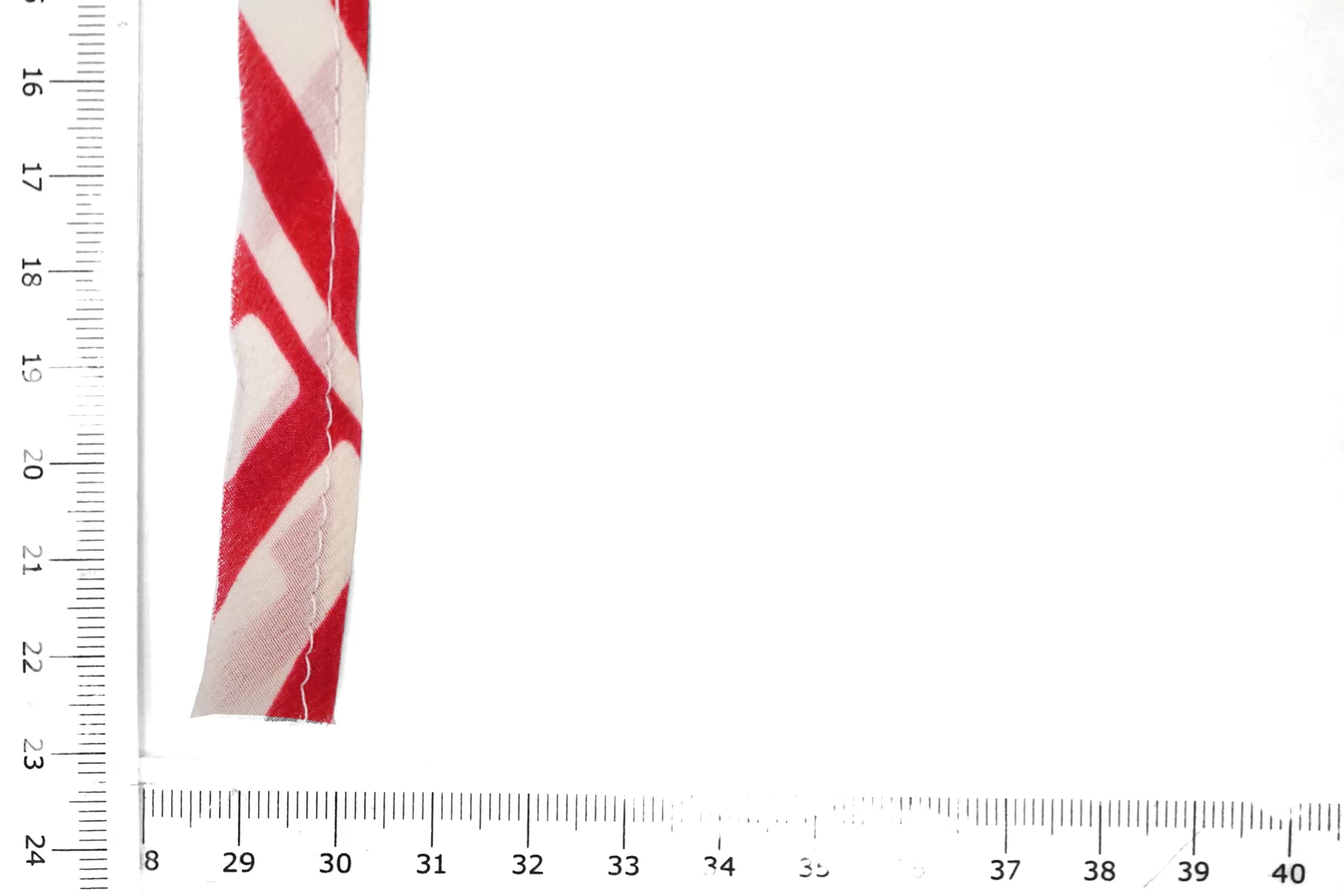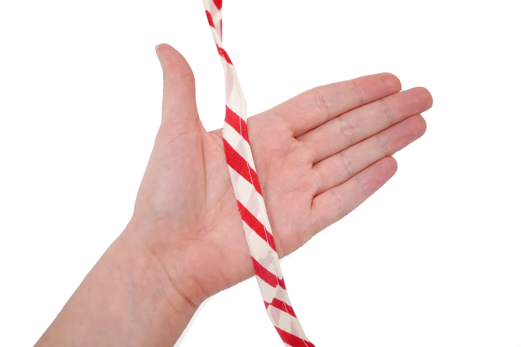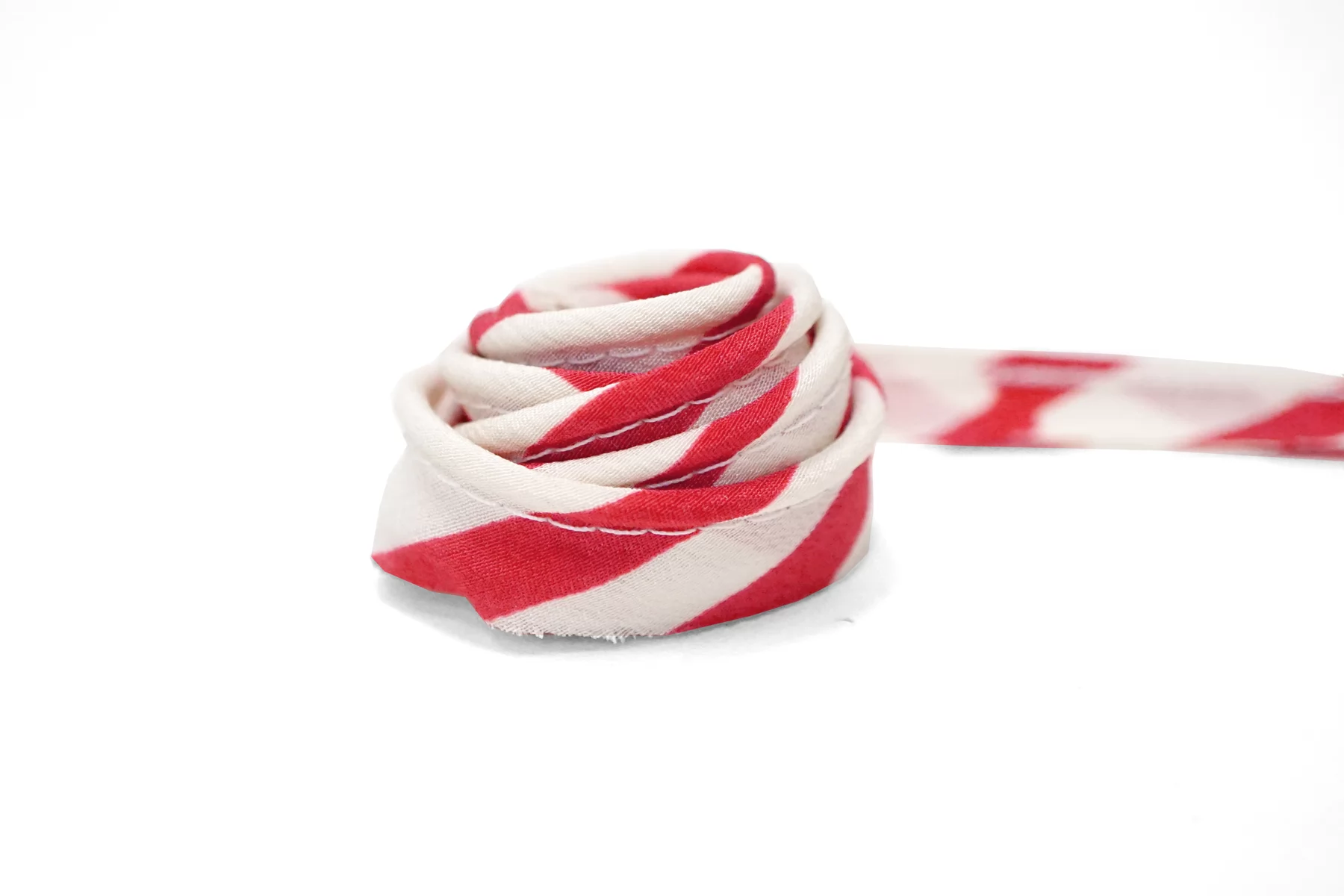 Отделочный шелковый кант в полоску молочного и красного цвета. По плетению это крепдешин, выкроен по косой. Для объема внутри хлопковый шнур. Ширина 1,5 см.