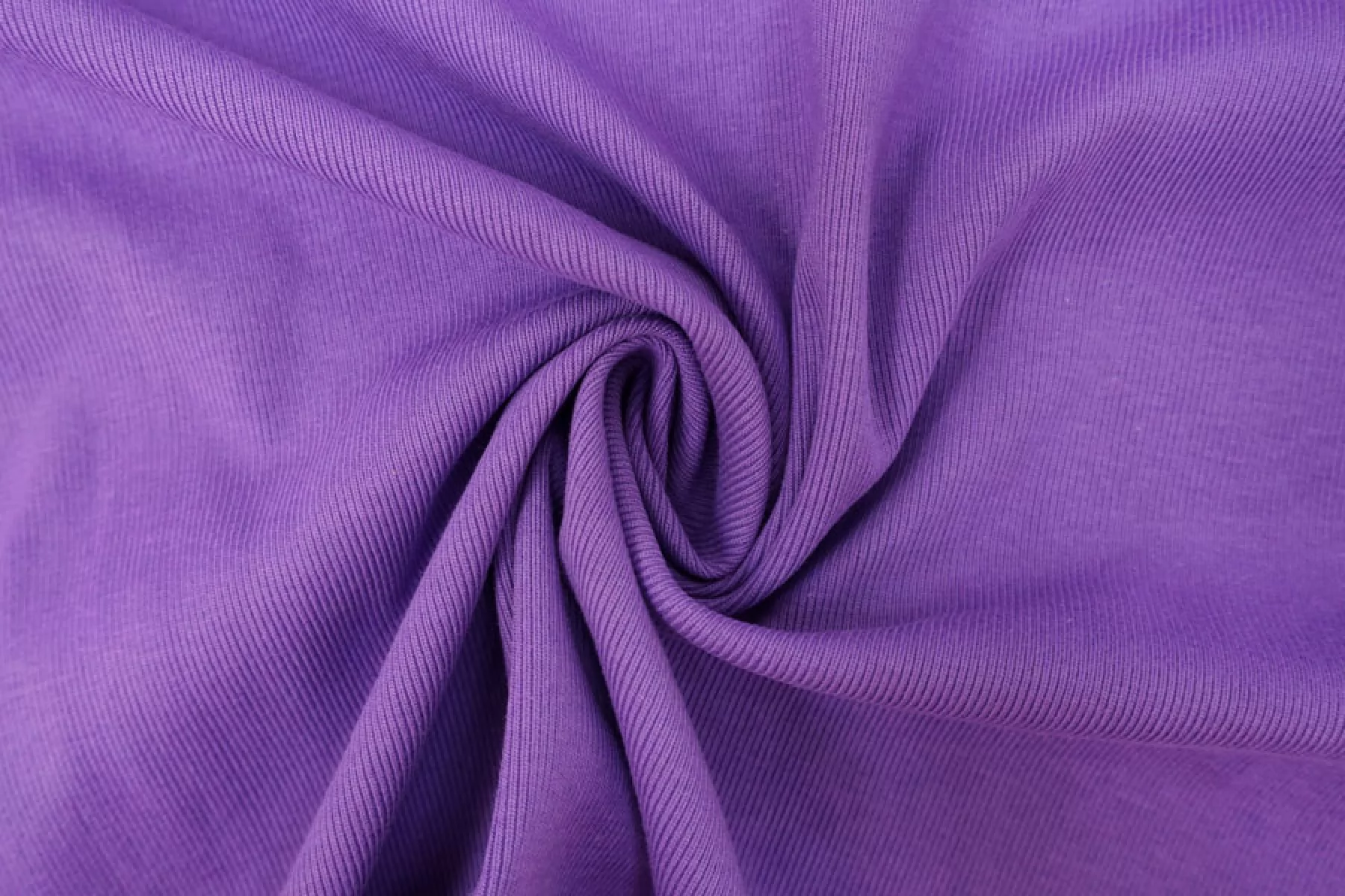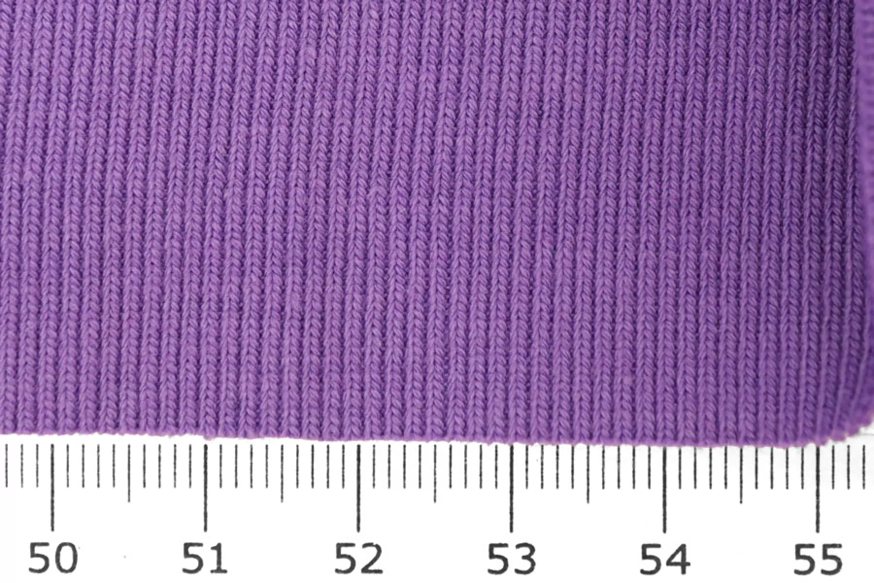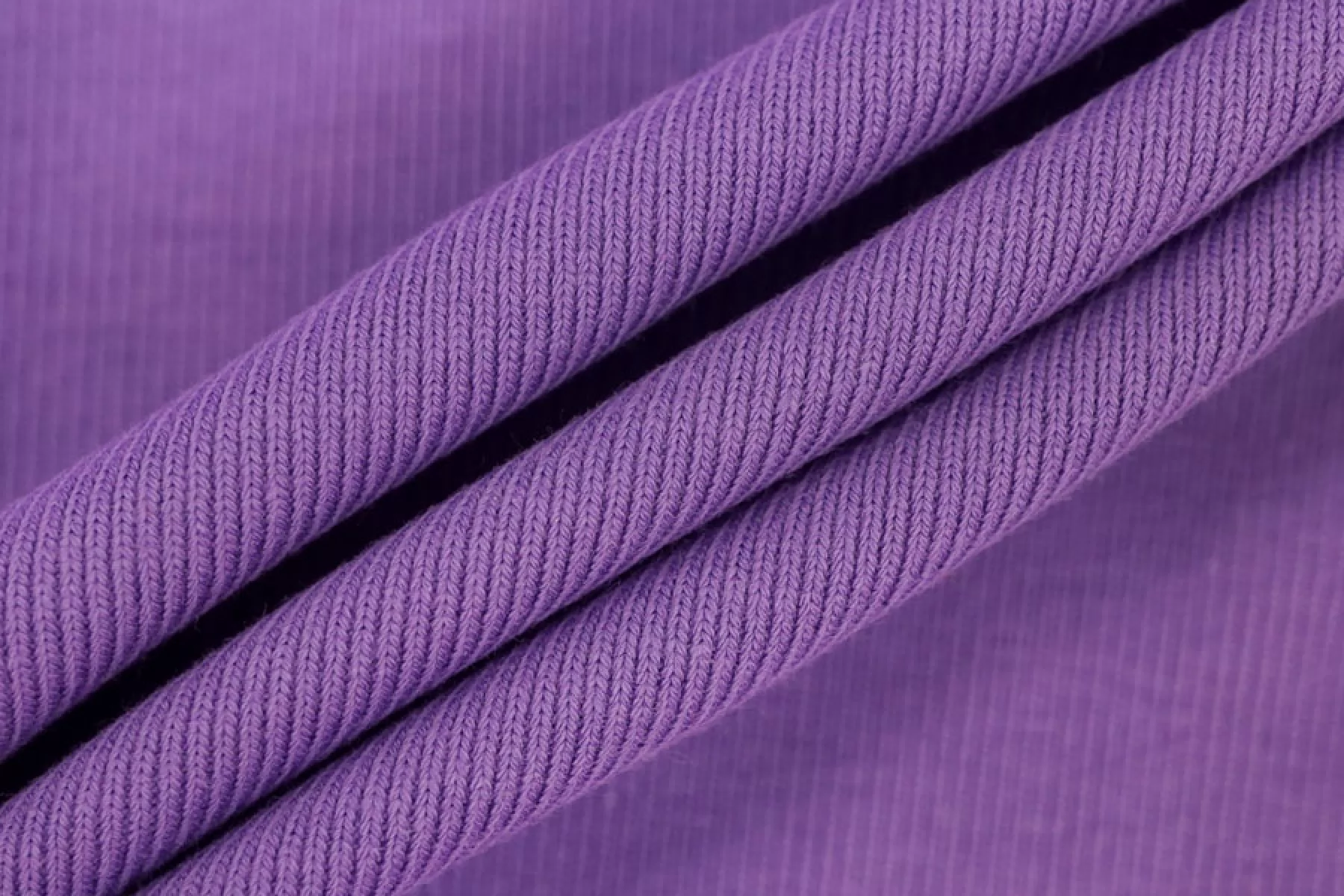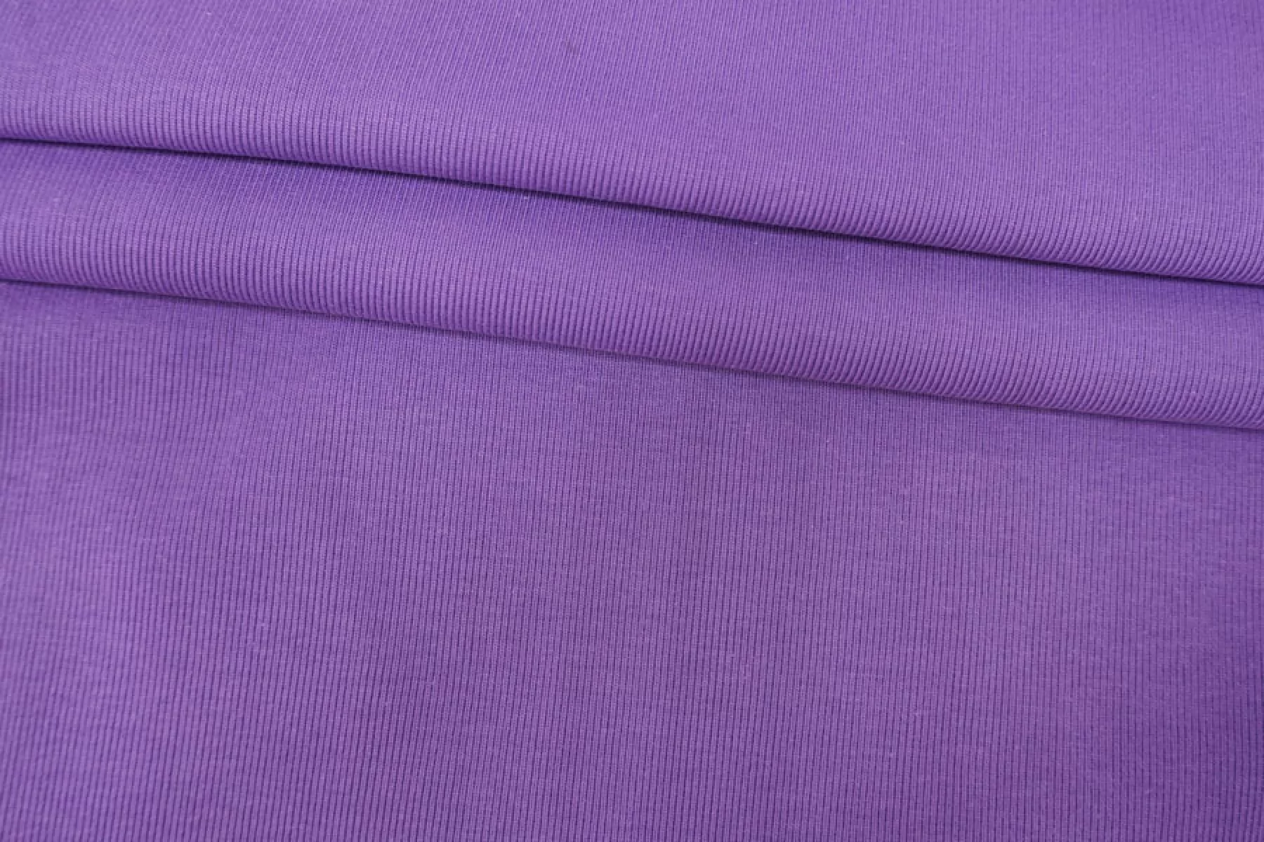Трикотаж, вязка рибана, приглушенно-фиолетового цвета, от бренда FENDI. Эластичный, пластичный, не просвечивает. Плотный. Хорошо тянется в обе стороны и чувствуется плетение. Подойдет для пошива майки или топа, манжет, подвязов.