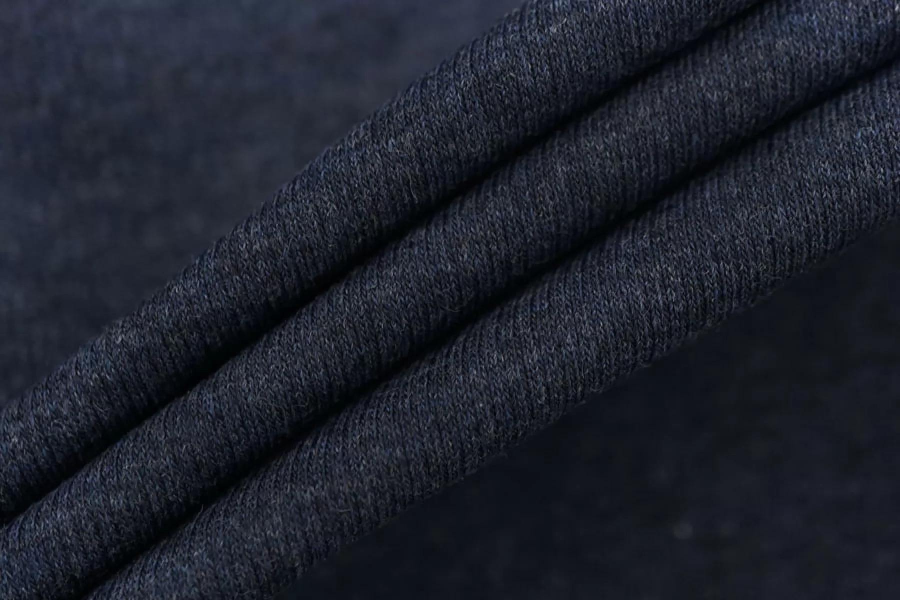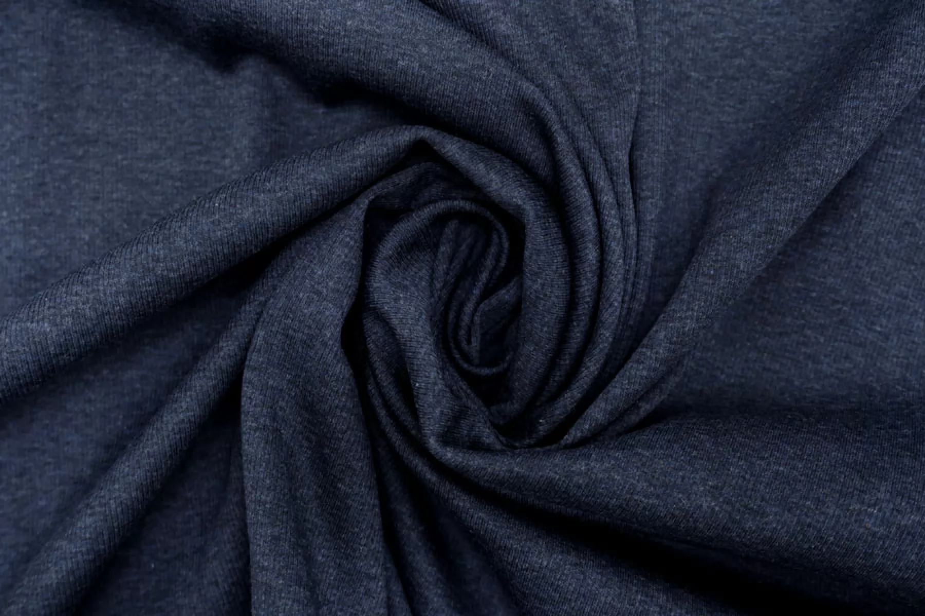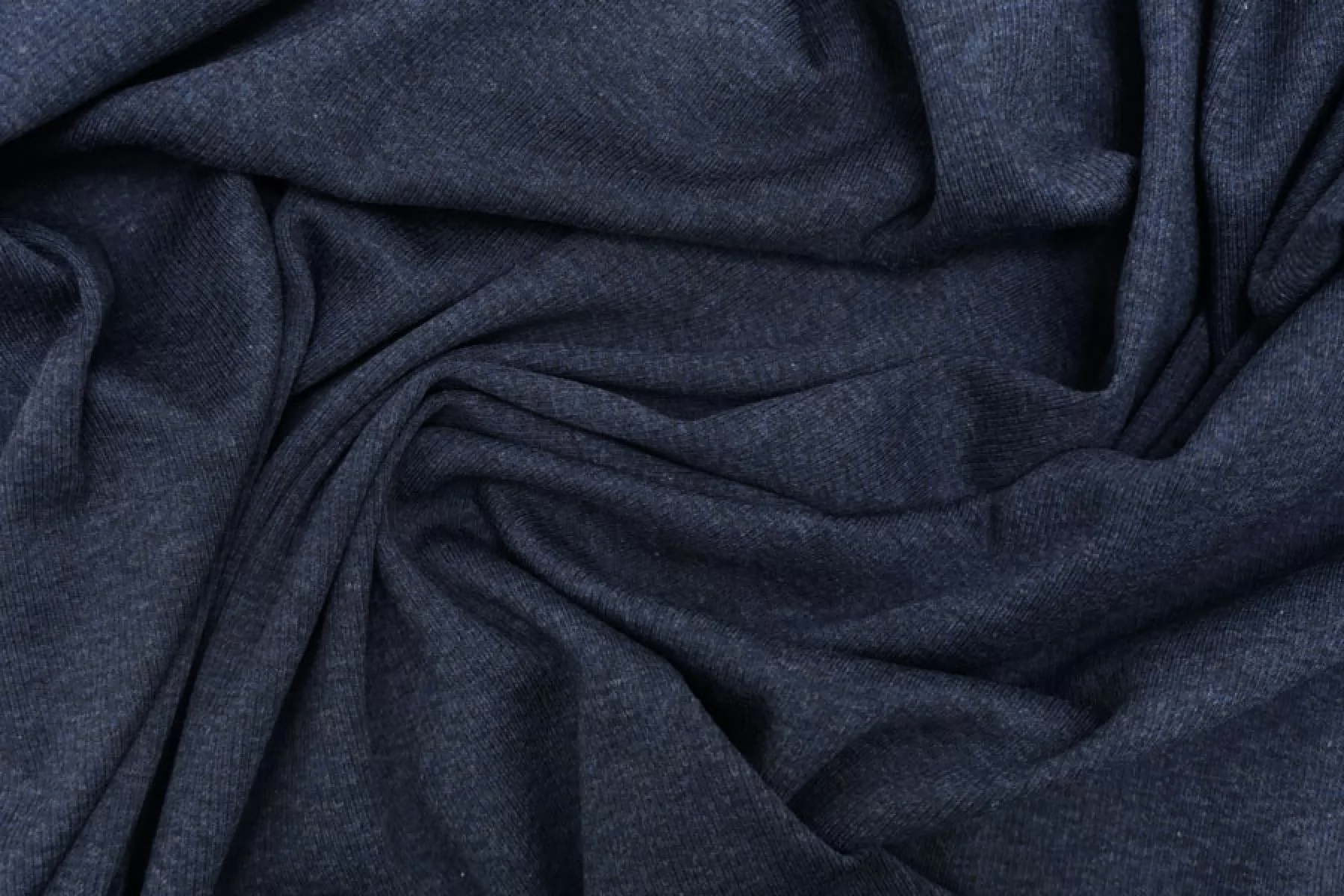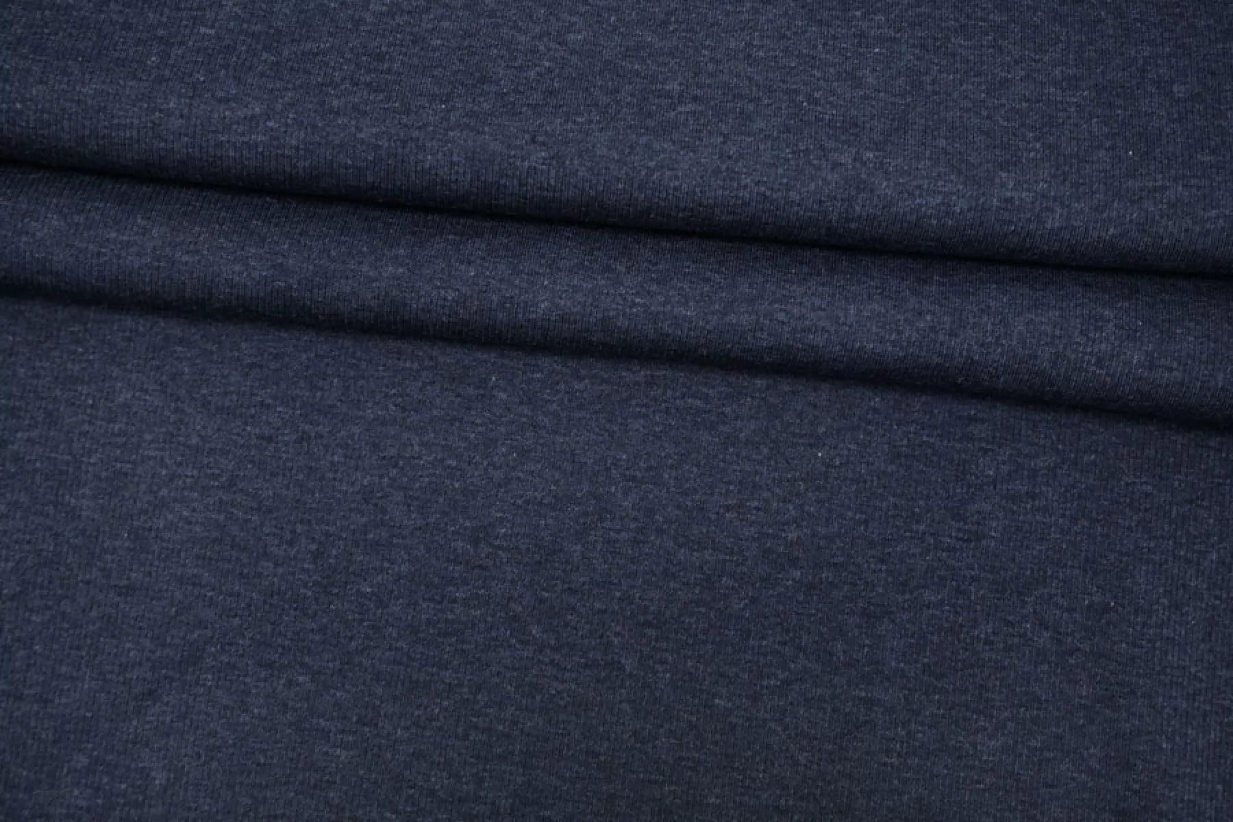 Трикотаж, вязка кашкорсе, приглушенного темно-синего оттенка меланж. Эластичный, пластичный, очень мягкий, немного просвечивает при растяжении. Практически не мнется, форму держит. Подойдет для пошива майки или топа, манжет, подвязов.