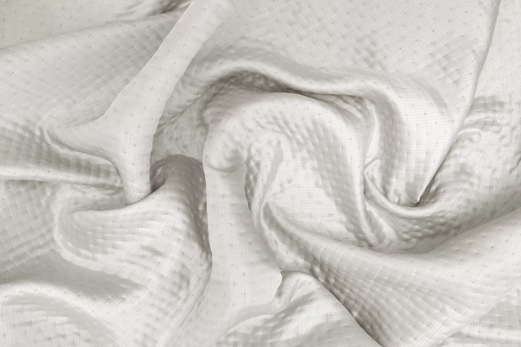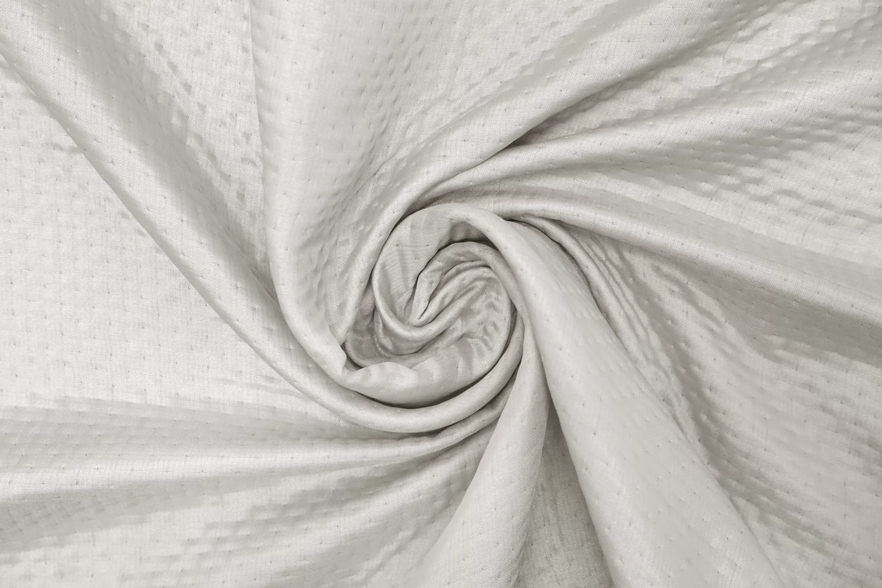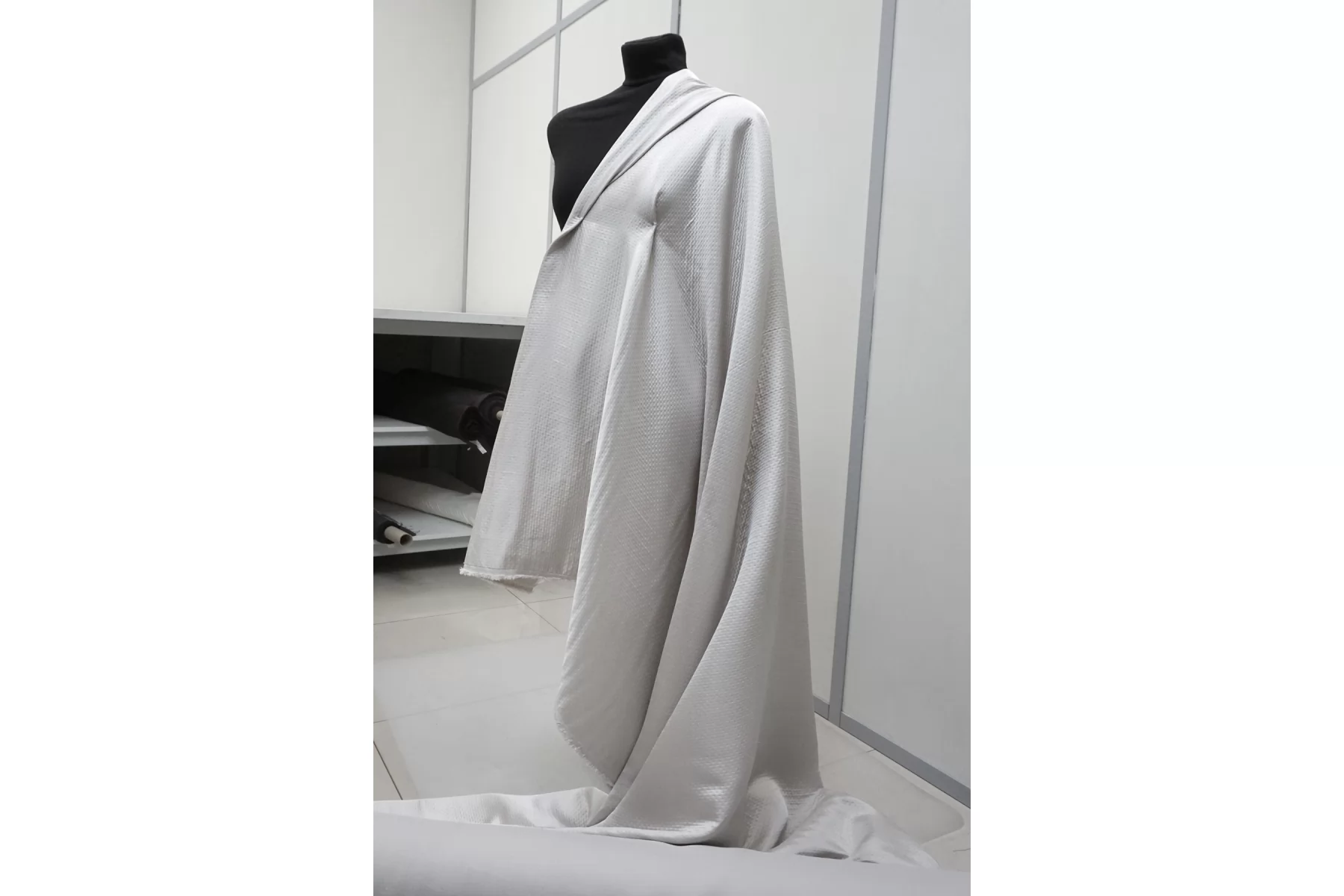 Костюмно-плательная ткань-клоке от бренда Amiri из полиамида, в светлом серо-бежевом оттенке, с лоском. Слегка просвечивает в дырочки плетения, не тянется, пластичная. Тактильно приятная, мягкая. Пластикой немного напоминает тонкий неопрен (держит объемные складки). Подойдет для пошива интересной юбки, лёгкого бомбера, нестандартного костюма.