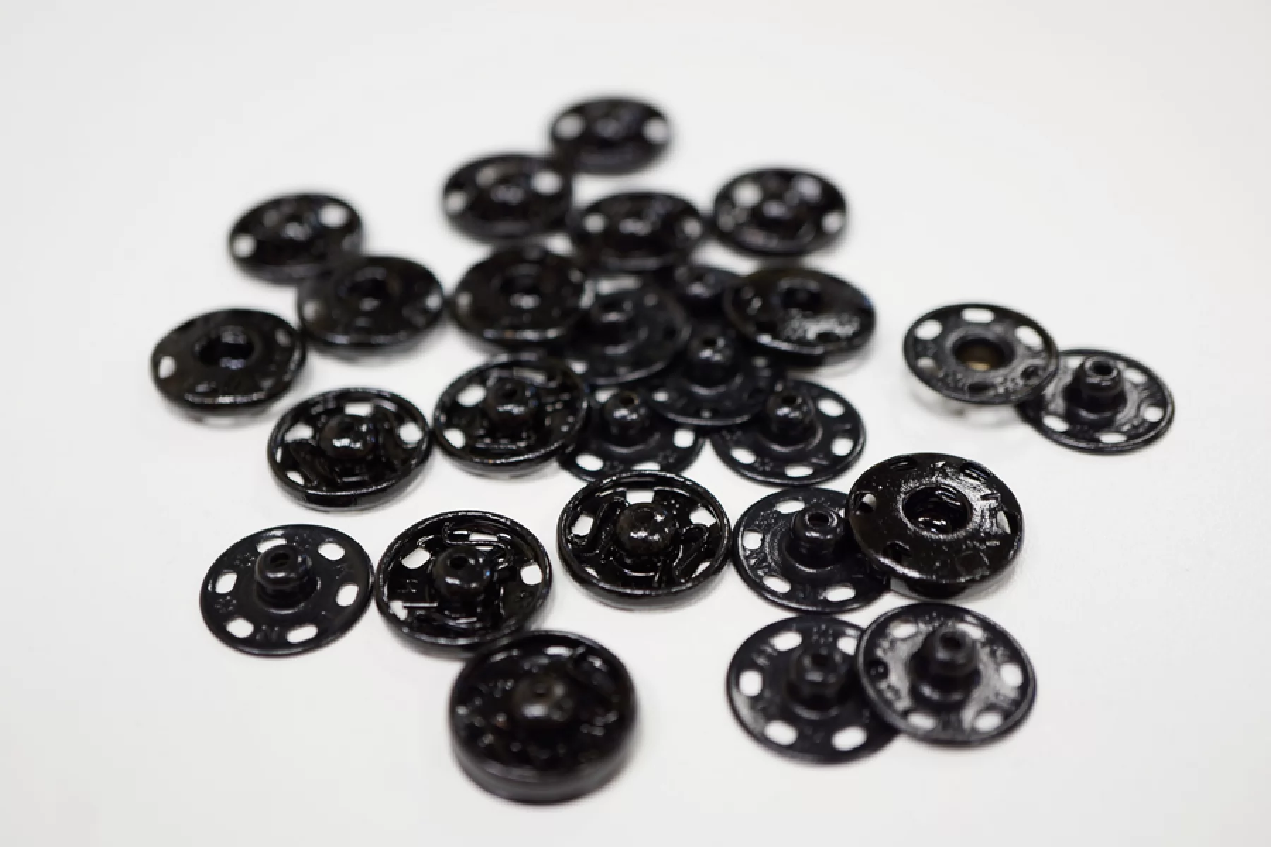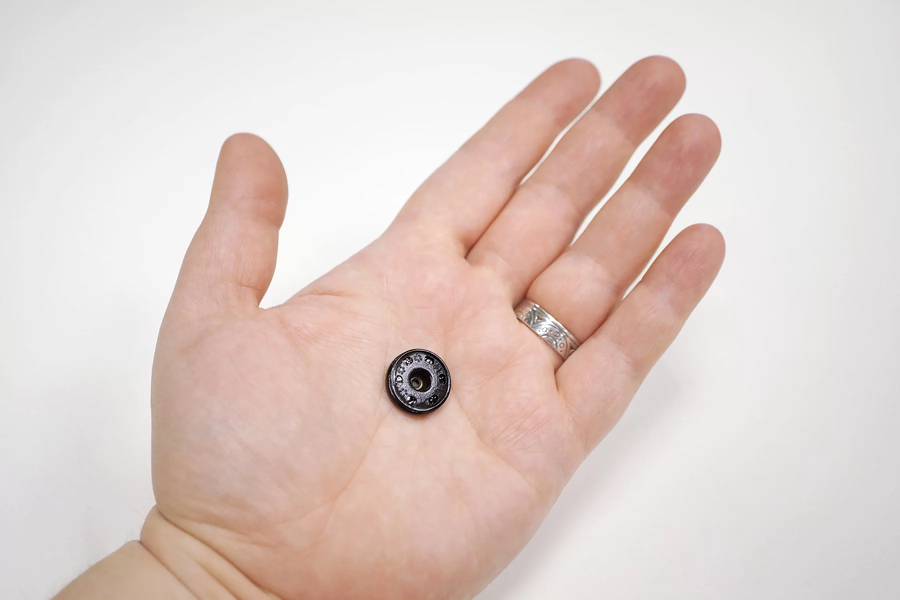 Кнопка черного цвета, размер 16 мм. С выбитыми буквами KN и цветочками.