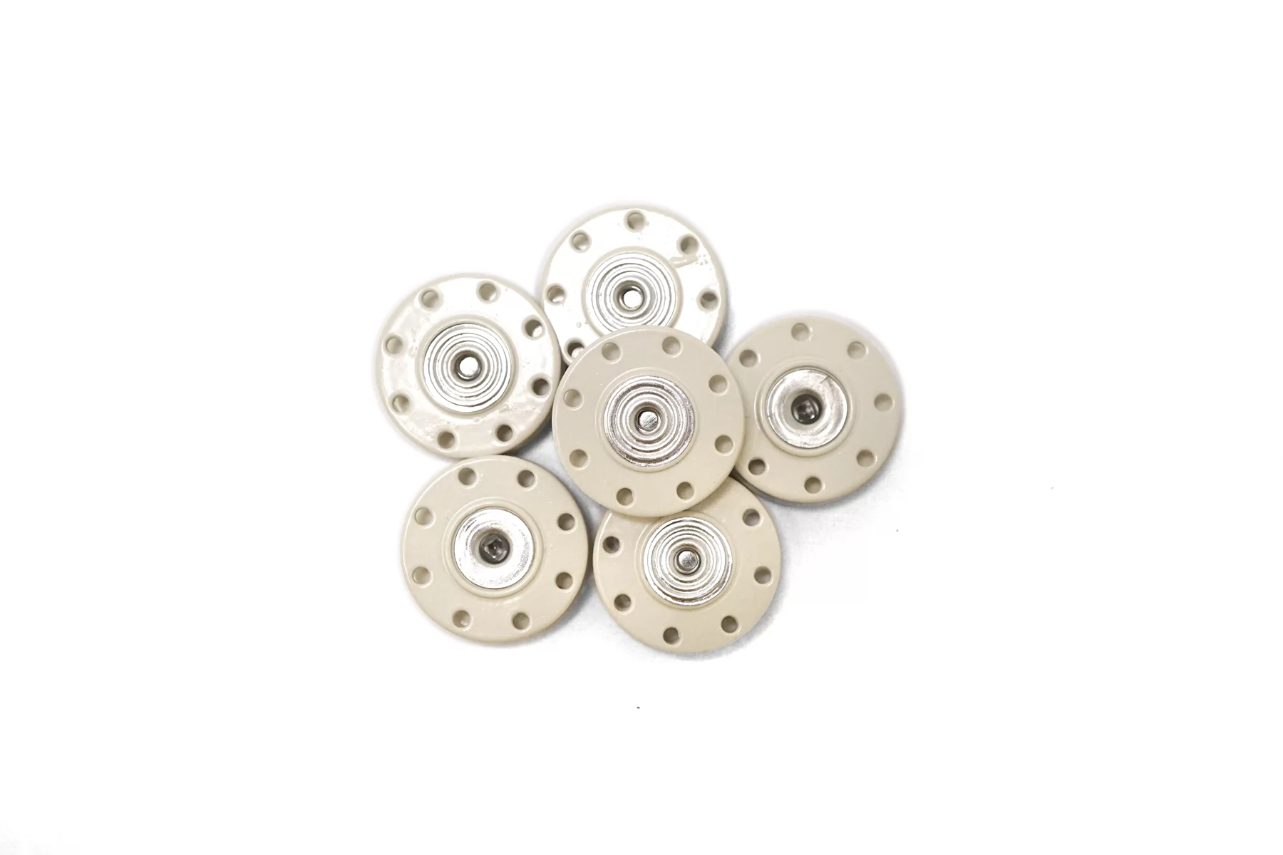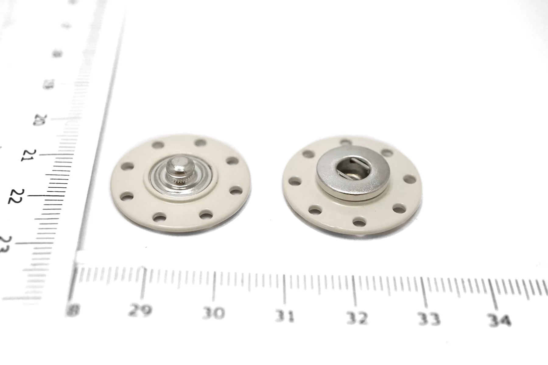 Кнопка металлическая, матовая, пришивная. Основание молочного цвета с серебряной кнопкой, размер 22 мм.