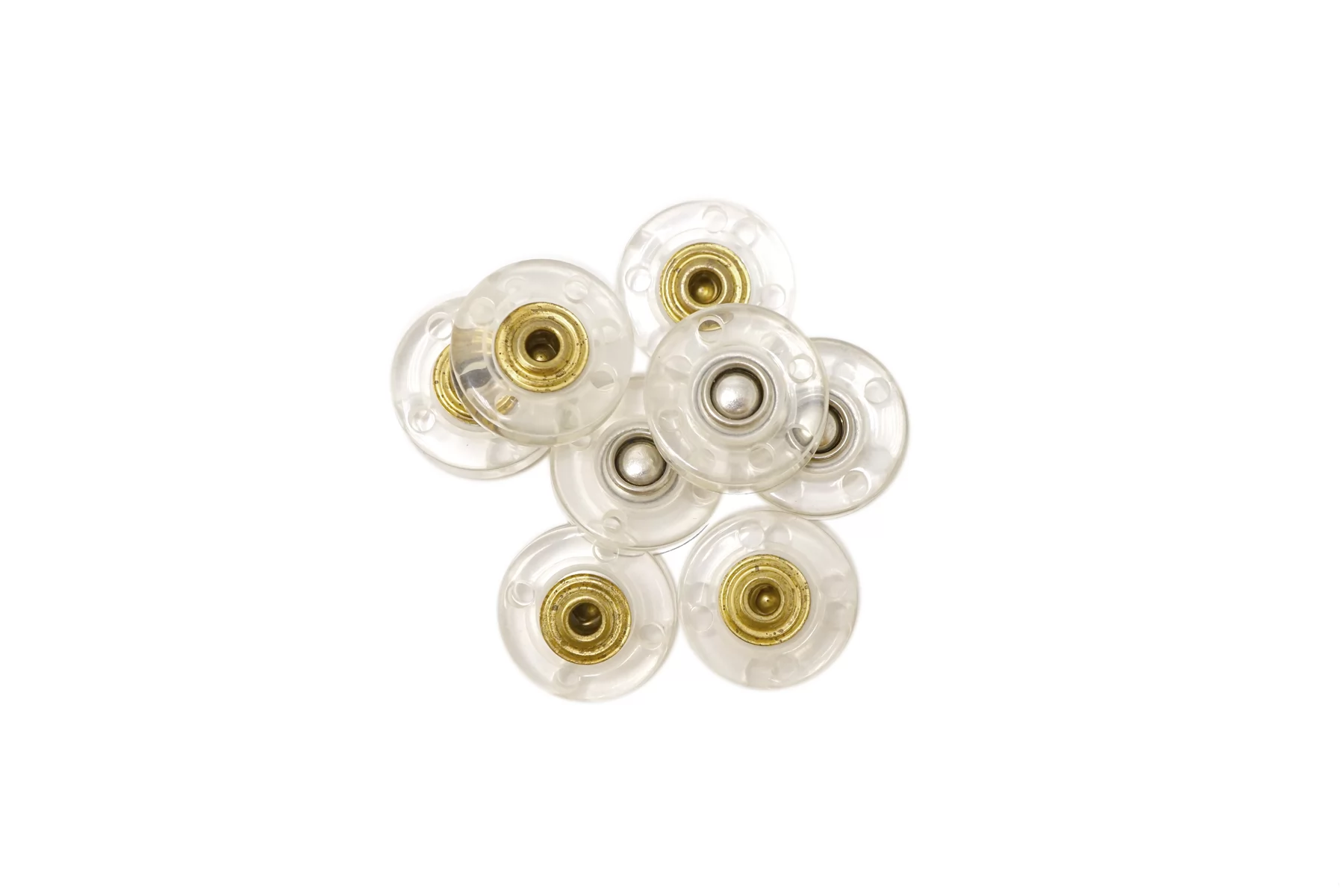 Кнопка пластиковая, пришивная. Основание прозрачное с серебряной кнопкой, размер 20 мм.