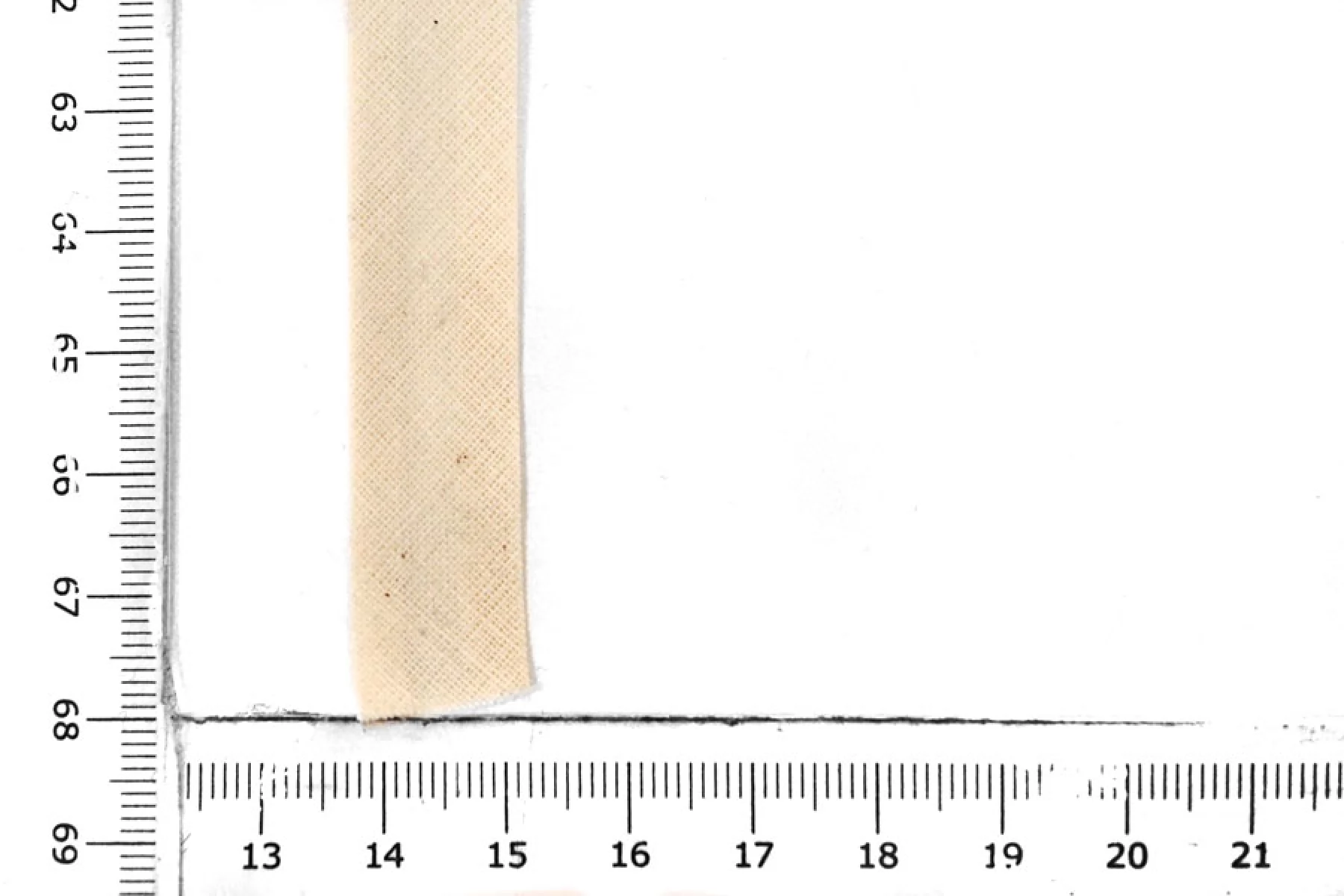 Косая бейка из хлопка 14 мм в сливочном оттенке с вкраплениями. Немного жестковатая, не пластичная. Просвечивает силуэт. Достаточно плотная, не рыхлая. Отлично подойдет для декорирования одежды, аксессуаров и бижутерии.