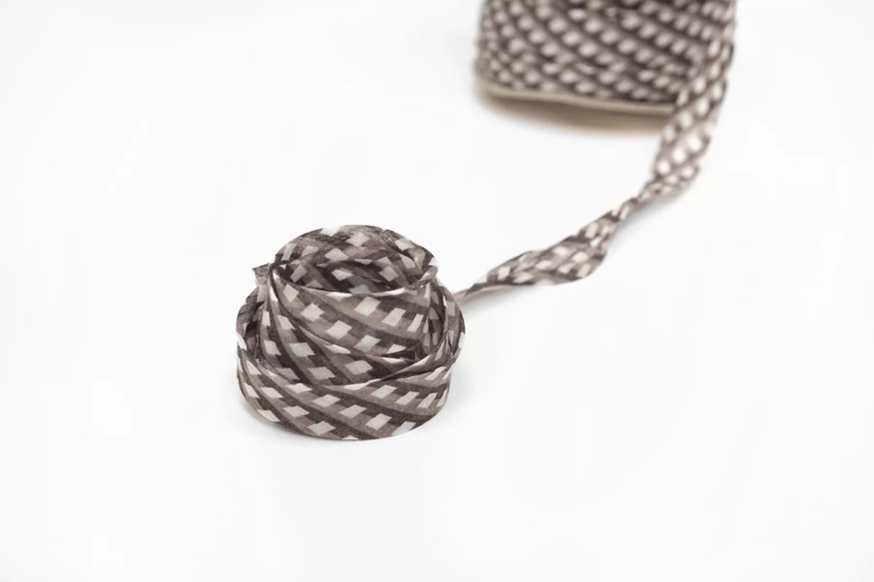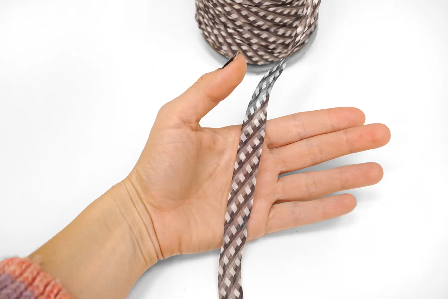 Цена указана за метр. Косая бейка из хлопка, серо-коричневые полосы с белыми ромбами , ширина - 1,5 см, выкроенная по косой, с заранее подогнутыми припусками. Тактильно приятная, чувствуется, что шерсть, мягкая, не колется. Пластичная, легко укладывается на неровные срезы без складок и смещения, образуя ровный, красивый борт. Подойдёт для обработки срезов бортов, для горловины, при шитье рукава одежды. Также возможно применение при декорировании, оформлении подарков, аппликаций.