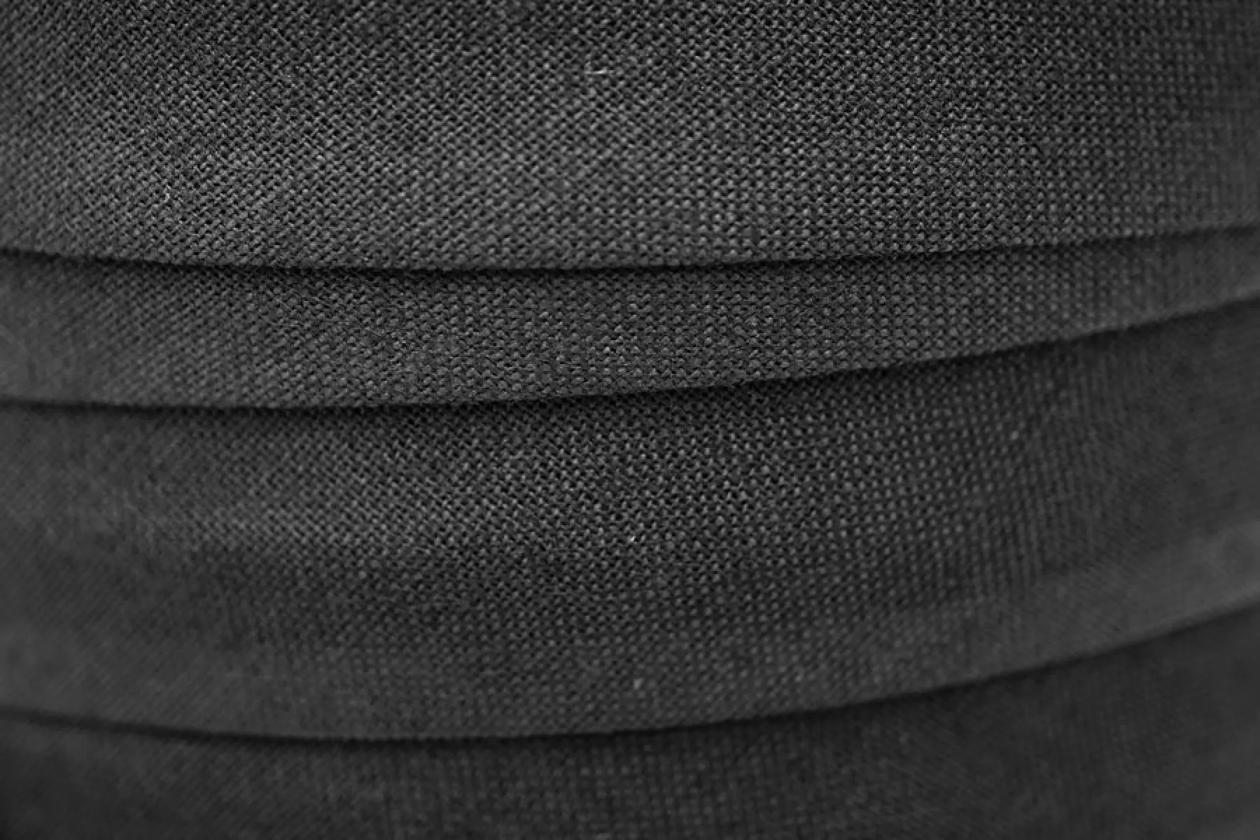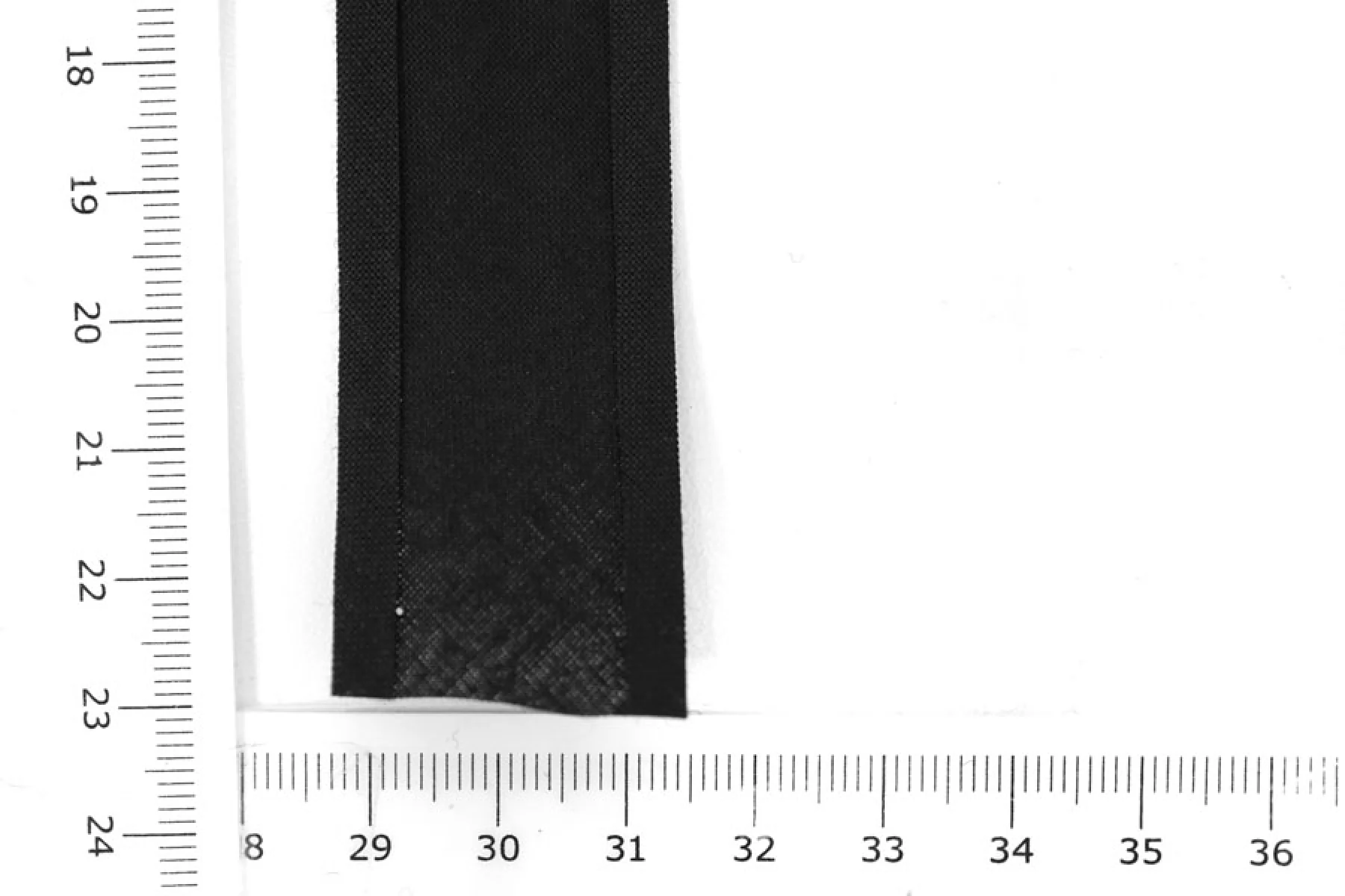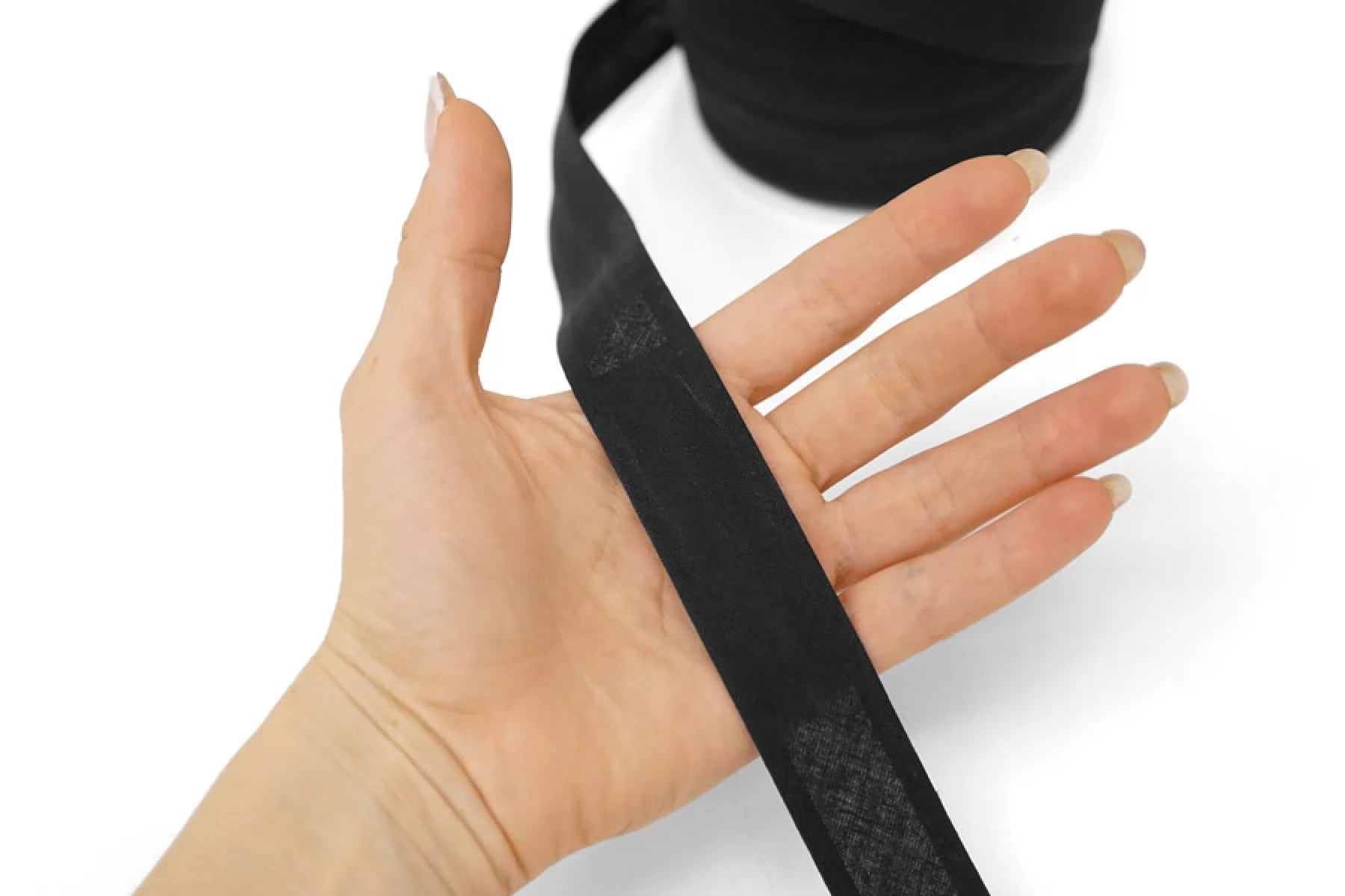 Черная косая бейка из хлопка 26 мм. Немного жестковатая, не пластичная. Просвечивает силуэт. Достаточно плотная, не рыхлая. Отлично подойдет для декорирования одежды, аксессуаров и бижутерии.
