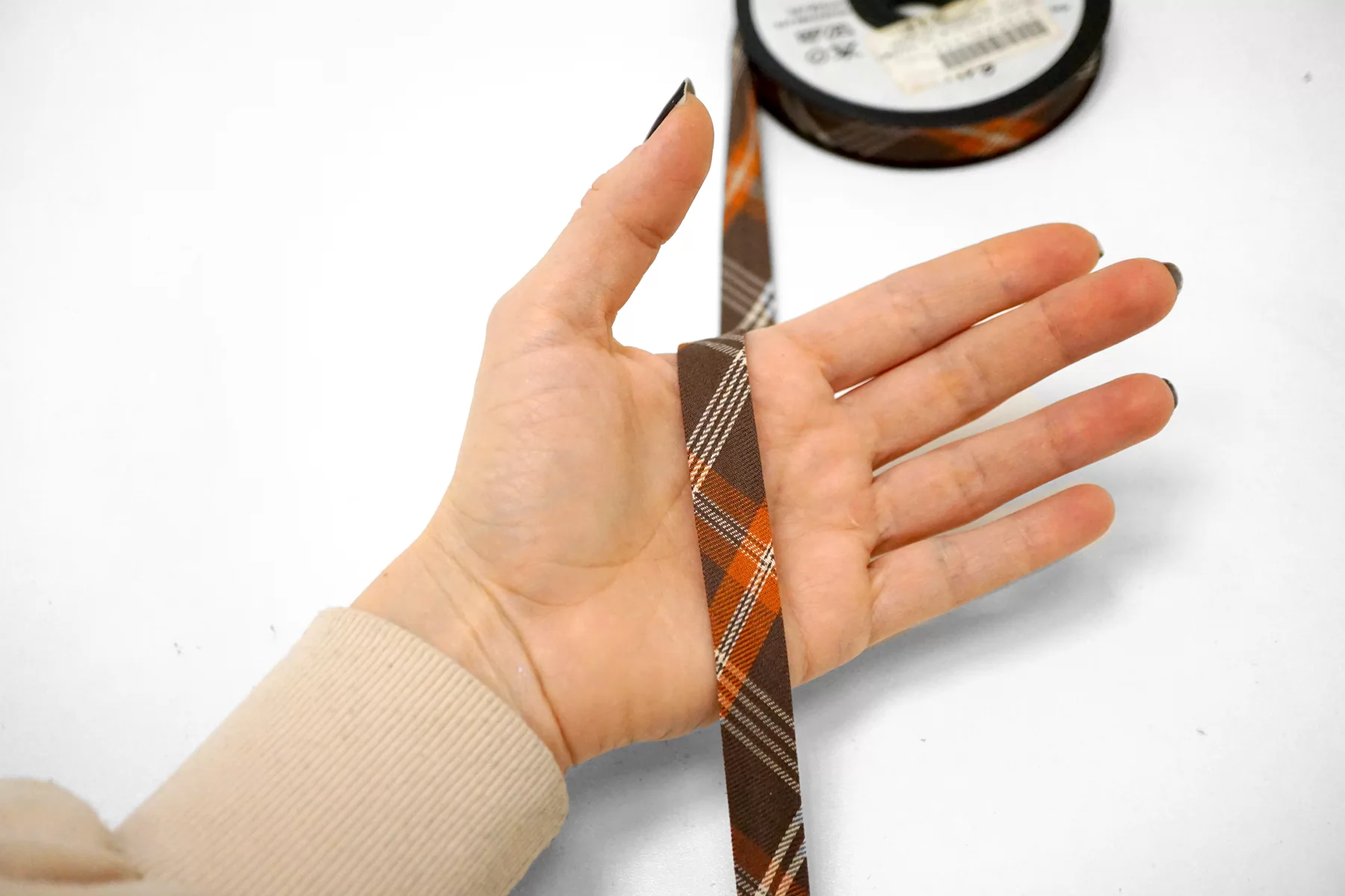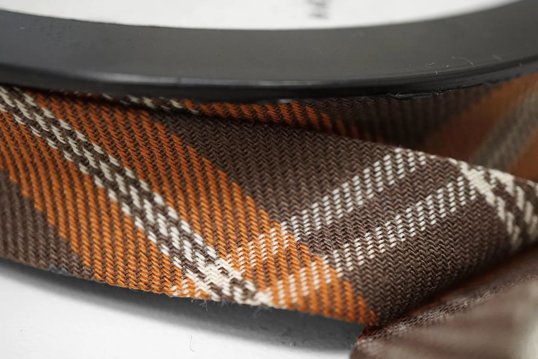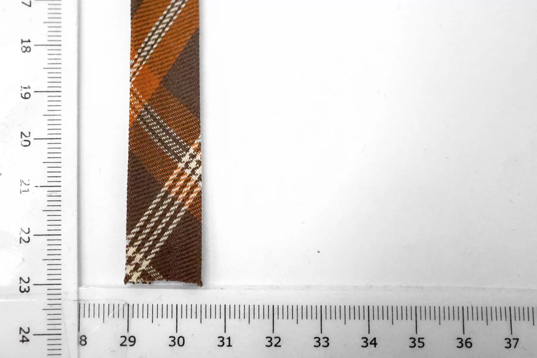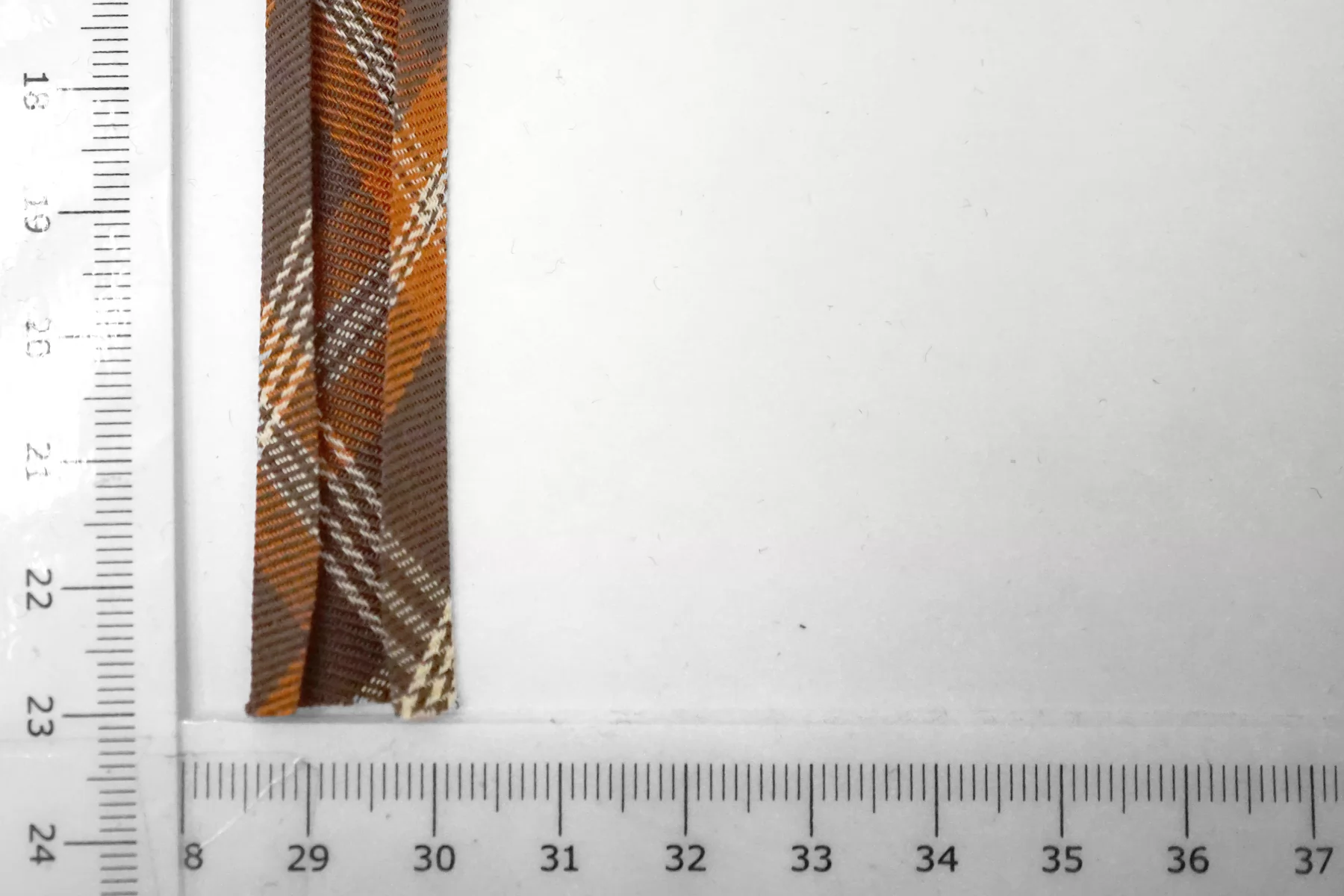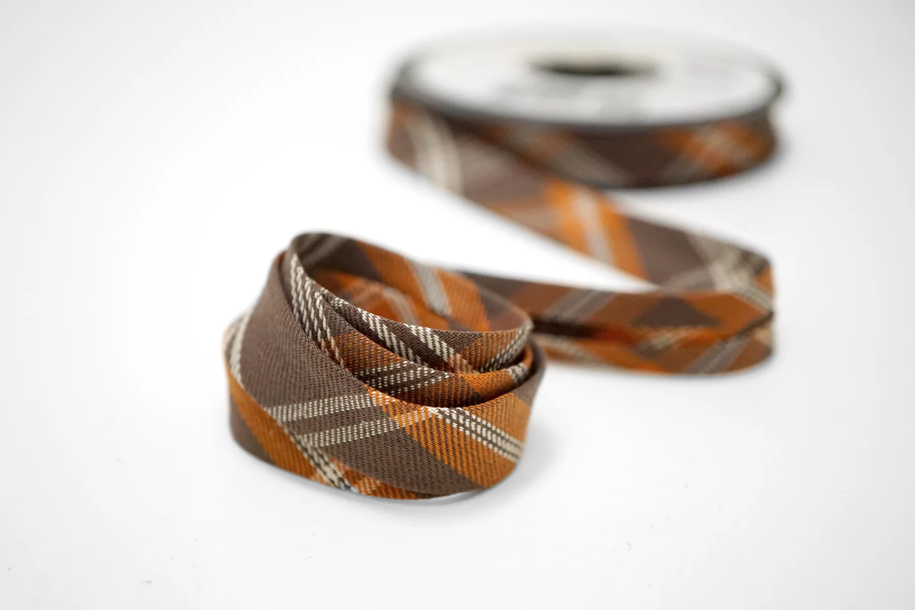 Косая бейка из хлопка с полиэстером, клетка в коричнево-оранжевых тонах. Плетение диагональное (не тонкая ткань). Ширина - 1,5 см, выкроенная по косой, с заранее подогнутыми припусками.