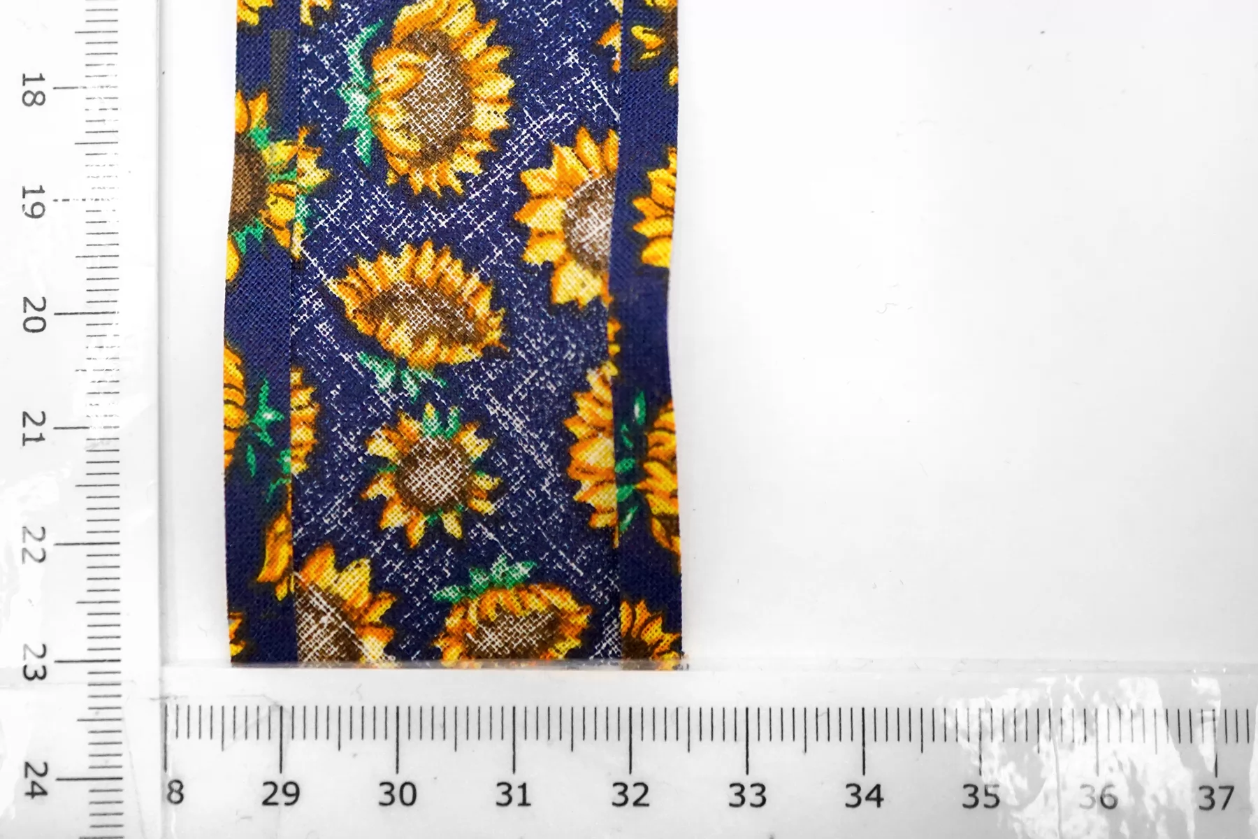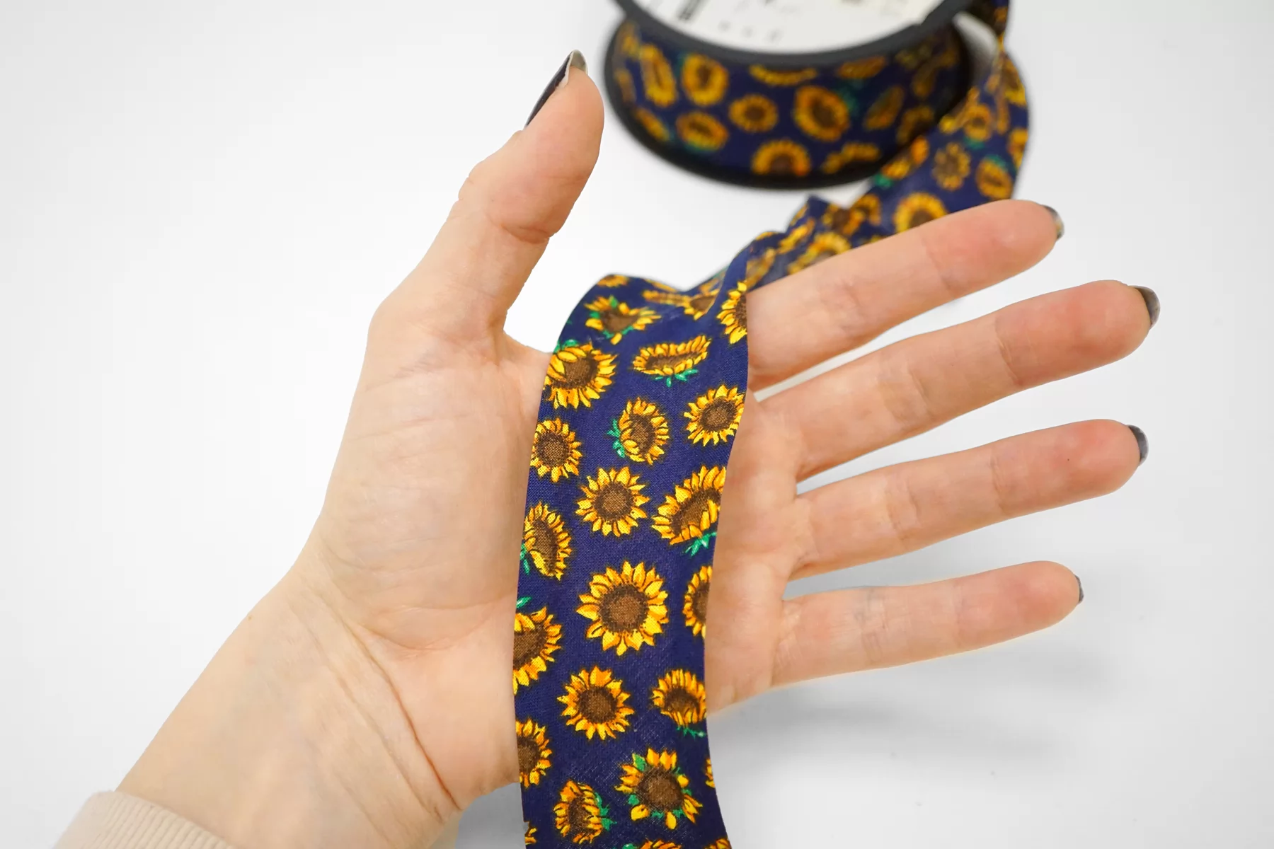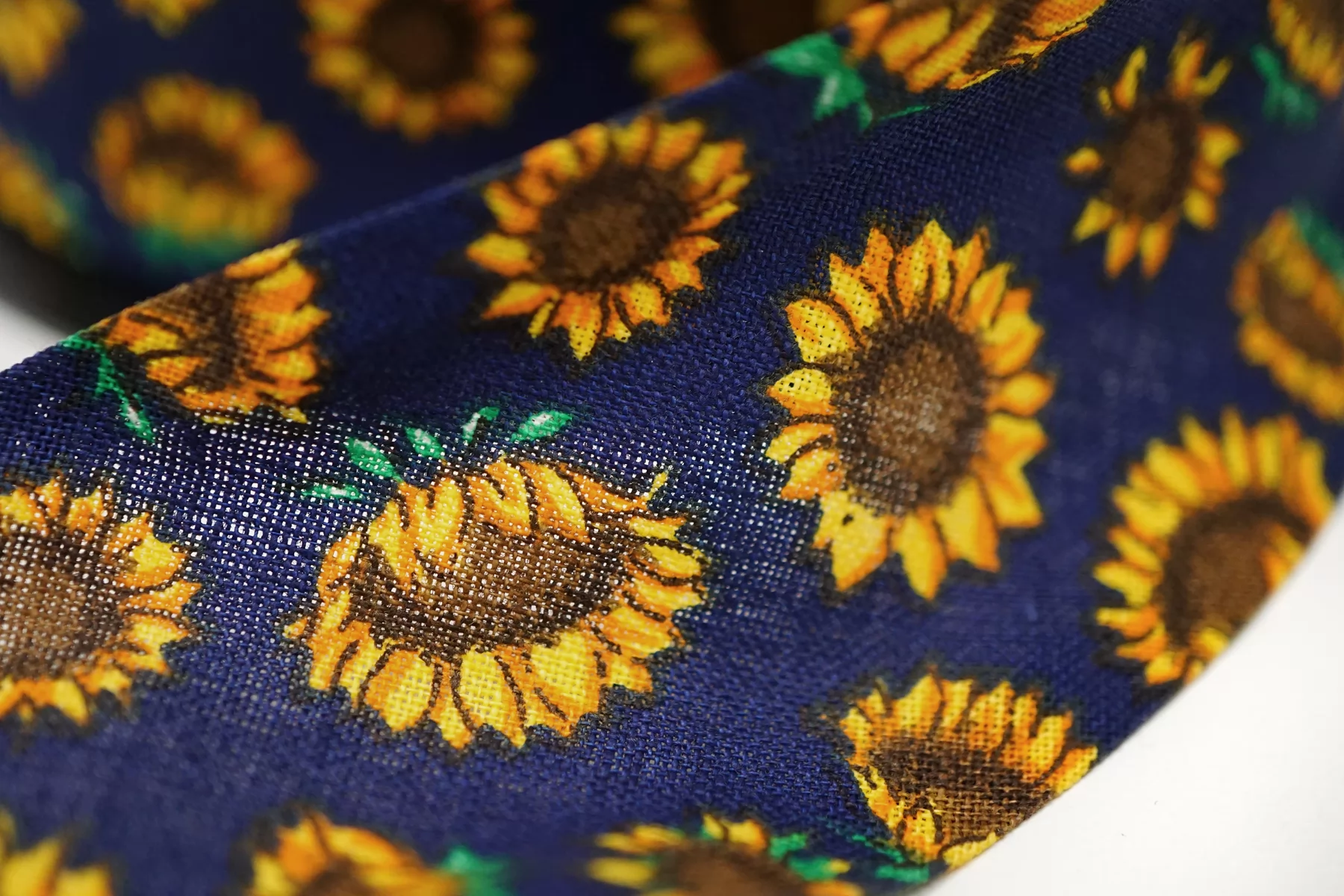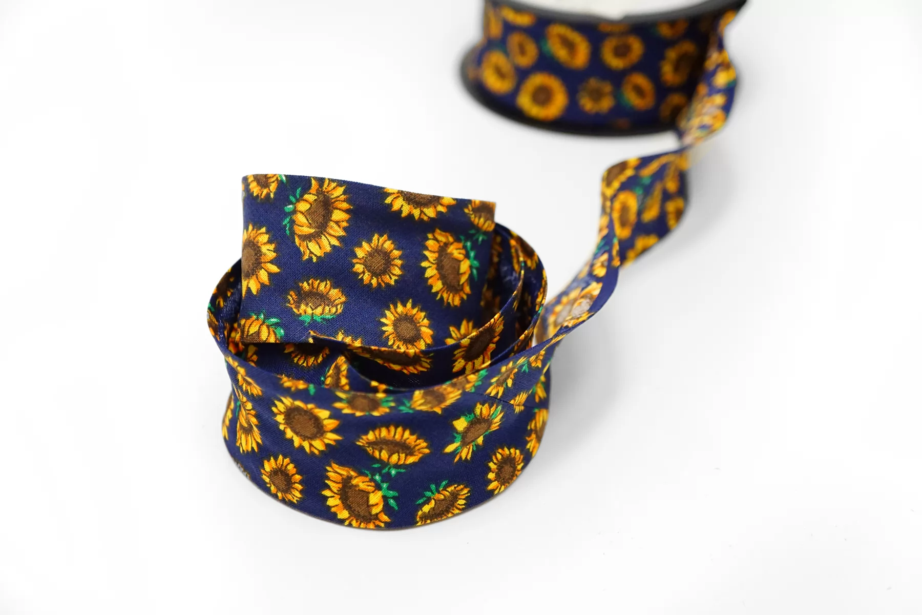 Косая бейка из хлопка, подсолнухи на тёмно-синем фоне. Ширина - 4 см, выкроенная по косой, с заранее подогнутыми припусками.