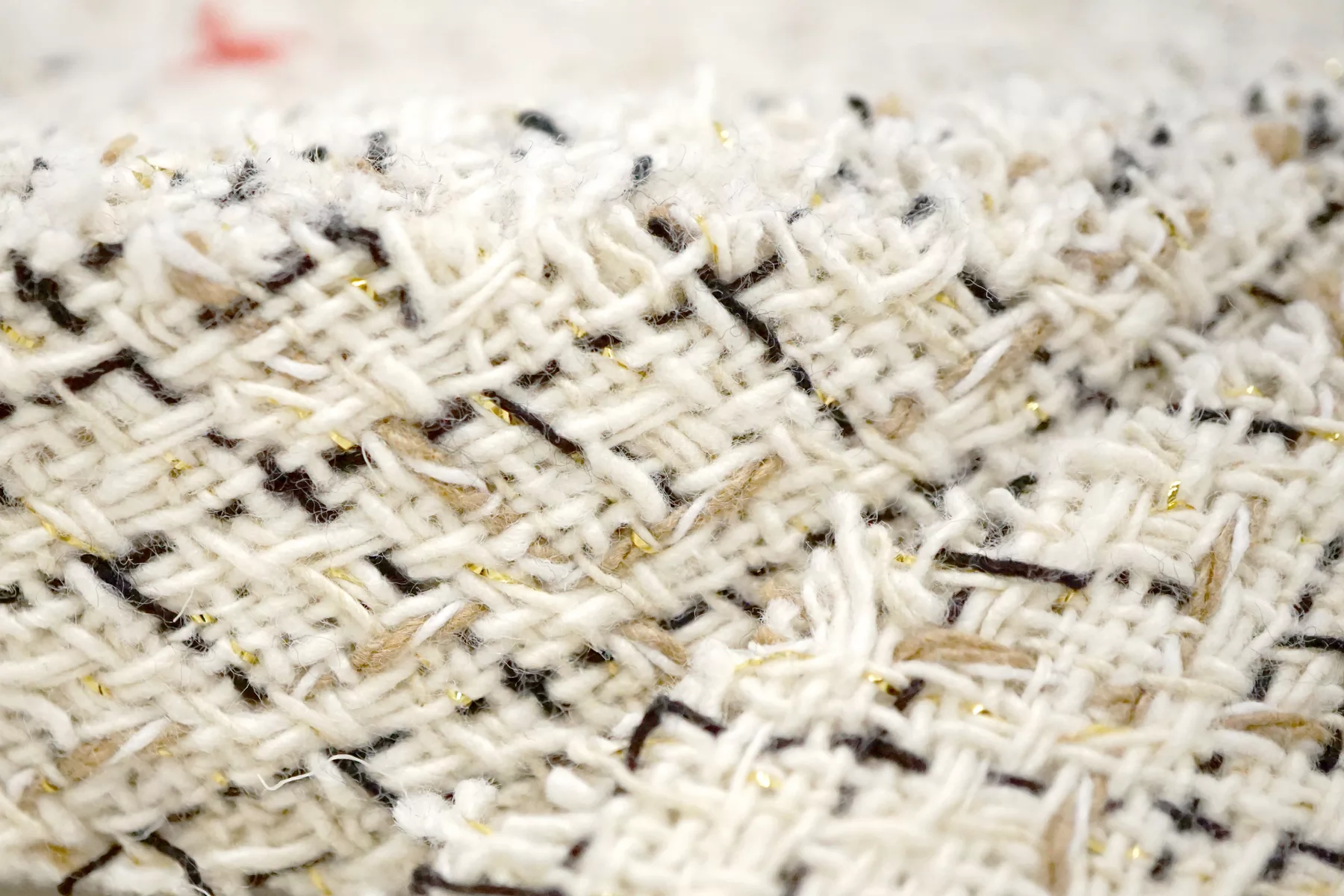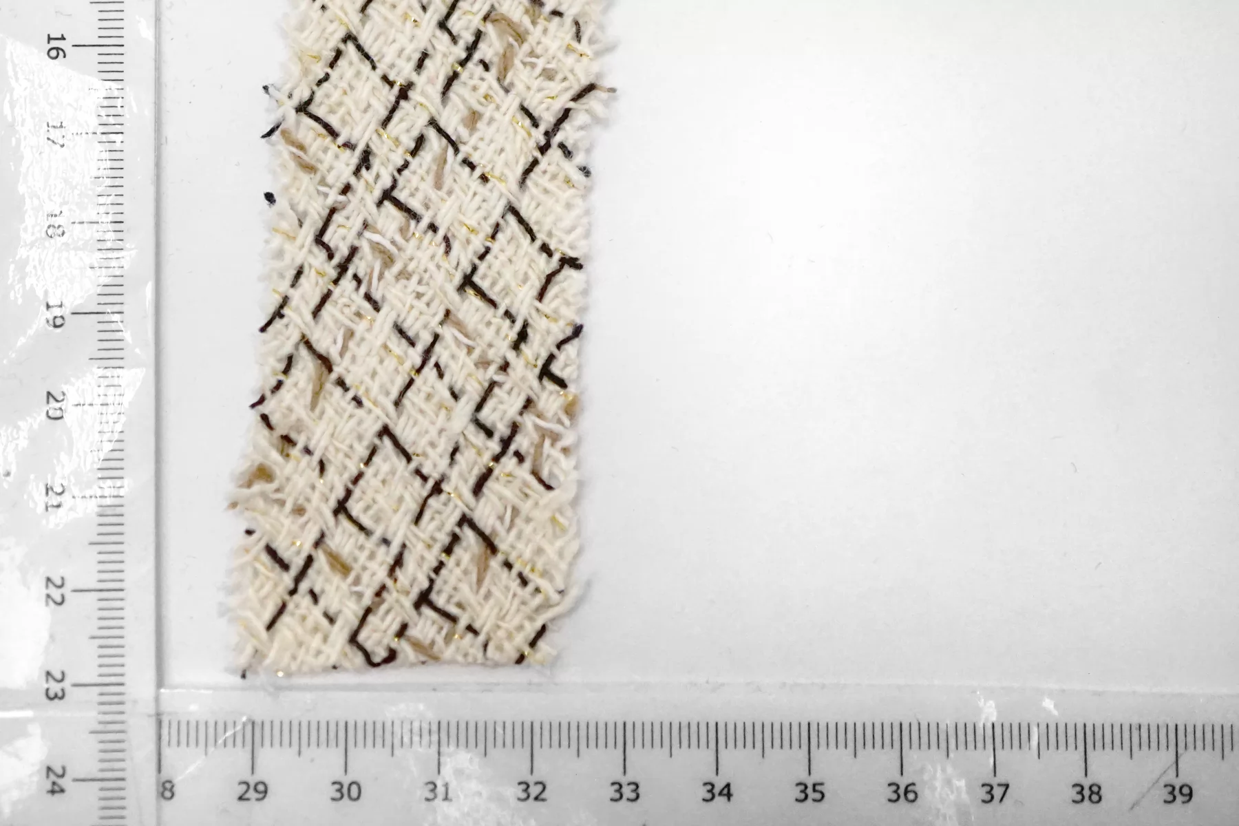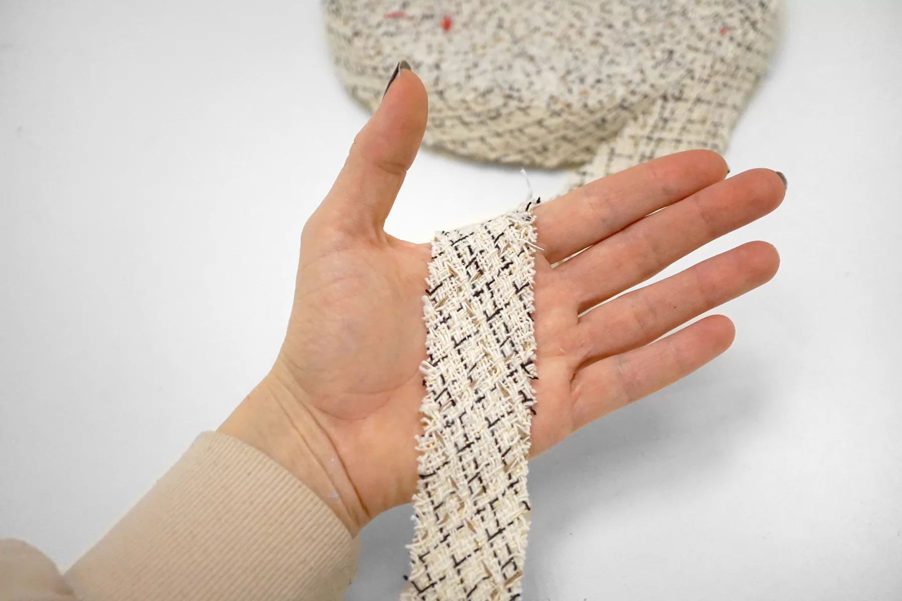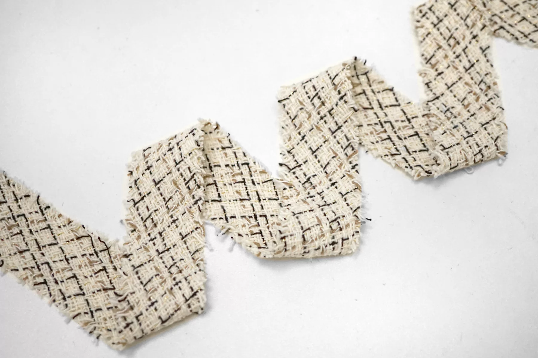 Косая бейка из твида. Нити молочного, чёрного и бежевого цвета, с золотистым люрексом. Ширина - 3,5 см, выкроенная по косой, БЕЗ подгибок.
