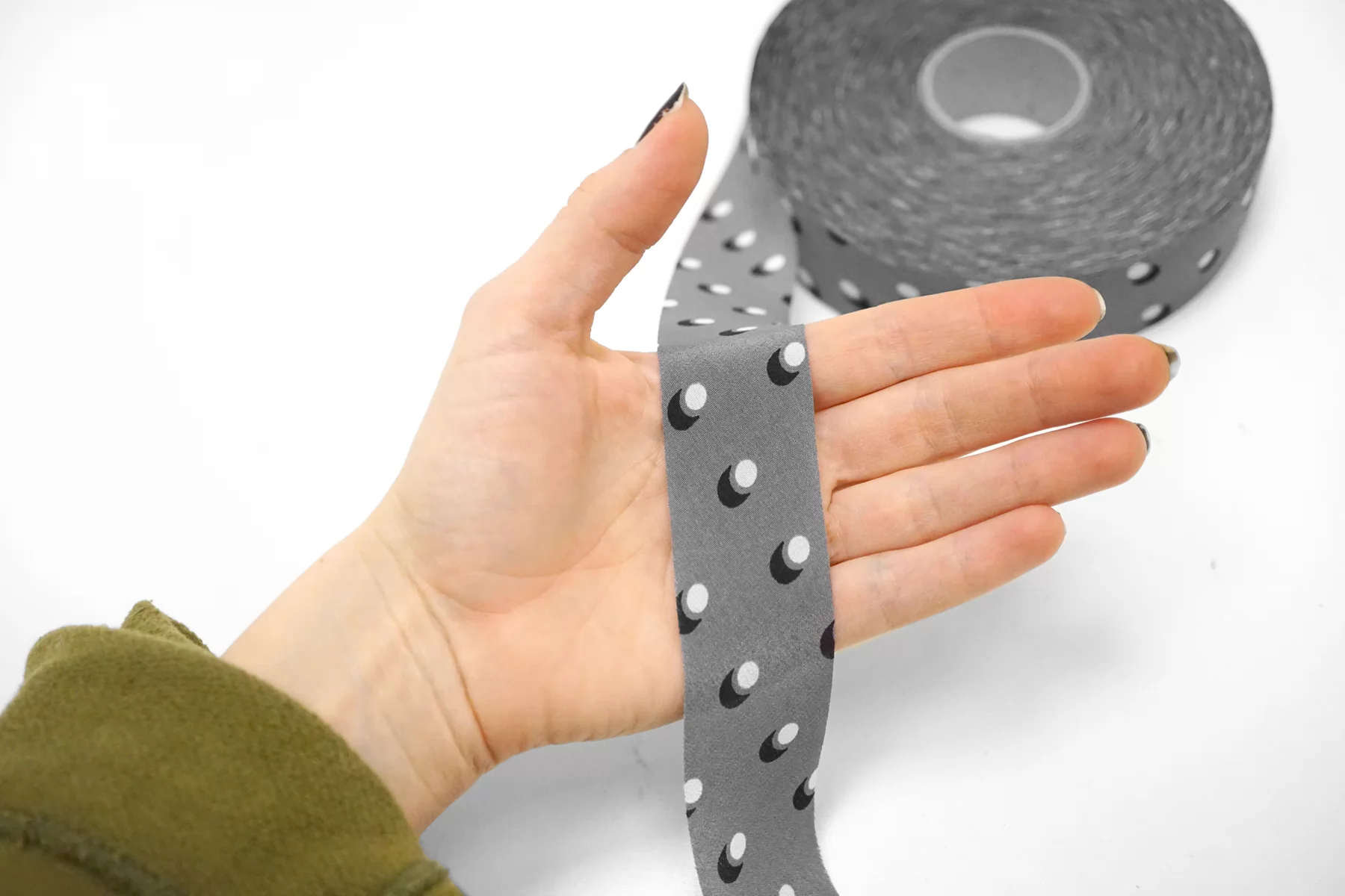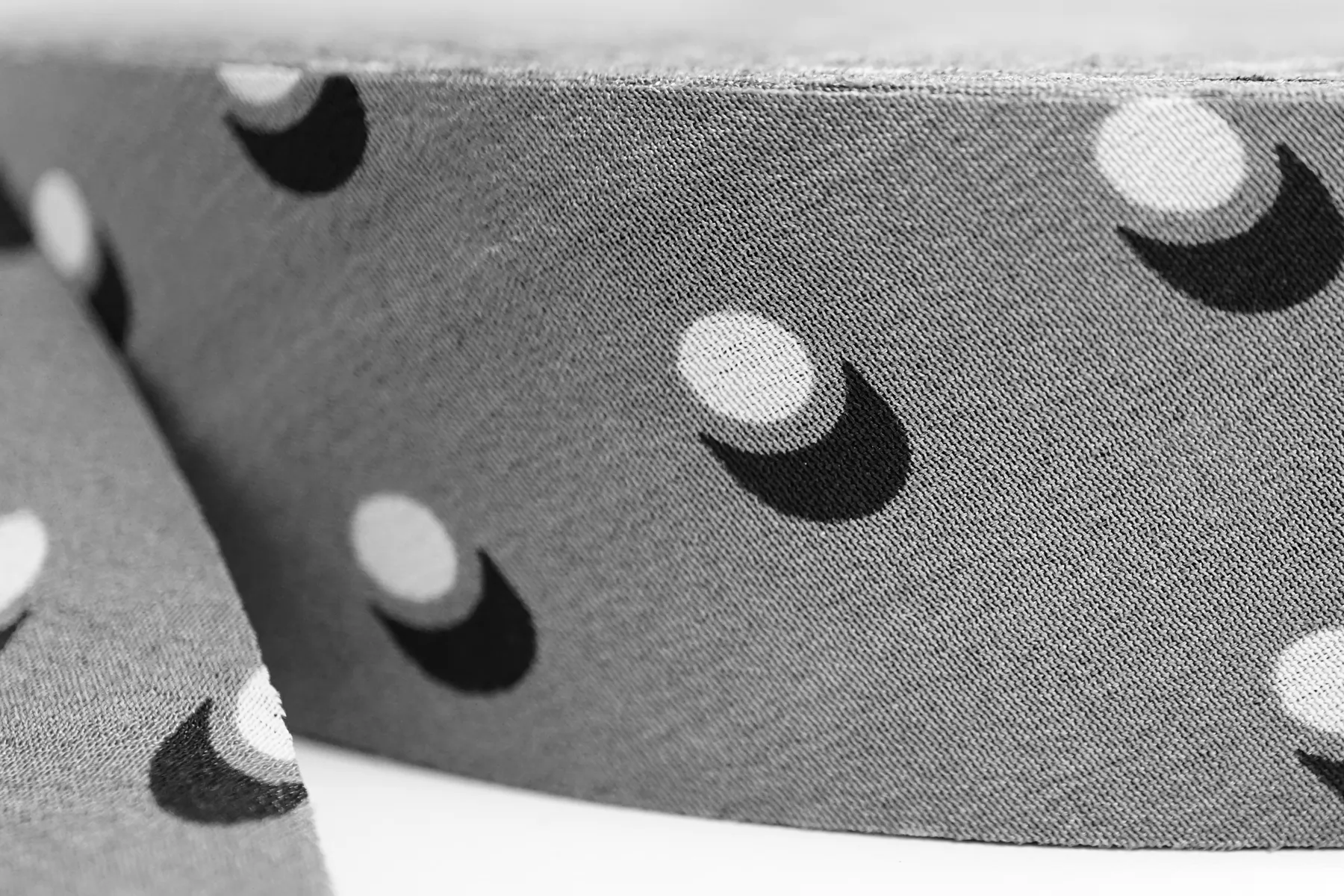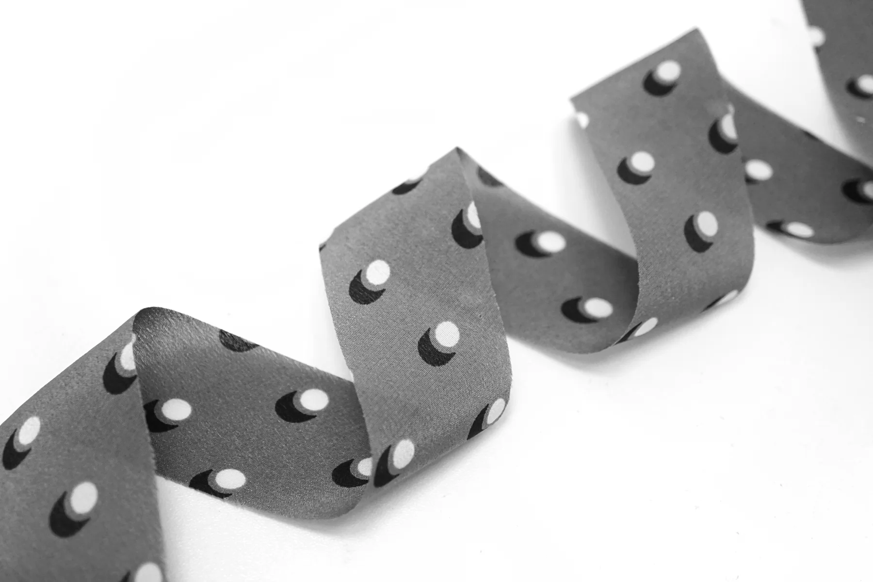 Косая бейка из шёлка, серого цвета в белый горошек. Плетение крепдешин. Ширина - 3 см, выкроенная по косой, БЕЗ подгибок.