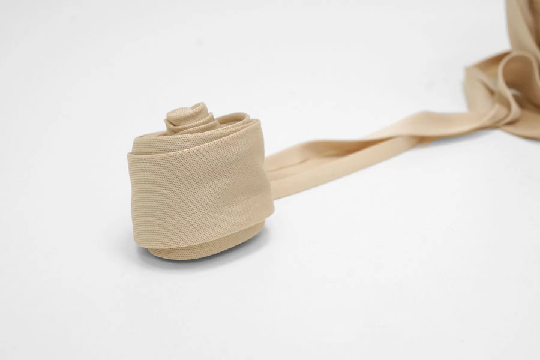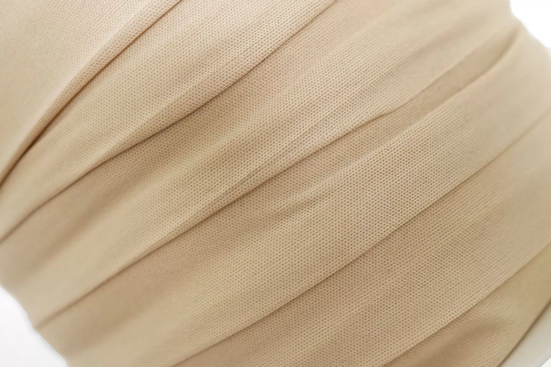 Бежевая трикотажная косая бейка 25 мм , пластичная. Отлично подойдет для декорирования одежды, аксессуаров .