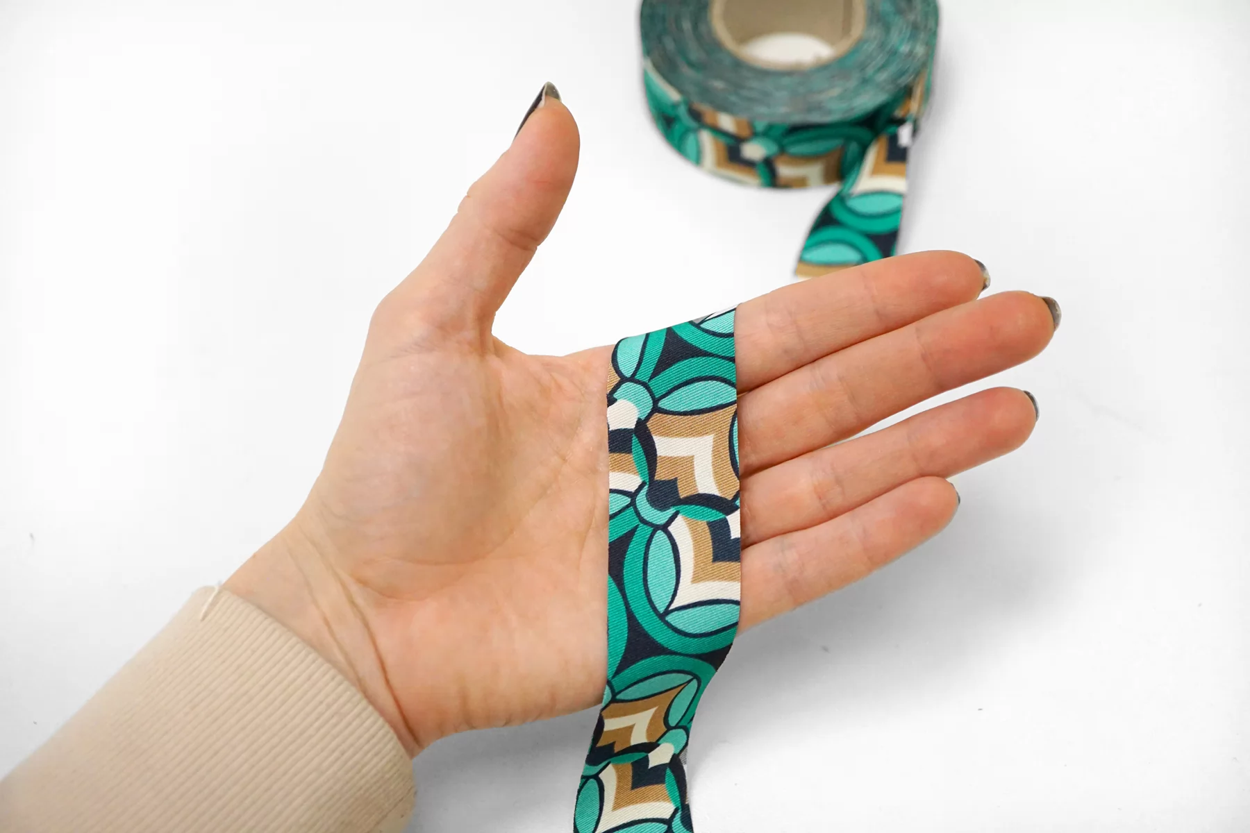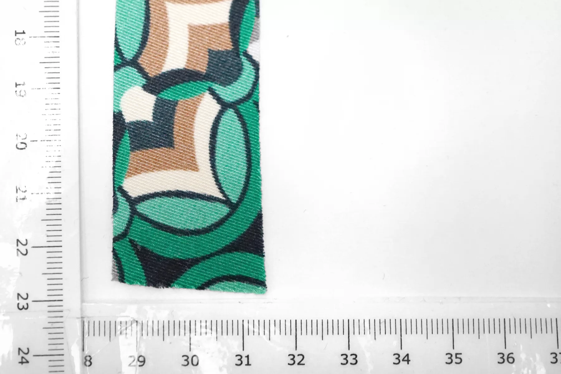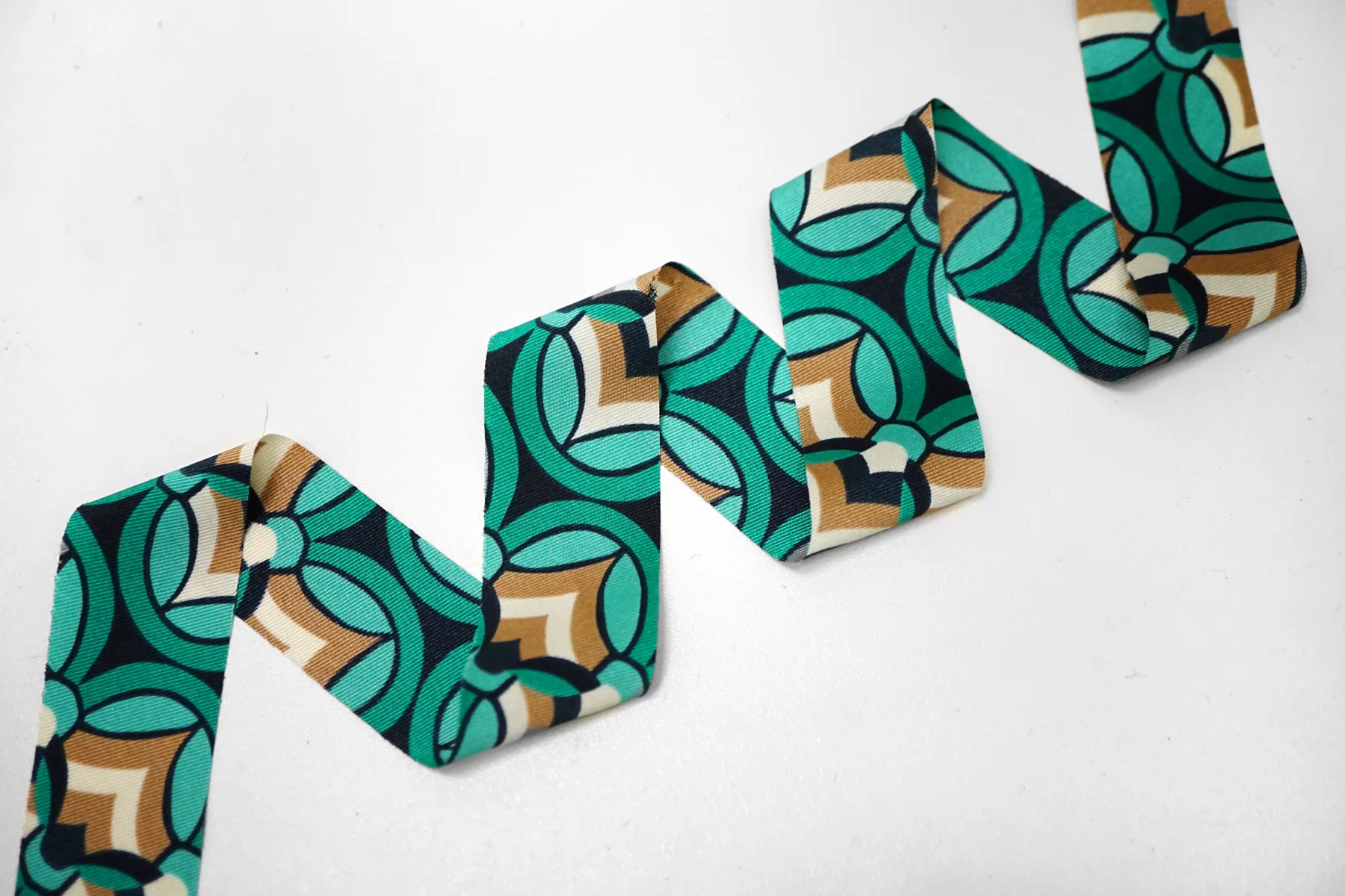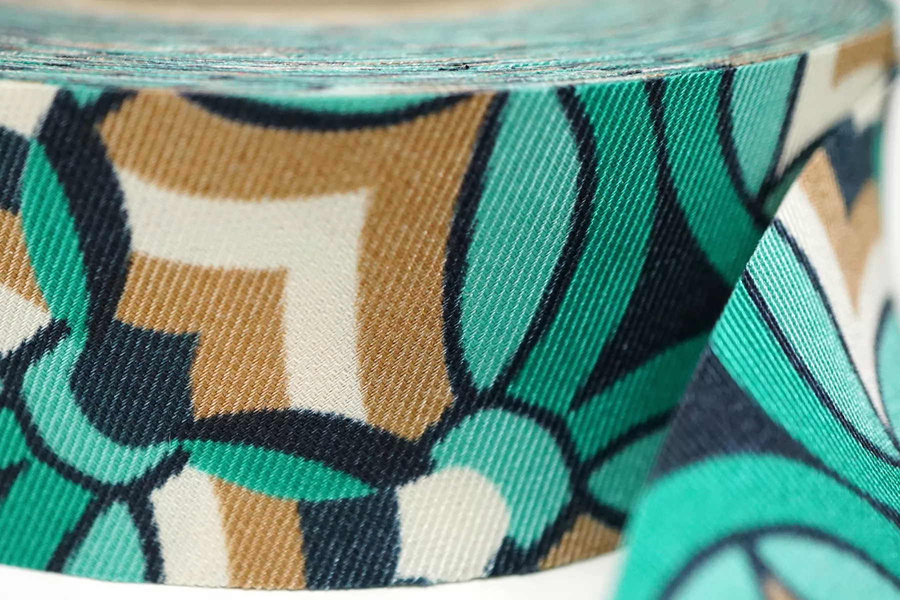 Косая бейка из полиэстера, абстрактный принт: сочетание кремового, зелёного и бежевого цветов. Плетение твиловое. Ширина - 3 см, выкроенная по косой, БЕЗ подгибок.