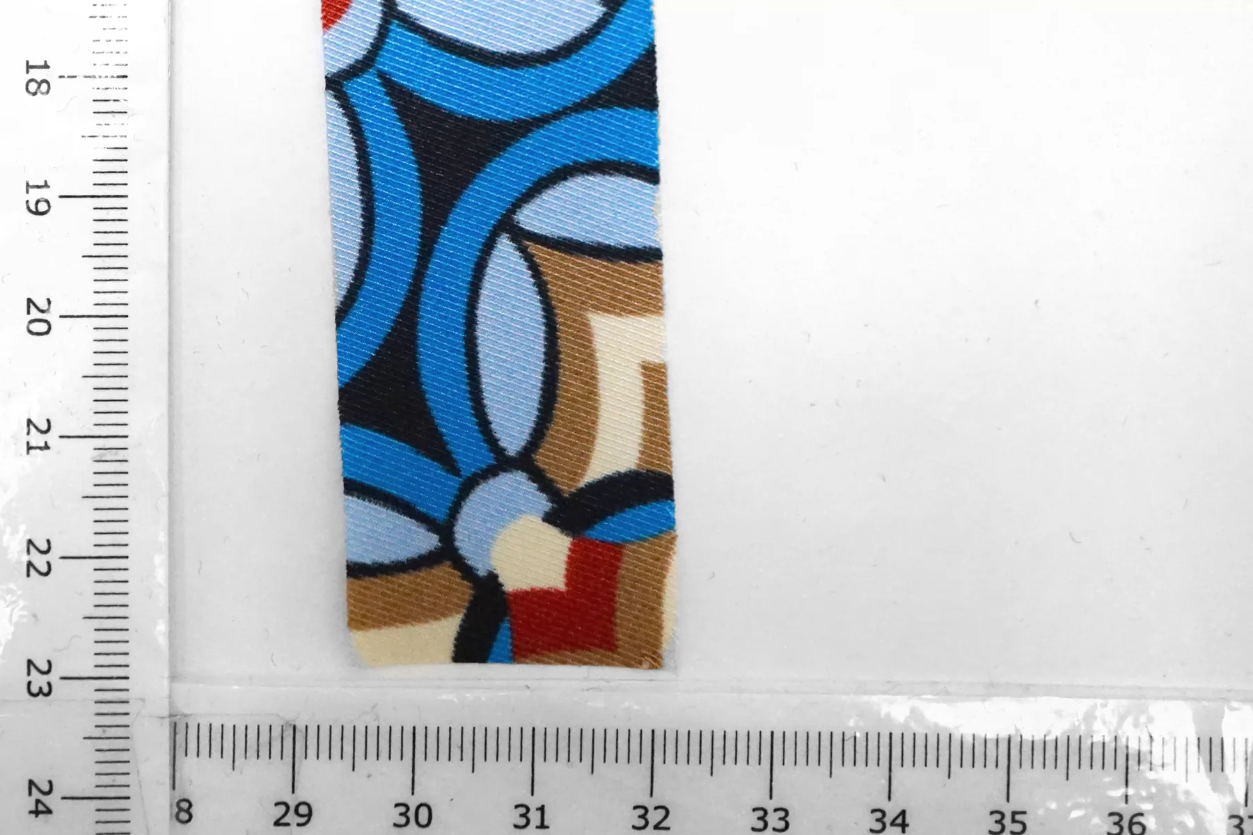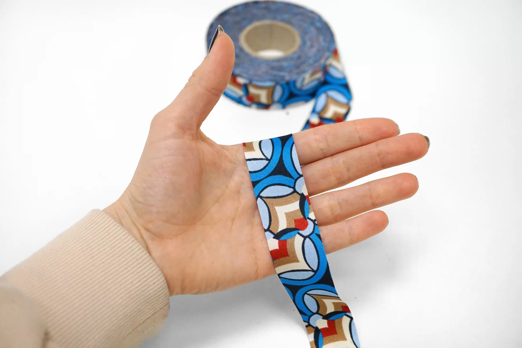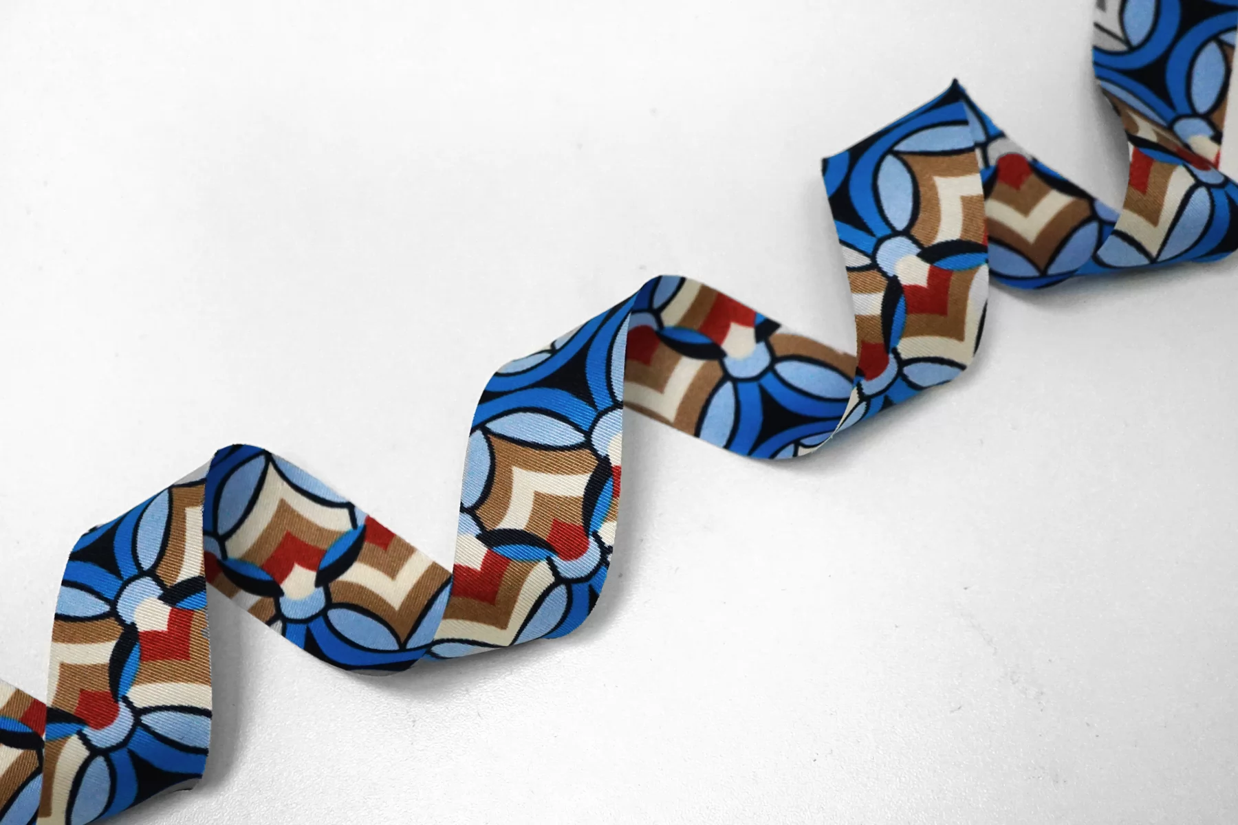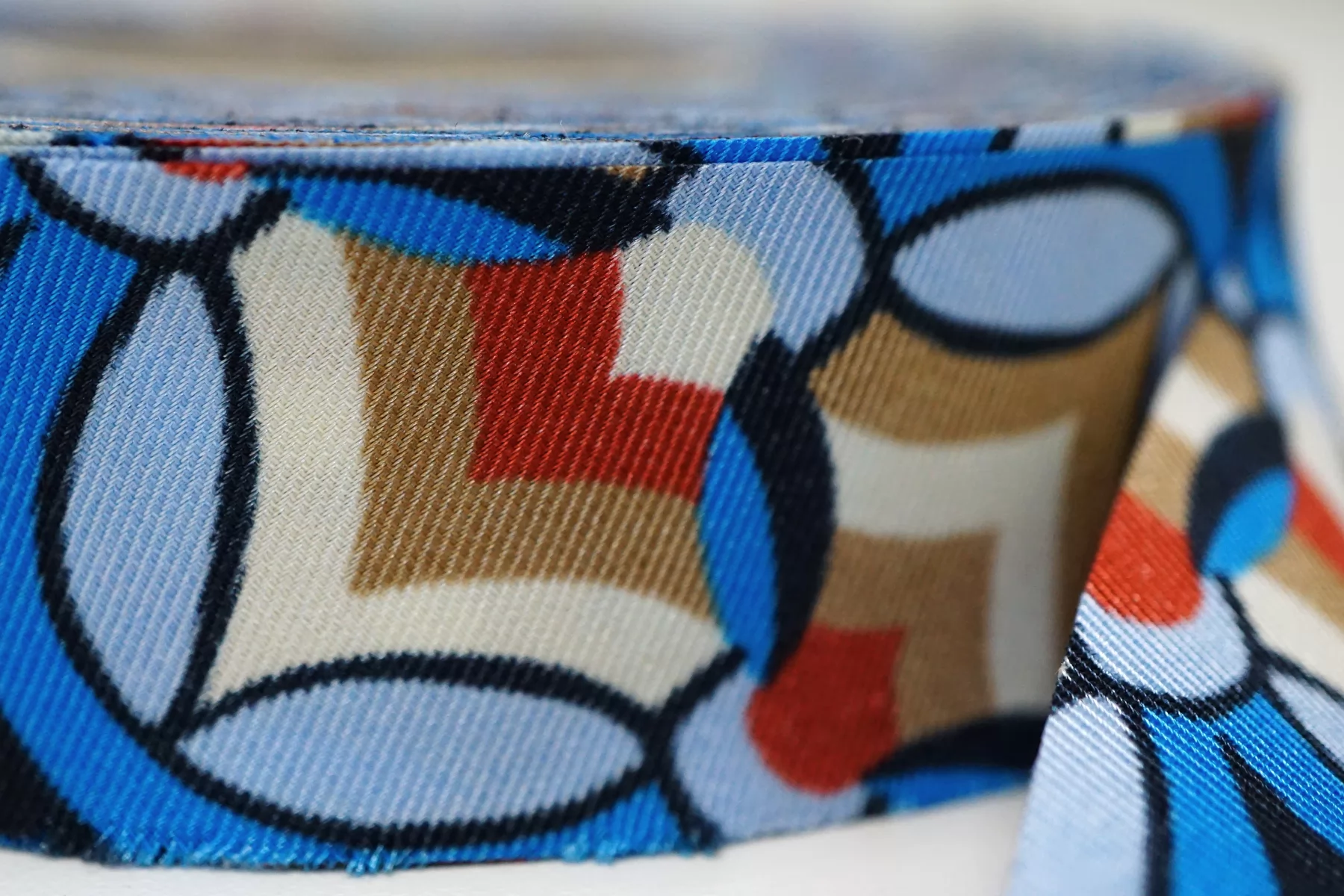 Косая бейка из полиэстера, абстрактный принт: сочетание кремового, синего и бежевого цветов. Плетение твиловое. Ширина - 3 см, выкроенная по косой, БЕЗ подгибок.