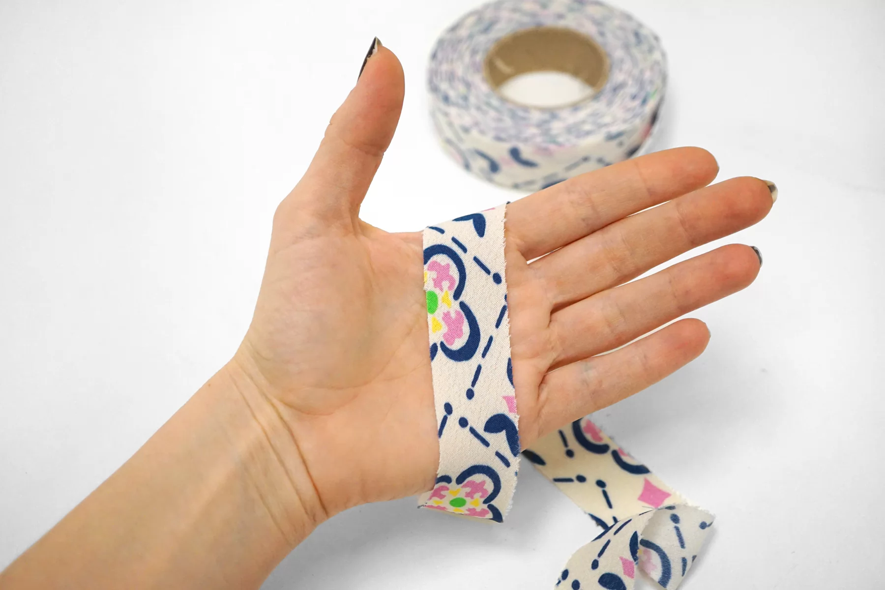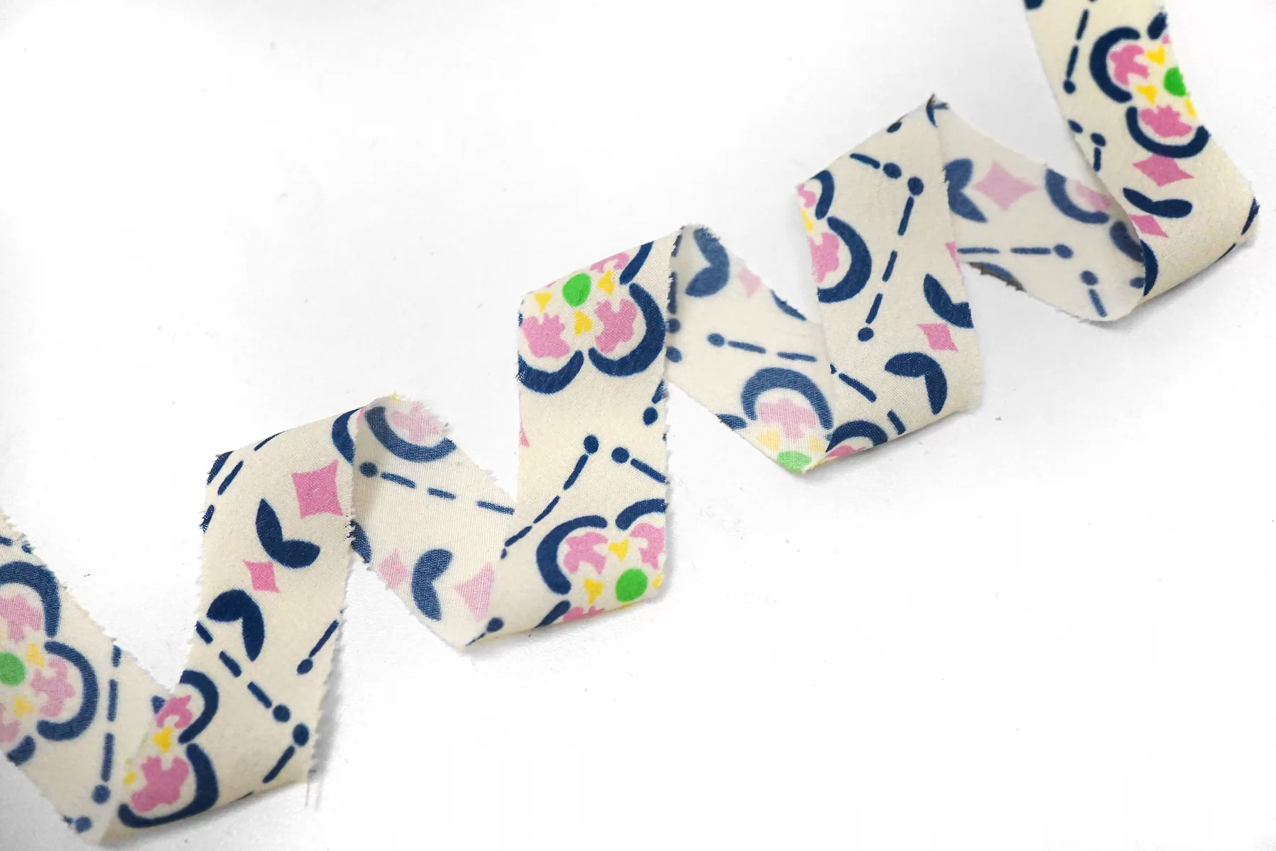 Косая бейка из вискозы, абстрактный сине-розовый принт на молочном фоне. Ширина - 2.5 см, выкроенная по косой, БЕЗ подгибок.