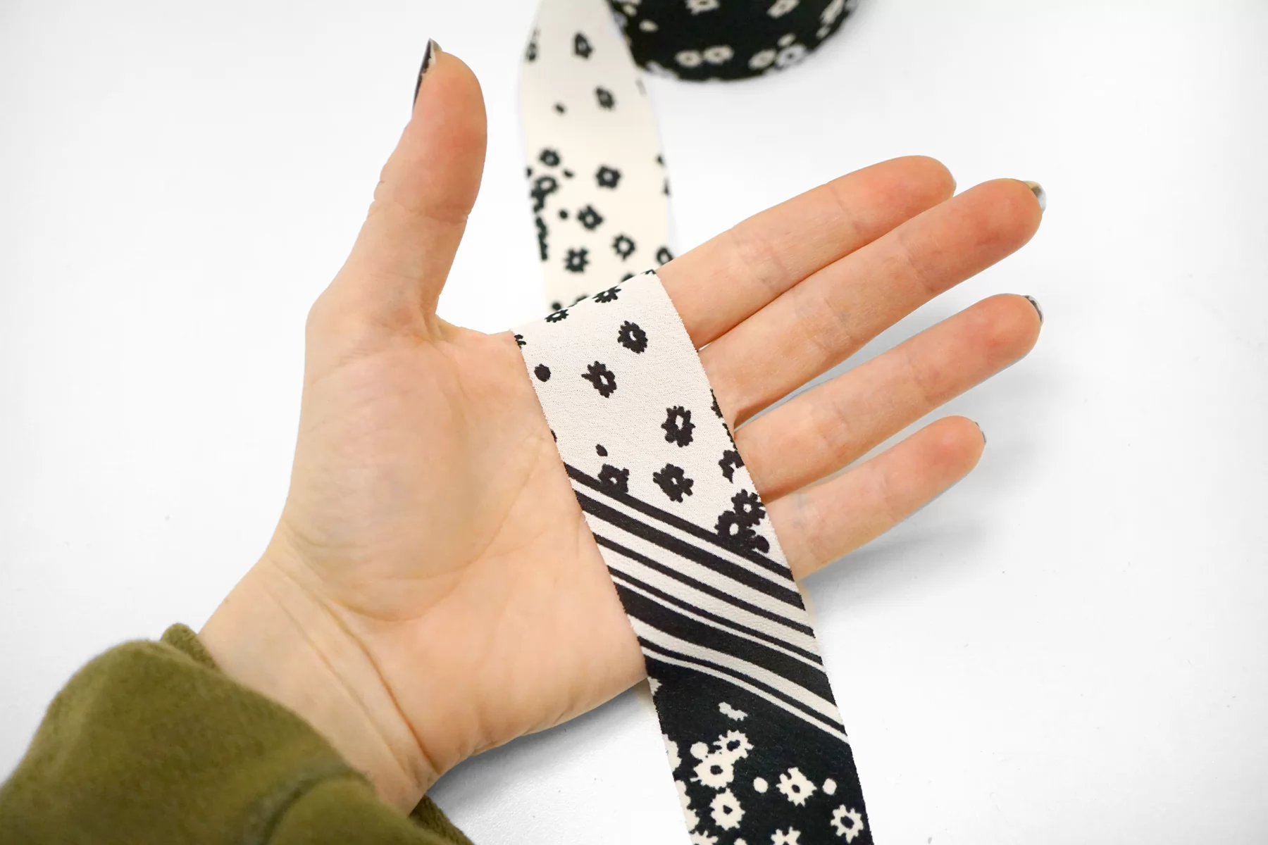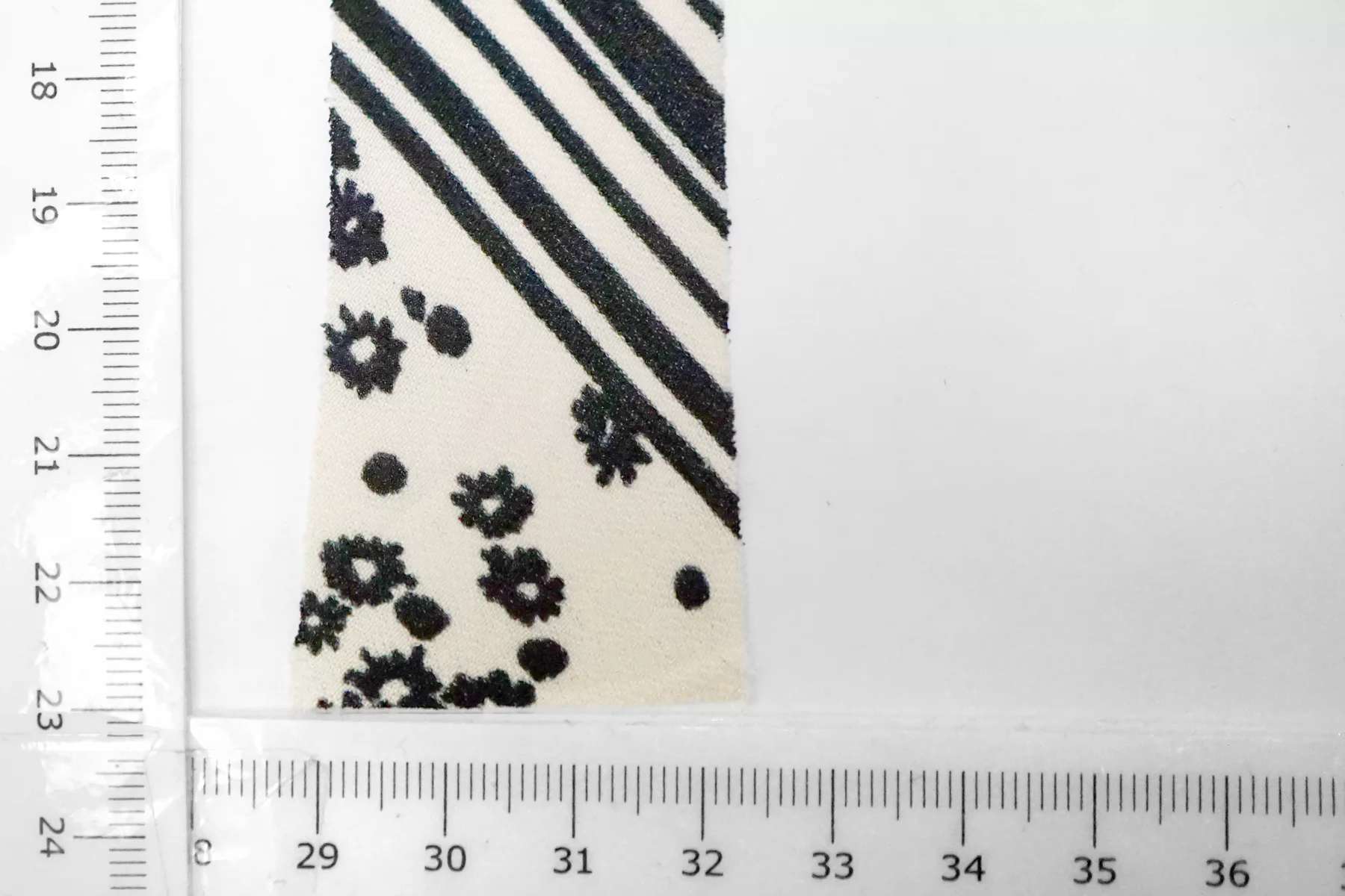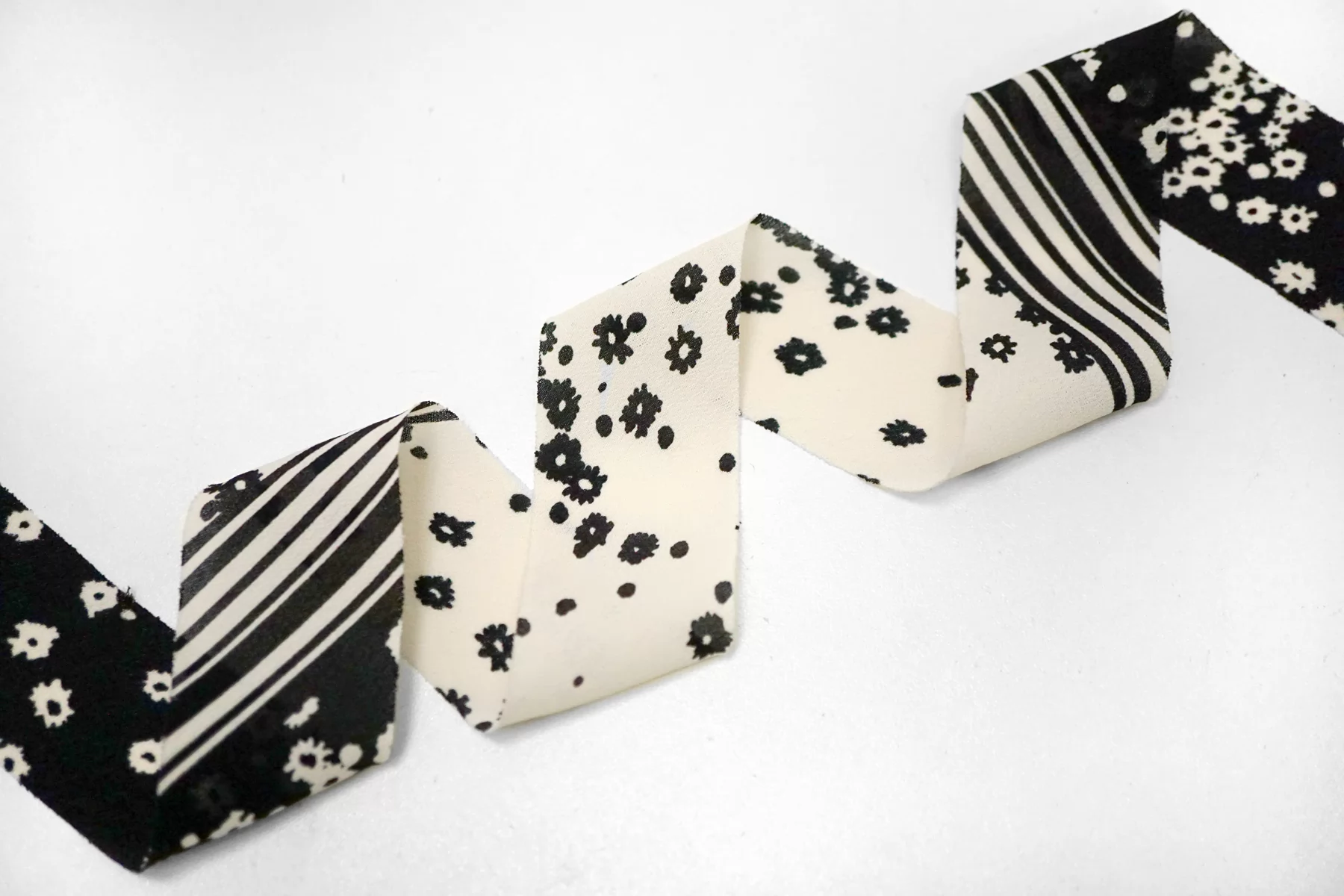 Косая бейка из вискозы, чёрный цветочный принт на молочном фоне. Ширина - 3.2 см, выкроенная по косой, БЕЗ подгибок.