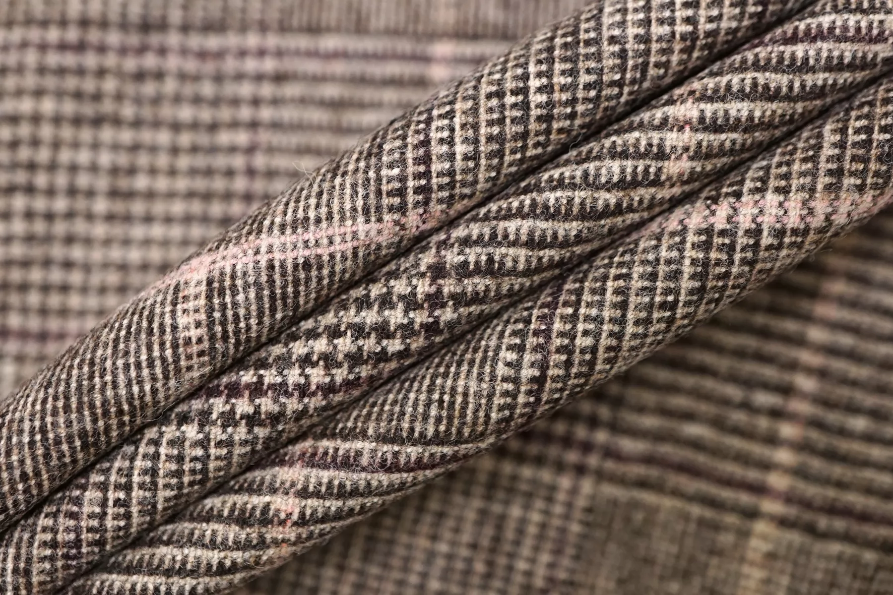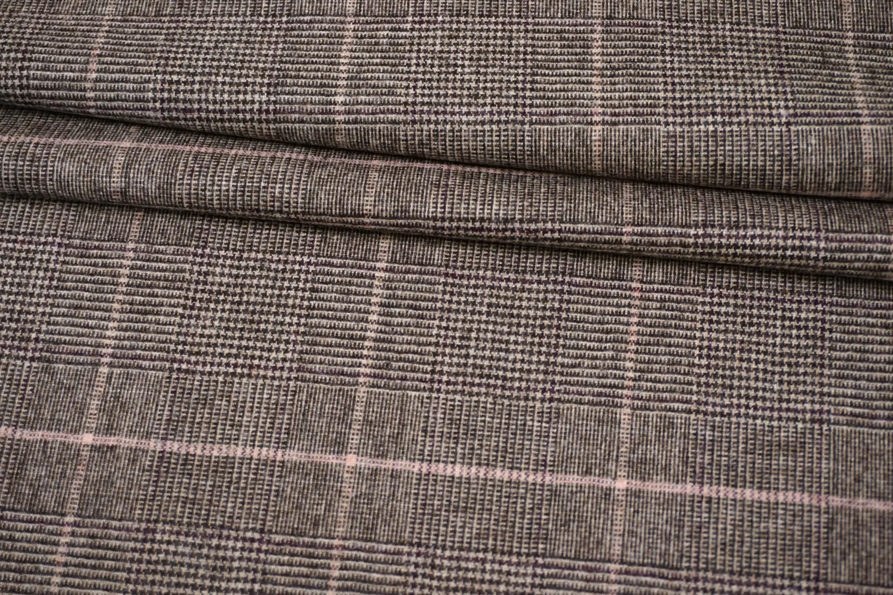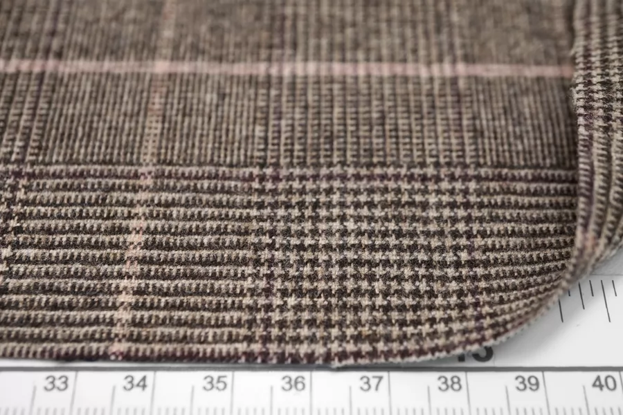 Классная костюмная вирджинская шерсть, с узором клеткой и пепитой, нити тёмно-коричневого, светло-бежевого и розового цвета. Тактильно очень мягкая и приятная, ворсистая, не колется. Тянется. Не просвечивает. Не мнется. Пластичная но при этом держит форму. Шьем костюмы, юбки, брюки, или теплые рубашки верхнего слоя. Уход деликатный.