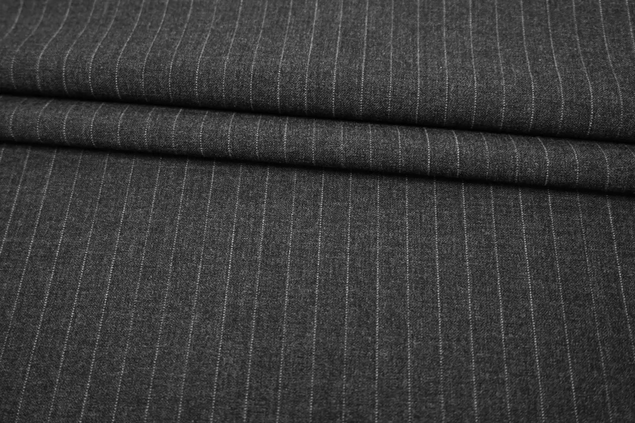 Костюмная поливискоза би-стрейч серого цвета в тонкую светло-серую полоску (вдоль кромки). Приятная тактильно. Пластичная, тянется во все стороны, не просвечивает. Ткань проста в уходе и износостойка. Подойдет для пошива классических костюмов, платья, юбки, мягких жакетов и легких пальто. Во избежание появления катышек рекомендуем бережный отжим!