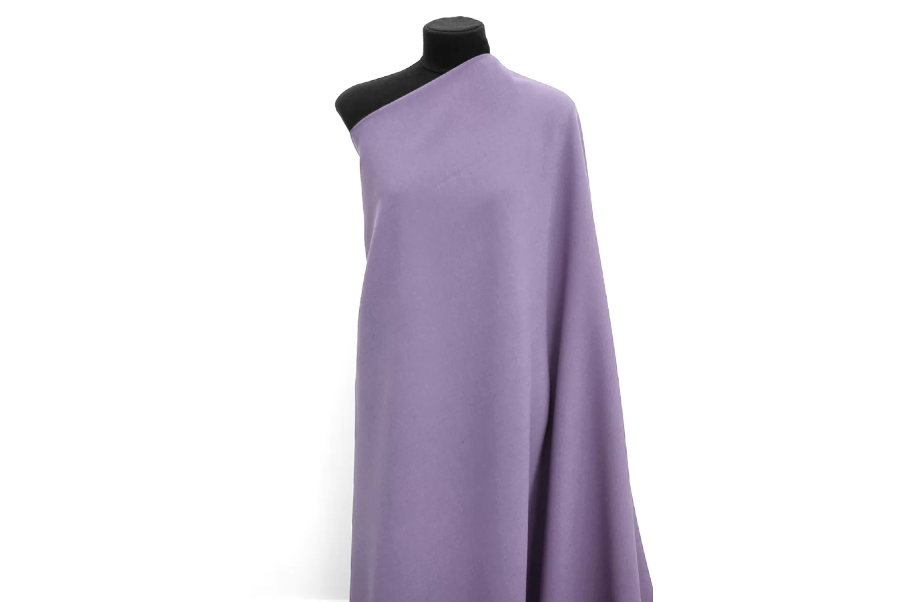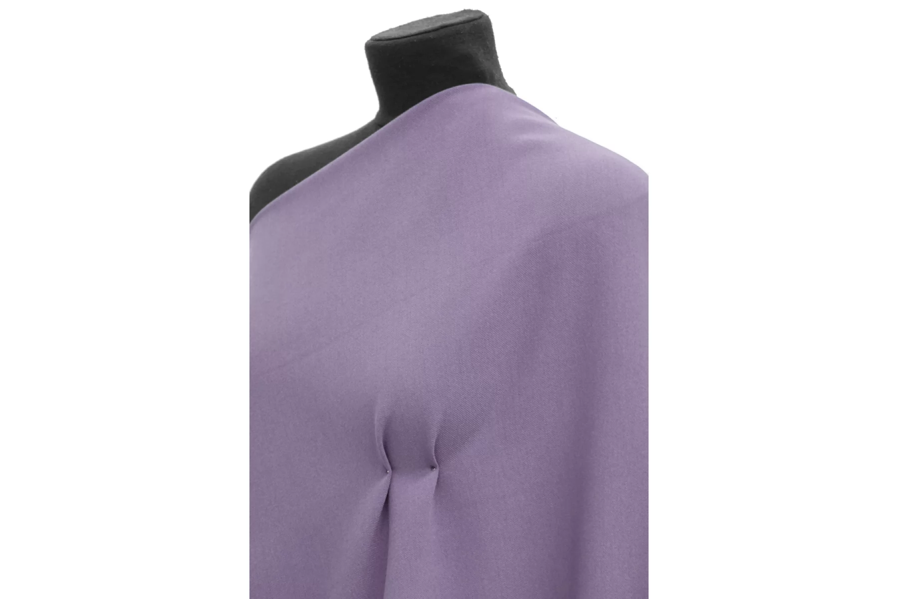 Костюмная поливискоза би-стрейч лилового оттенка. Приятная и креповая наощупь. Пластичная, тянется во все стороны, не просвечивает. Ткань проста в уходе и износостойка. Хорошо драпируется и не вытягивается в локтях и коленях. Подойдет для пошива классических костюмов, платья, юбки, мягких жакетов и легких пальто. Во избежании появления катышек рекомендуем бережный отжим!