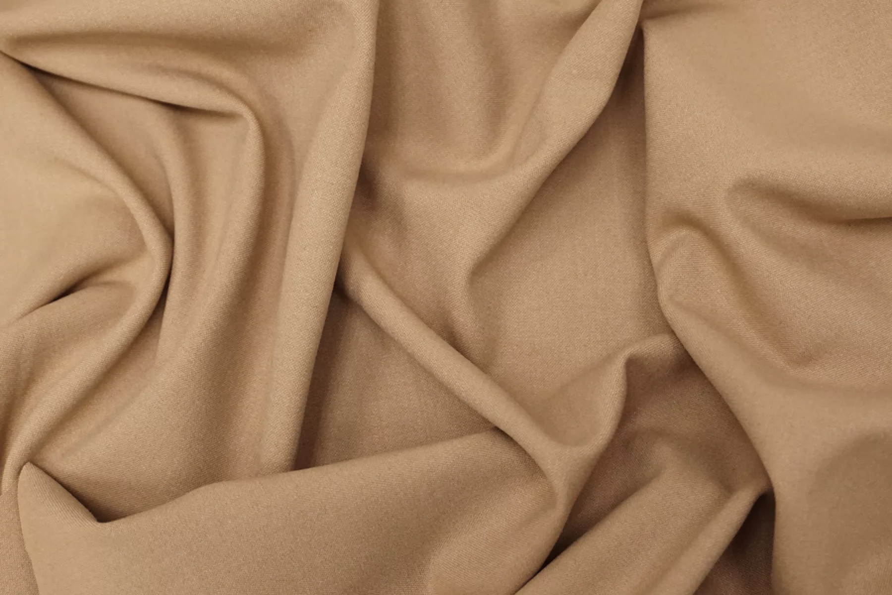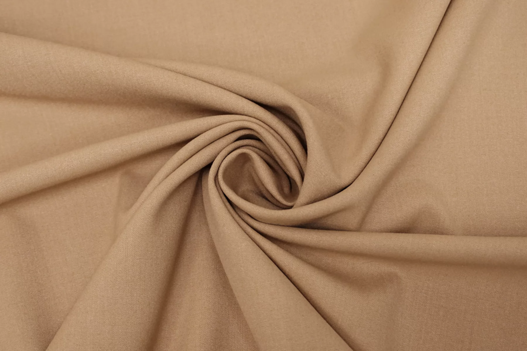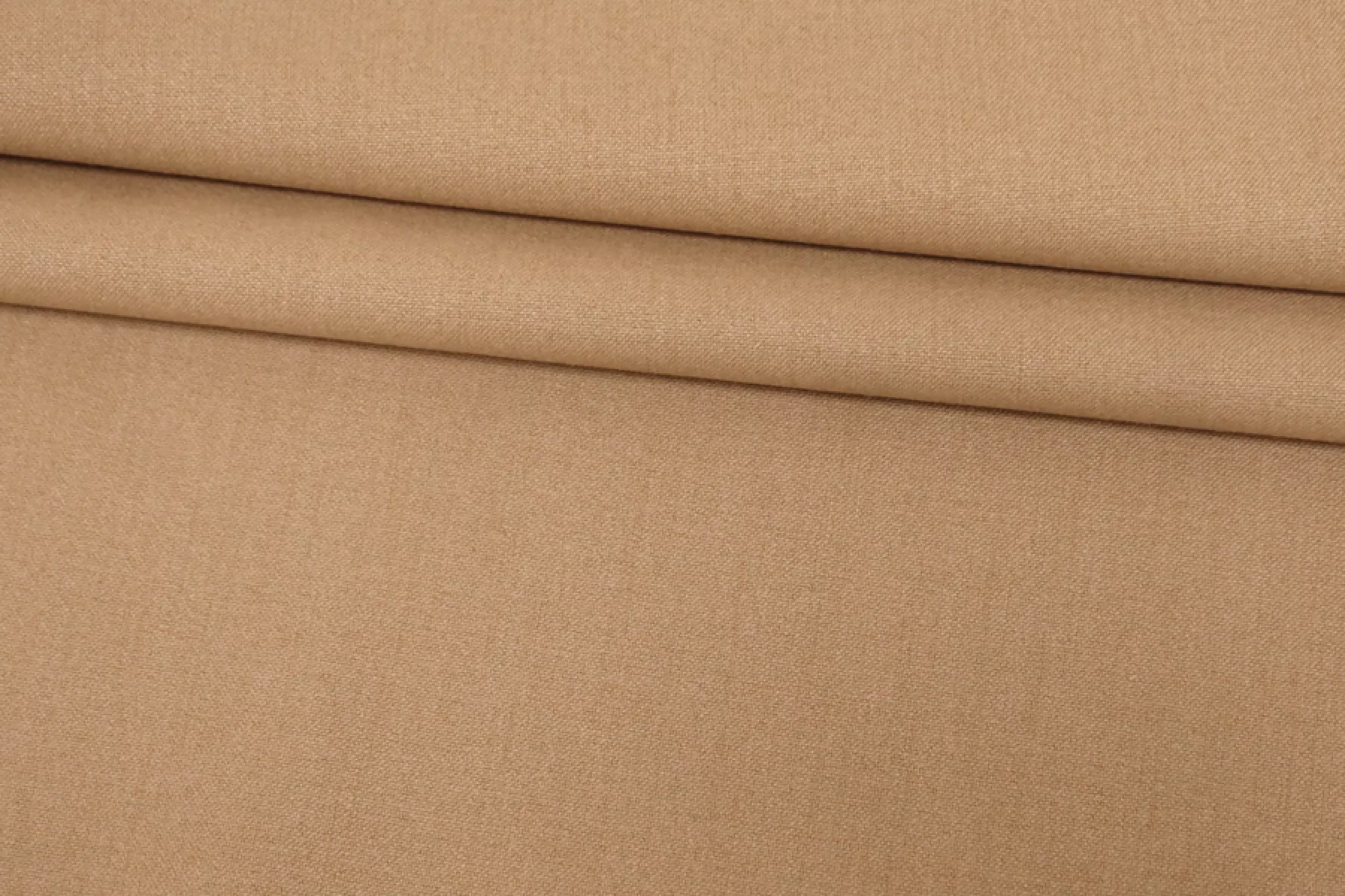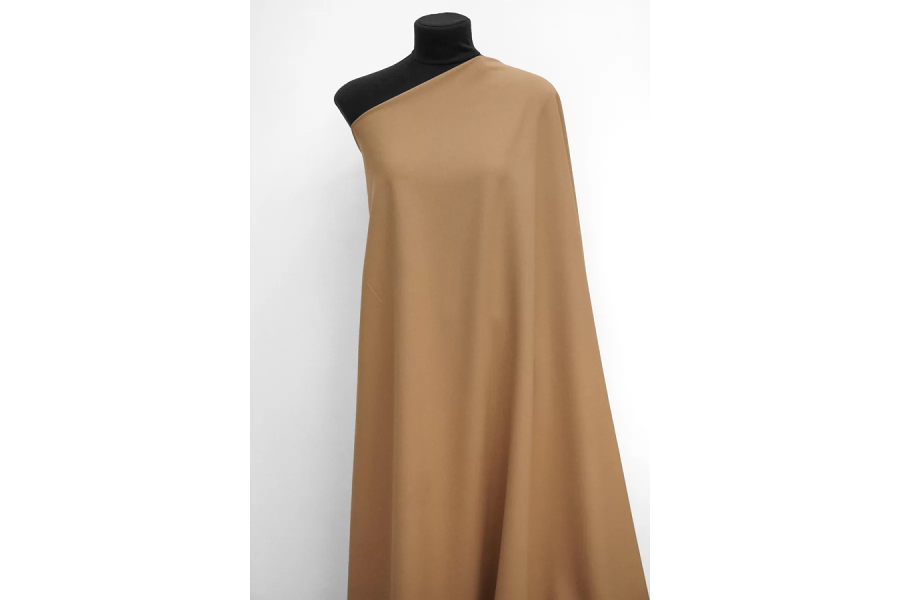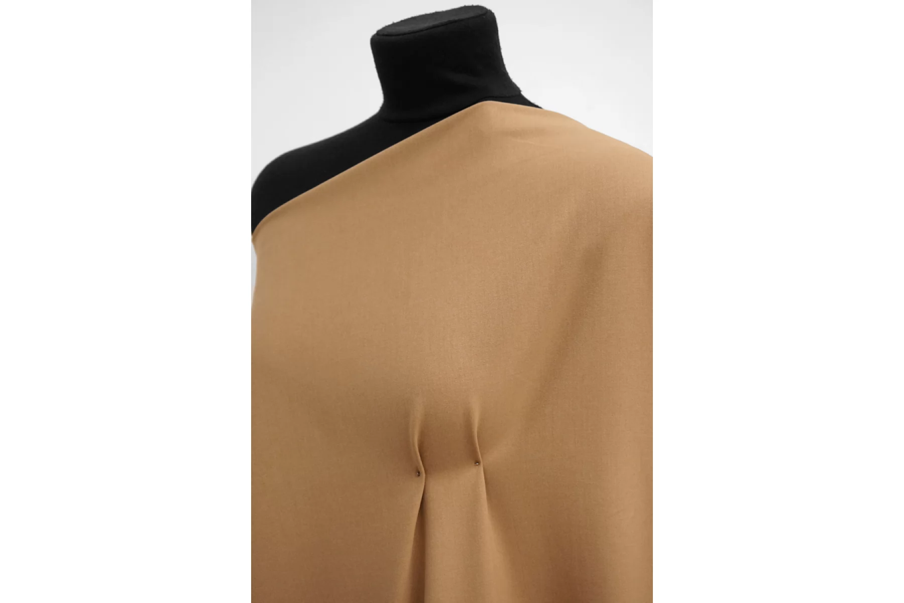 Костюмная поливискоза Max Mara в оттенке кэмел. Материал плотный, приятный наощупь, мягкий. Пластичный, хорошо тянется, не просвечивает. Форму держит слабо. Красиво драпируется. Подойдет для пошива костюма, брюк, платья, юбки, жакета.