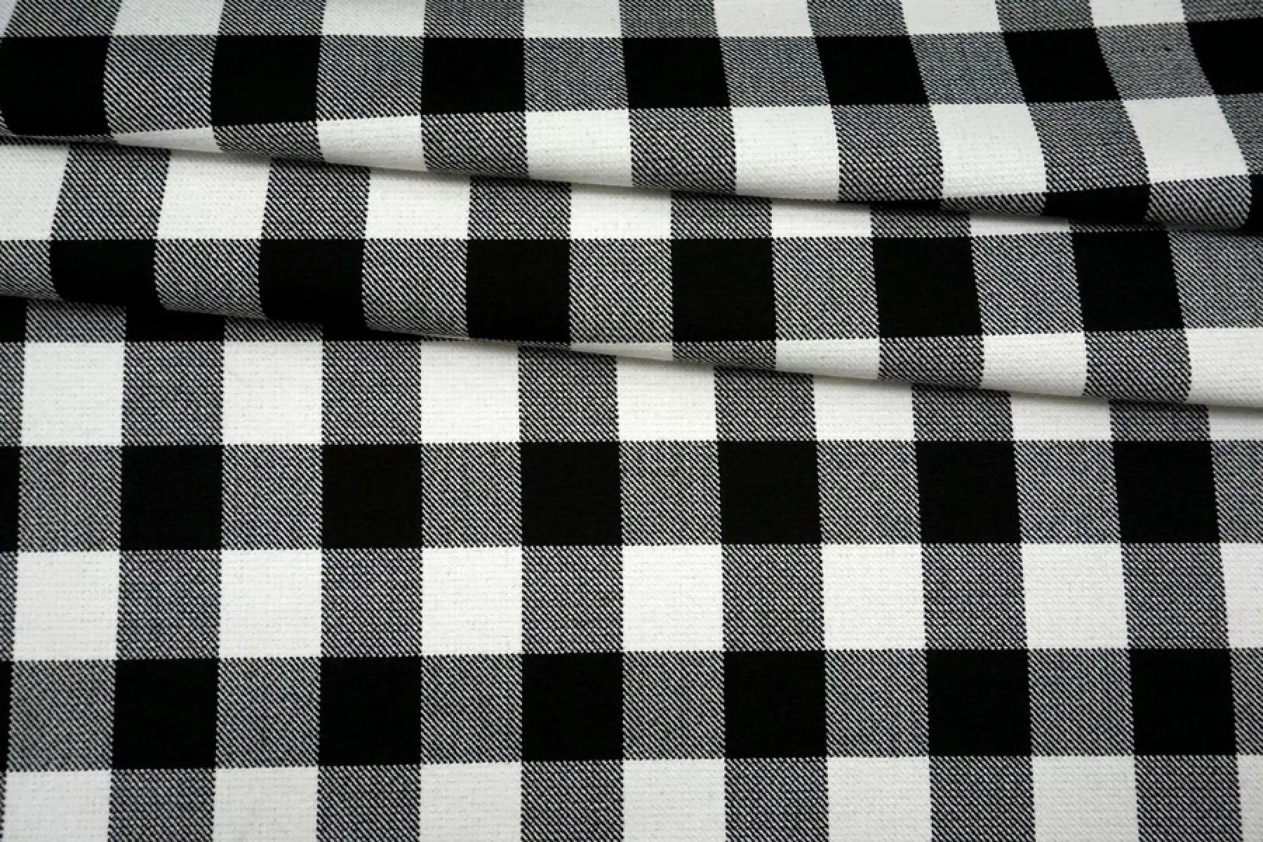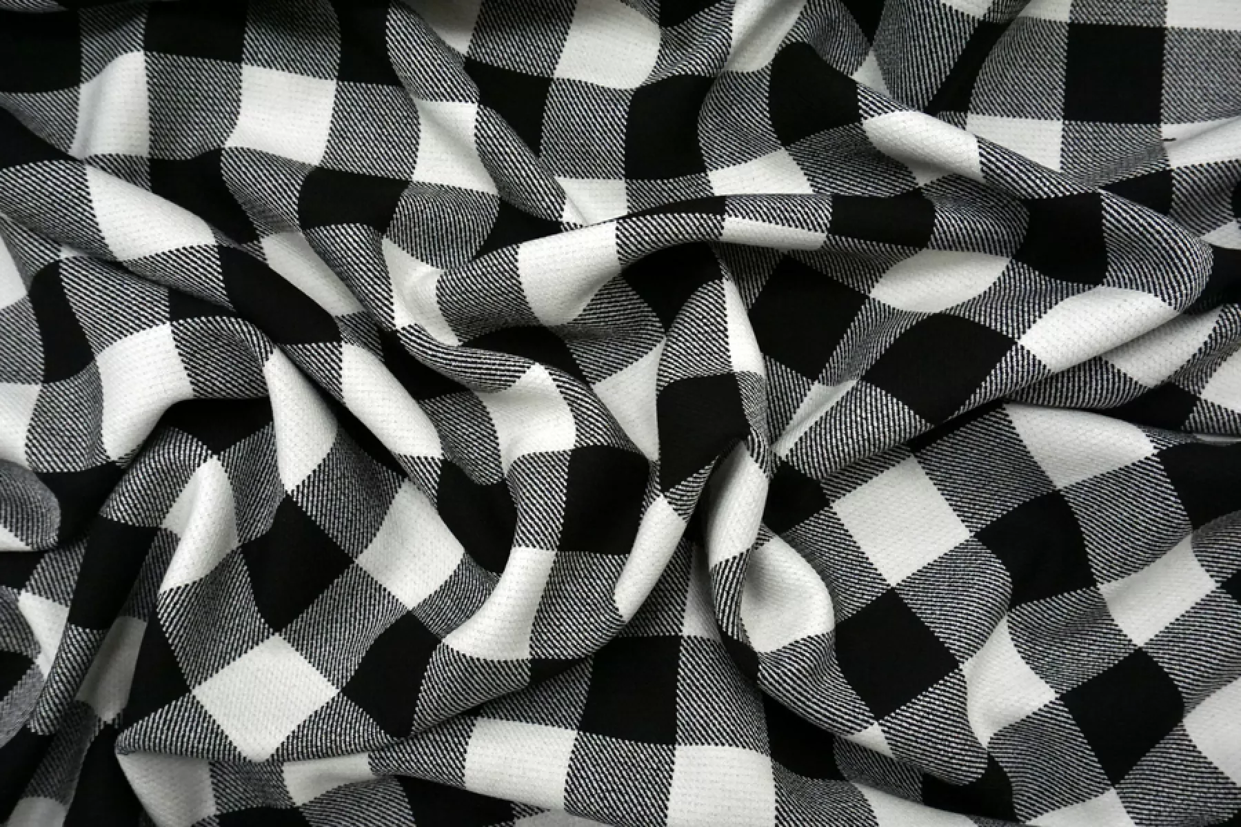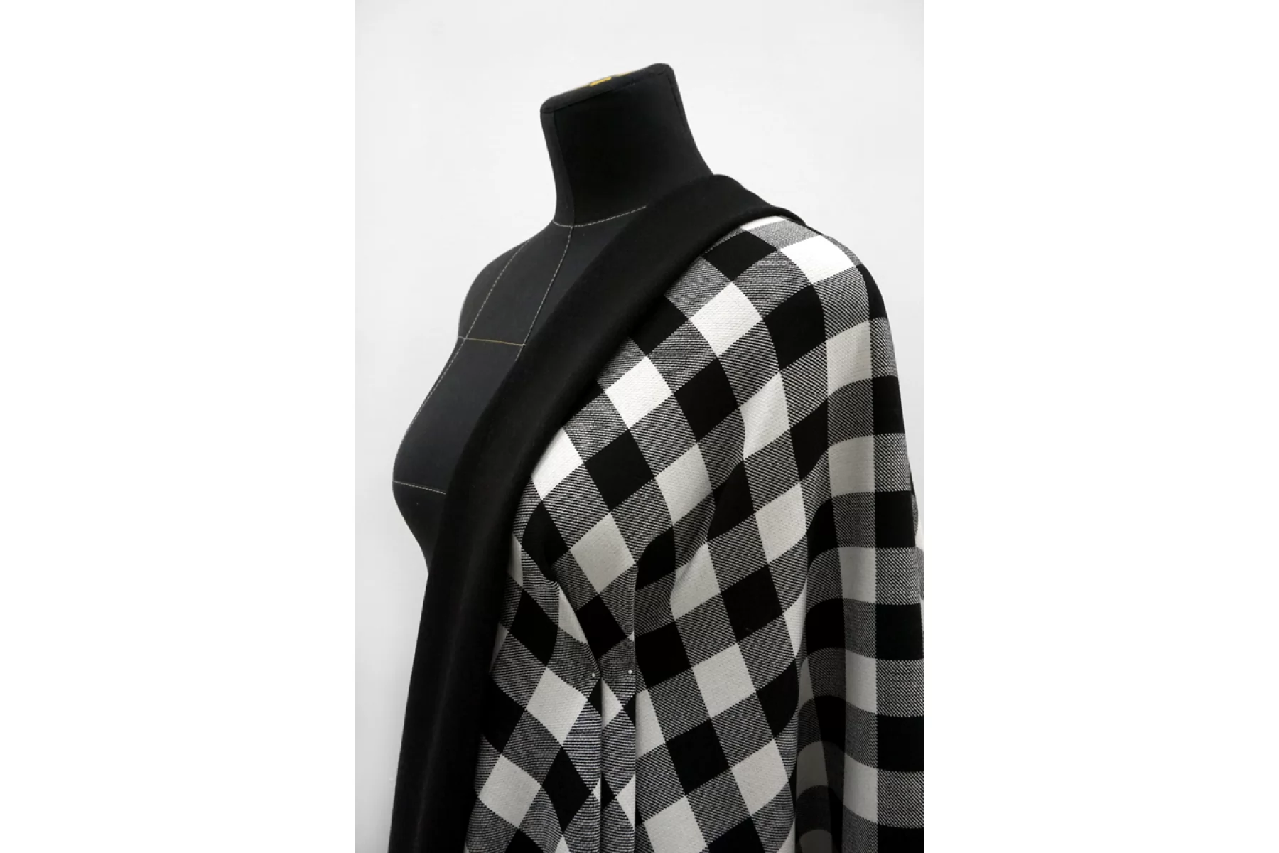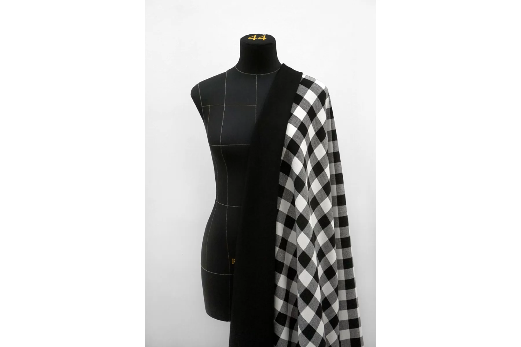 Костюмная поливискоза с узором-клеткой из нитей белого и черного цвета. Сама ткань двухслойная и двусторонняя, слои достаточно легко разделяются, нужно аккуратно подрезать соединительную нить (можно использовать для закрытых швов). Пластичная, тянется, не просвечивает, поверхность тактильно приятная. Подойдет для пошива костюма, брюк, платья, юбки, жакета.
