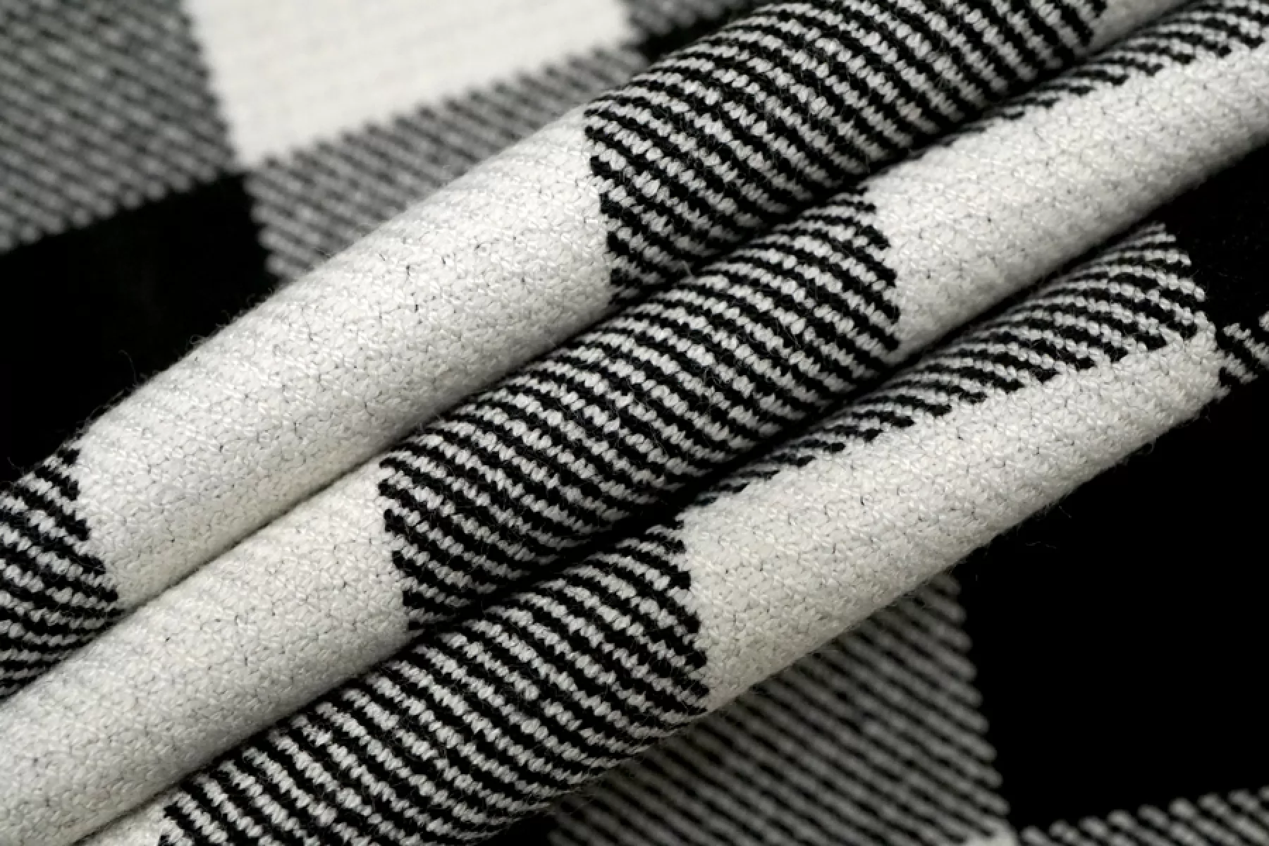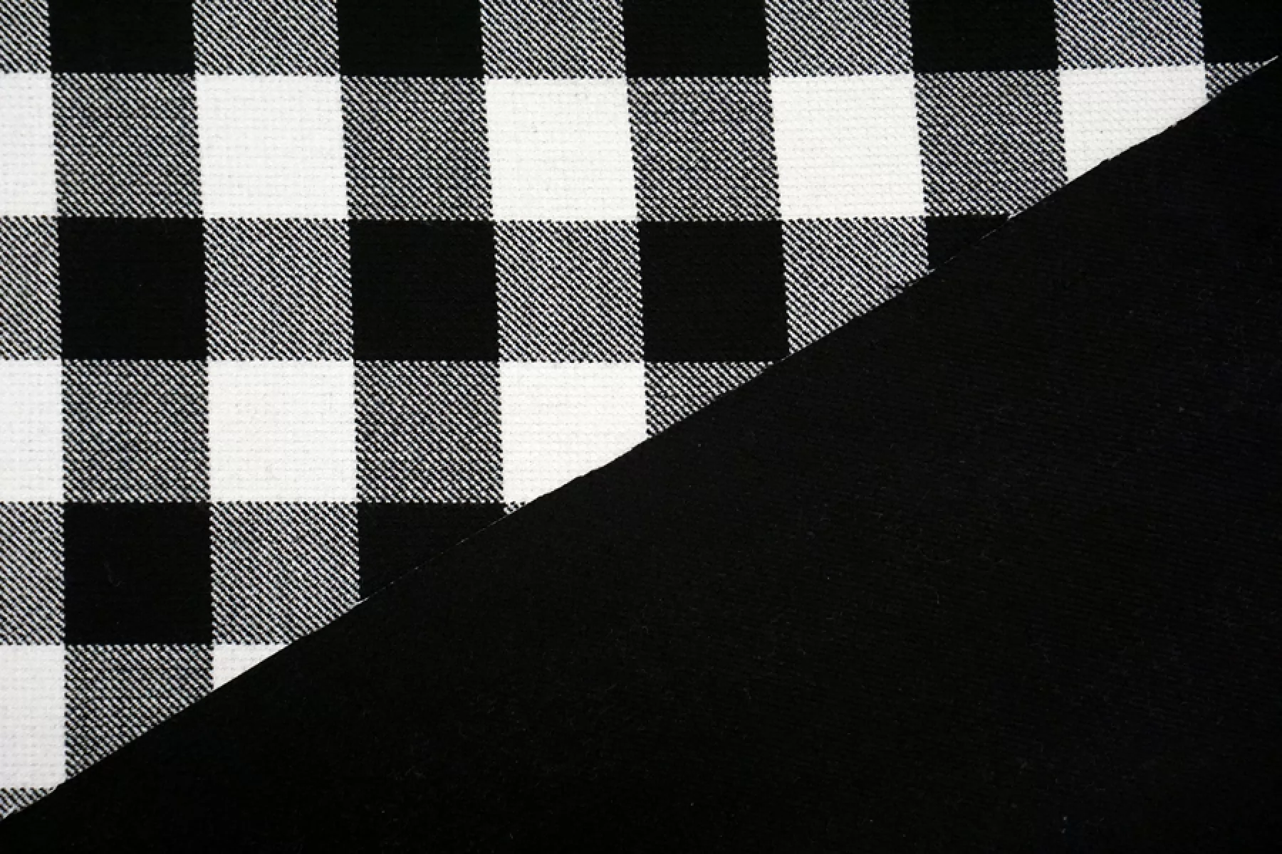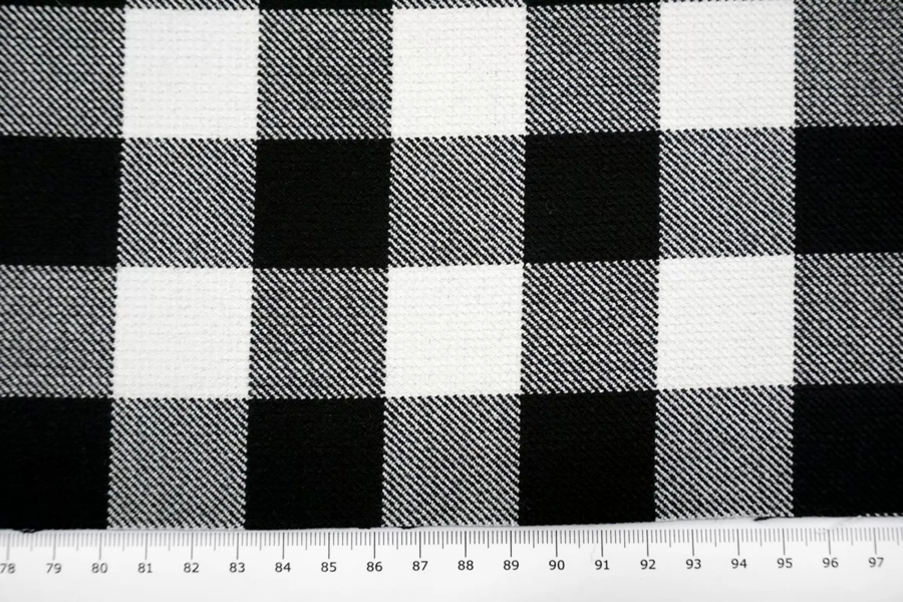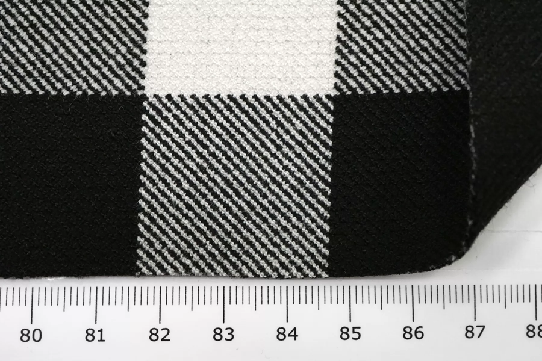 Костюмная поливискоза с узором-клеткой из нитей белого и черного цвета. Сама ткань двухслойная и двусторонняя, слои достаточно легко разделяются, нужно аккуратно подрезать соединительную нить (можно использовать для закрытых швов). Пластичная, тянется, не просвечивает, поверхность тактильно приятная. Подойдет для пошива костюма, брюк, платья, юбки, жакета.