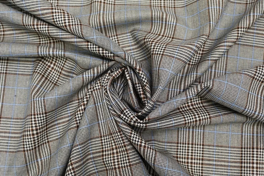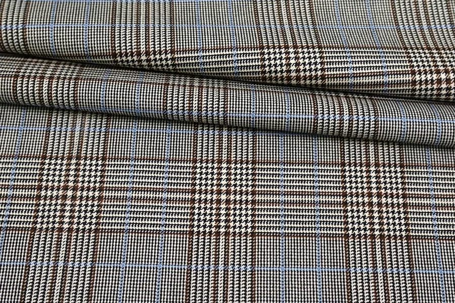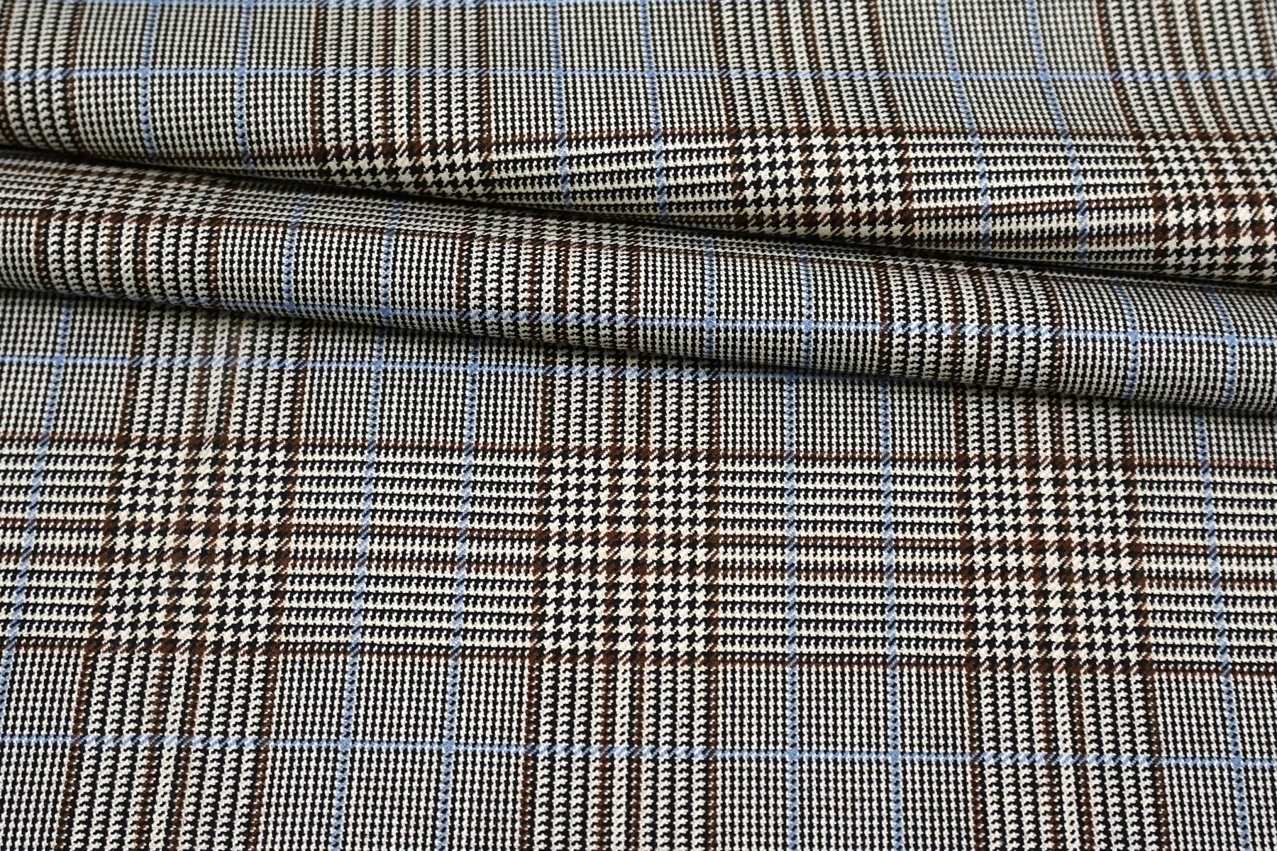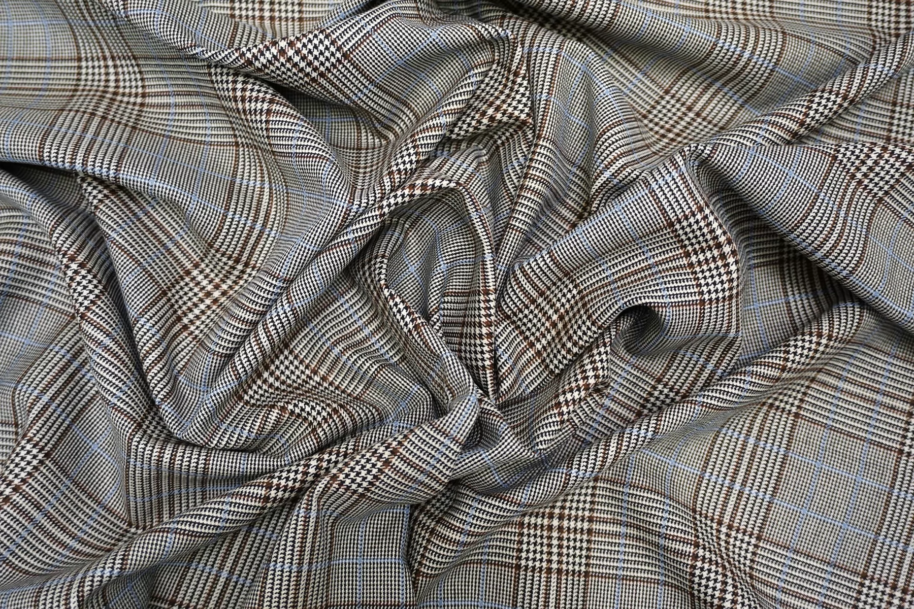 Костюмная поливискоза в клетку и гусиную лапку из чёрных, коричневых, голубых и приглушённо-белых нитей. Материал тактильно приятный и мягкий, гладкий, тонкий, но плотненький, не мнется. Обладает хорошей износостойкостью. Красив в своей пластике. Не просвечивает. Немного держит форму. Хорошо тянется за счет содержания эластана. Шьем жакеты, костюмы, платья, юбки, брюки и не только. Рекомендуется деликатный уход.