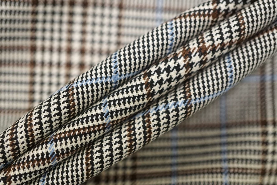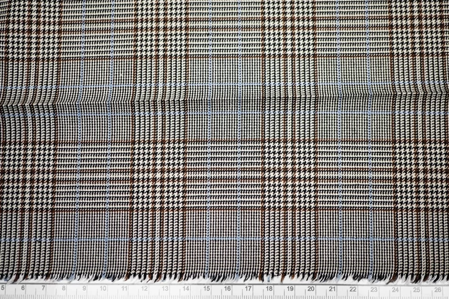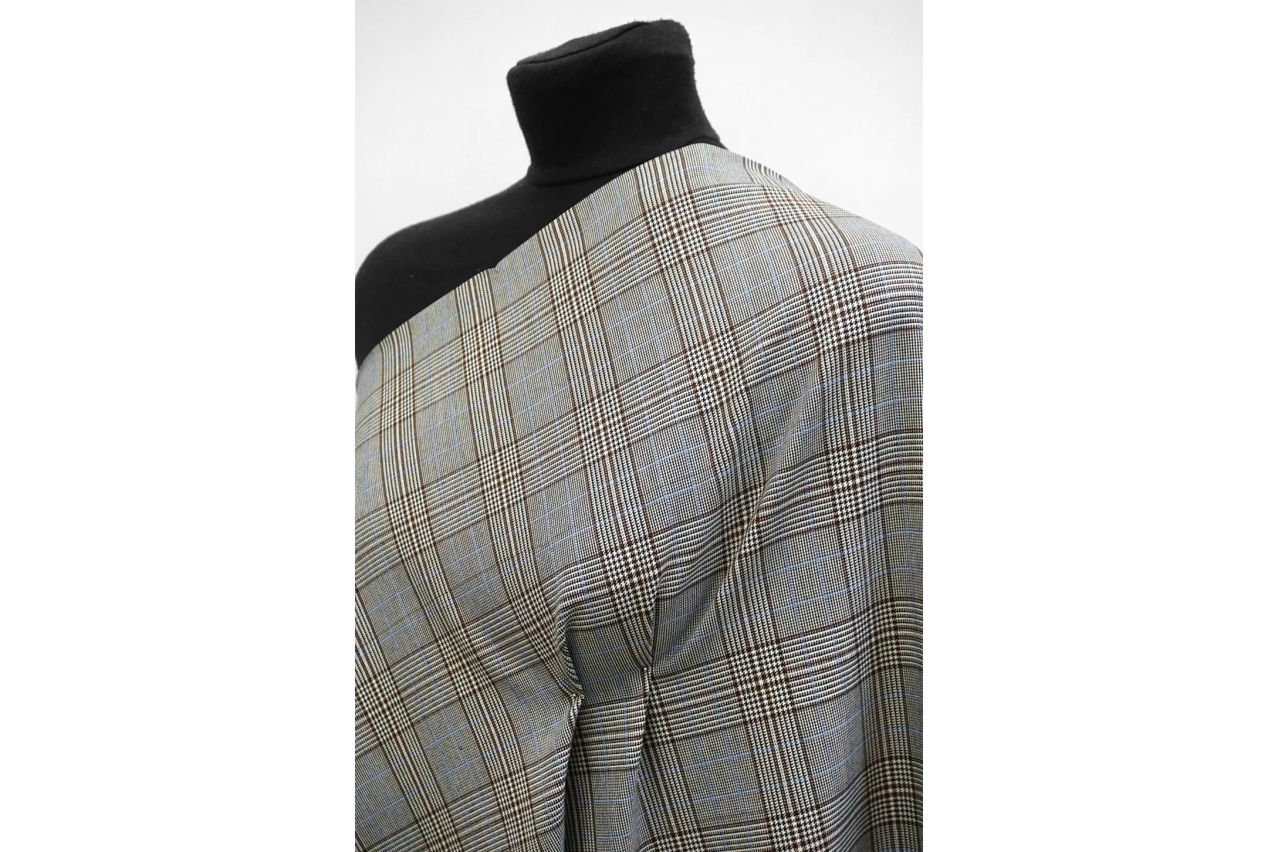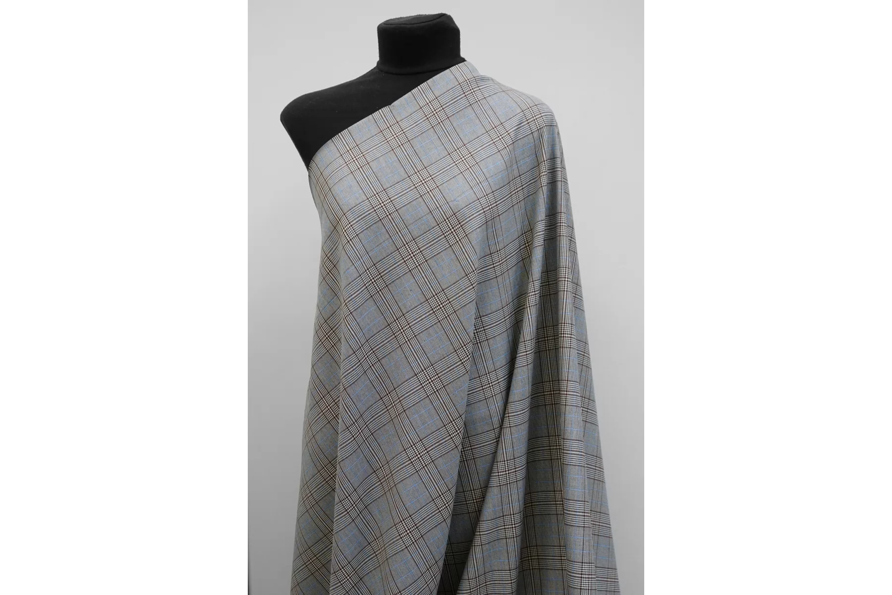 Костюмная поливискоза в клетку и гусиную лапку из чёрных, коричневых, голубых и приглушённо-белых нитей. Материал тактильно приятный и мягкий, гладкий, тонкий, но плотненький, не мнется. Обладает хорошей износостойкостью. Красив в своей пластике. Не просвечивает. Немного держит форму. Хорошо тянется за счет содержания эластана. Шьем жакеты, костюмы, платья, юбки, брюки и не только. Рекомендуется деликатный уход.