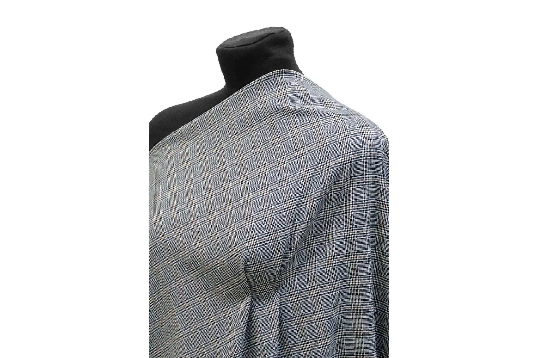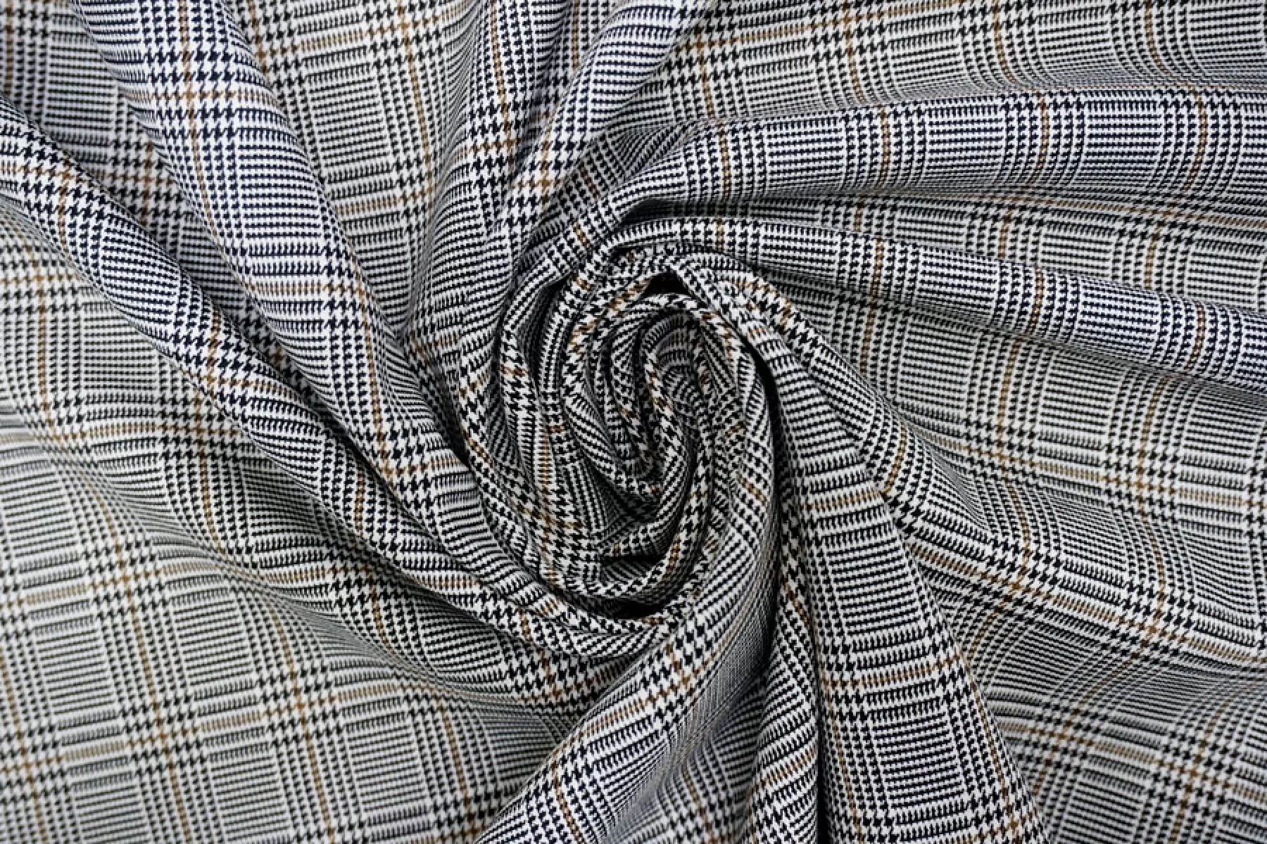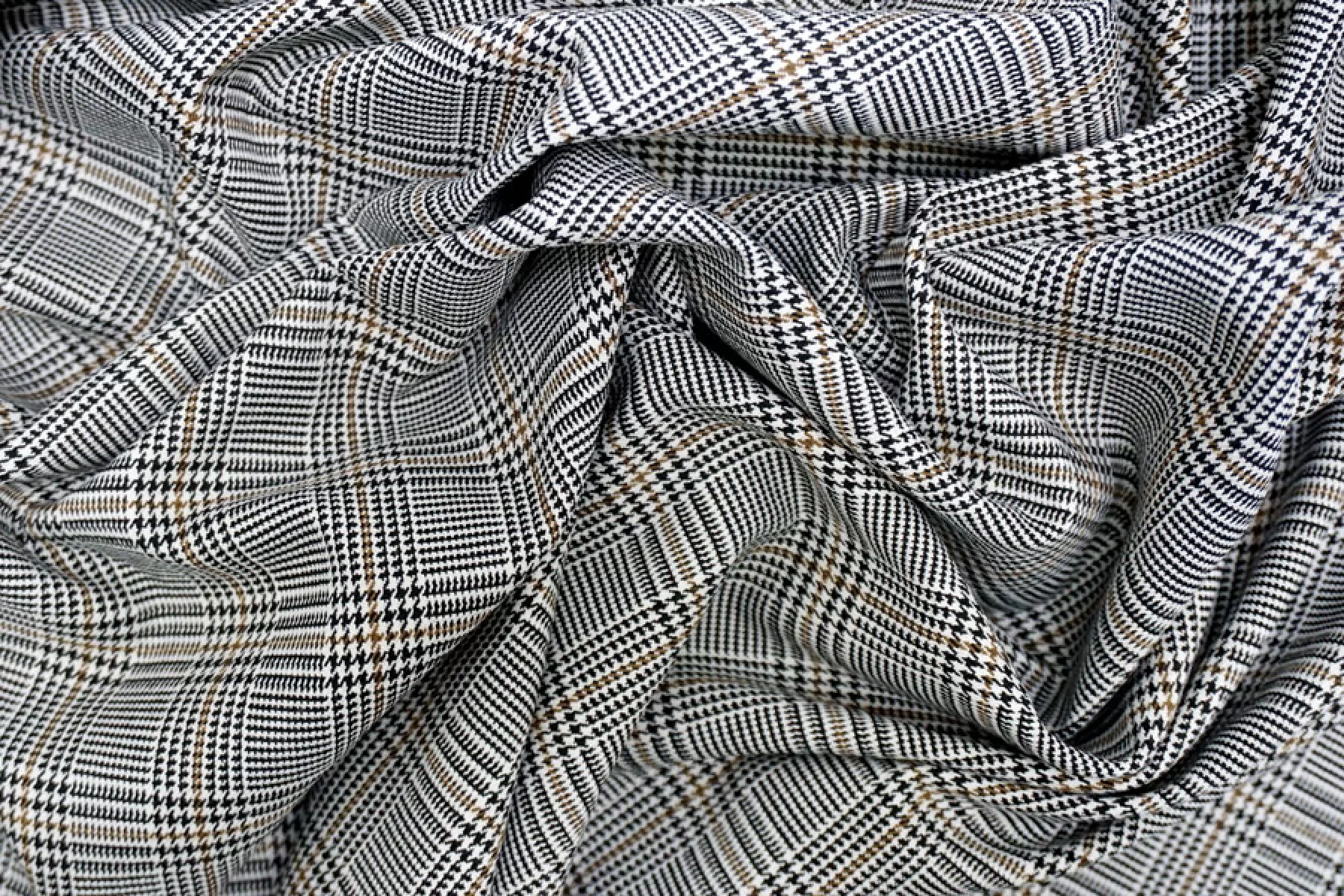Костюмная поливискоза в клетку и гусиную лапку из чёрных, коричневых и белых нитей. Материал тактильно приятный и мягкий, гладкий, тонкий, но плотненький, не мнется. Обладает хорошей износостойкостью. Красив в своей пластике. Не просвечивает. Немного держит форму. Хорошо тянется за счет содержания эластана. Шьем жакеты, костюмы, платья, юбки, брюки и не только. Рекомендуется деликатный уход.