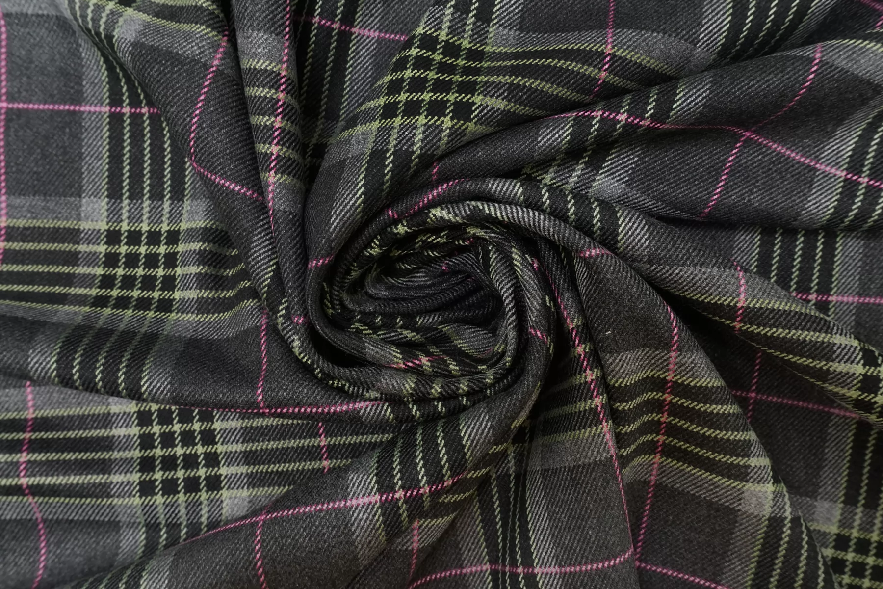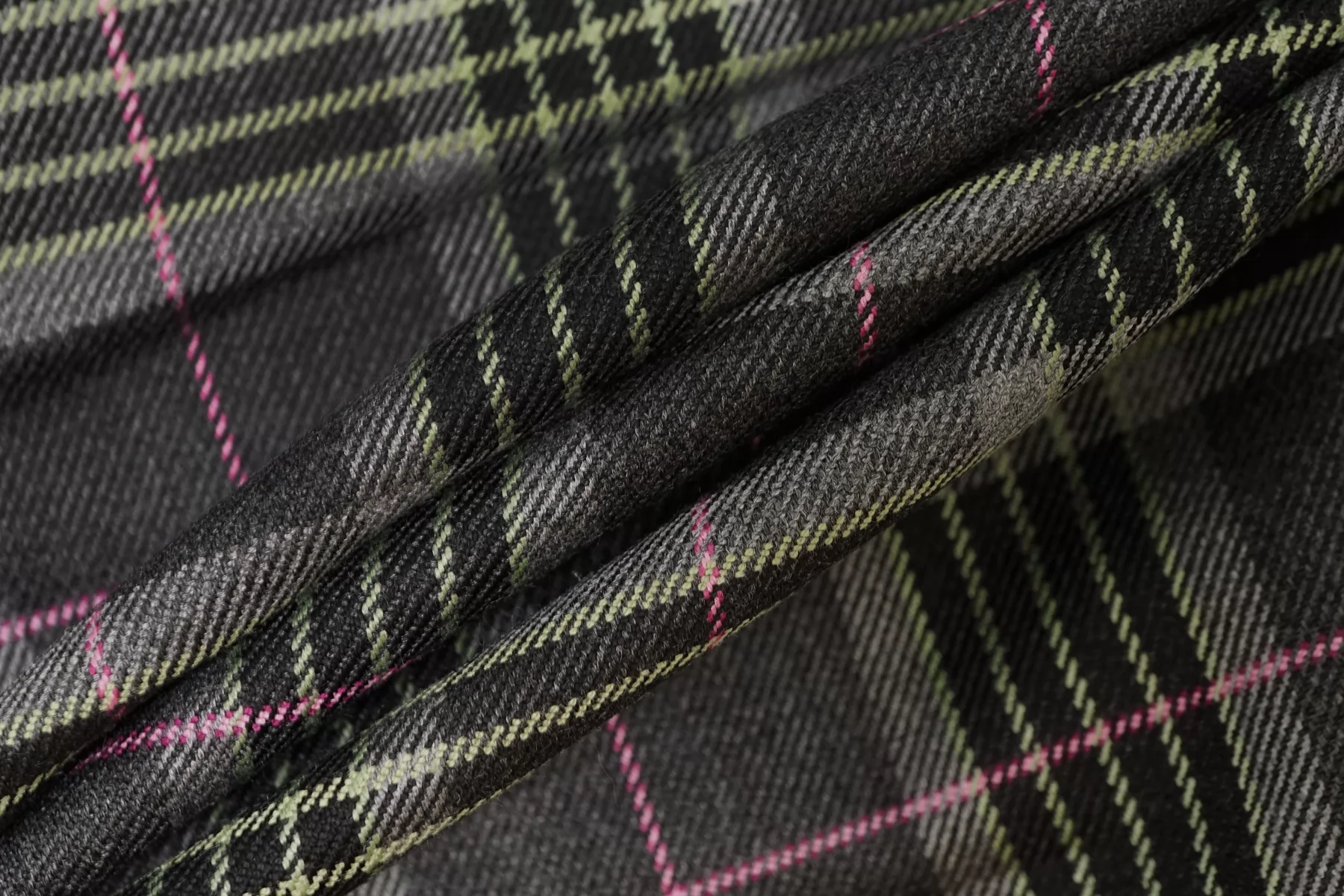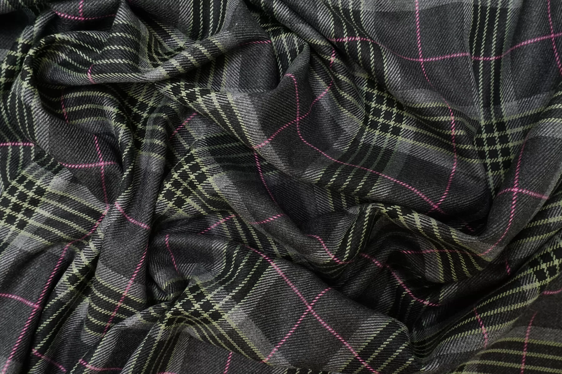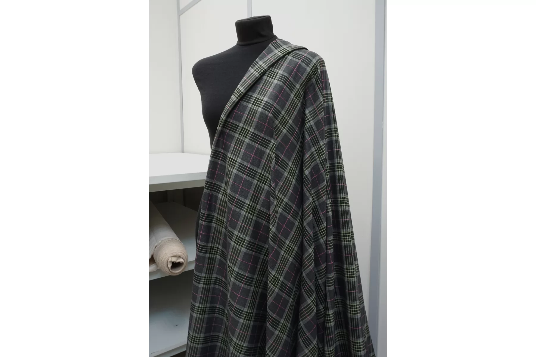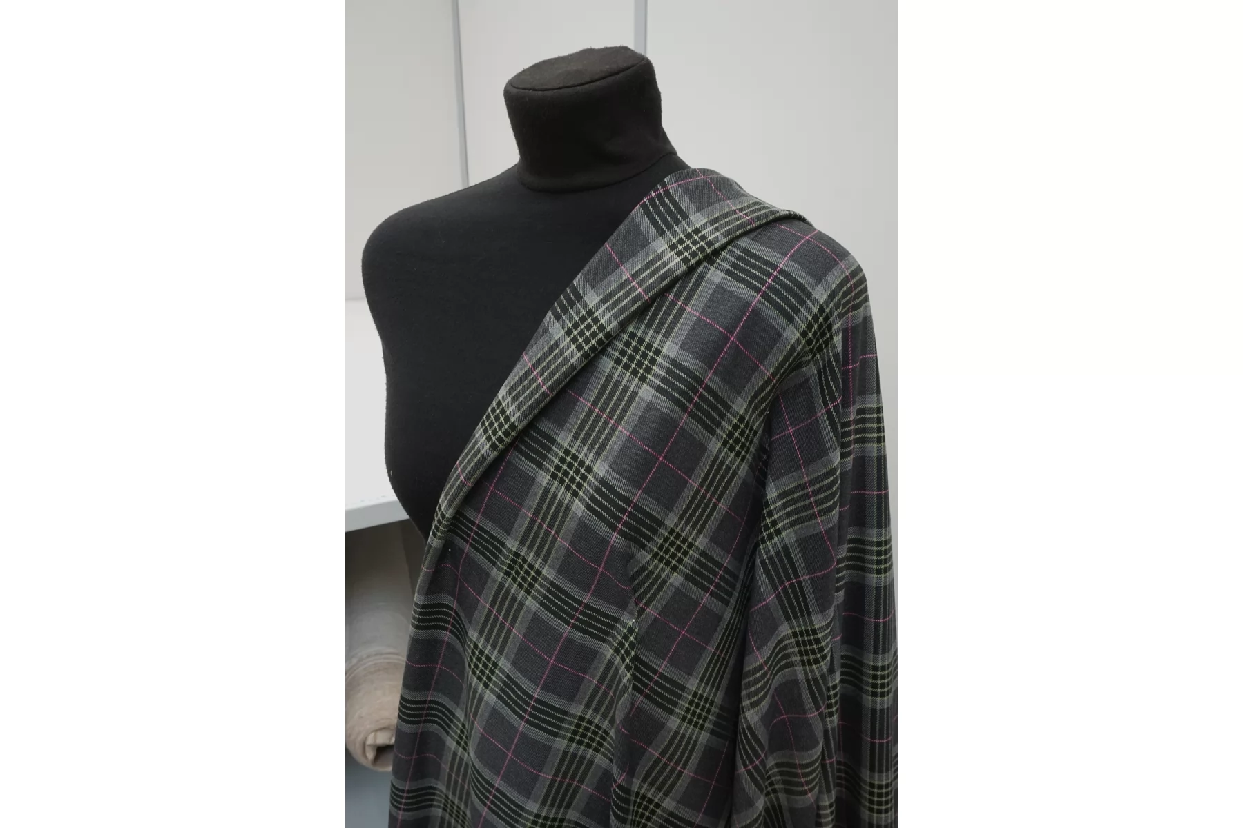 Костюмная поливискоза в клетку из нитей серого, чёрного и зелёного цвета. Материал тактильно приятный и мягкий, гладкий, тонкий, но плотненький, не мнется. Обладает хорошей износостойкостью. Красив в своей пластике. Не просвечивает. Немного держит форму. Тянется за счет содержания эластана. Шьем жакеты, костюмы, платья, юбки, брюки и не только. Рекомендуется деликатный уход.