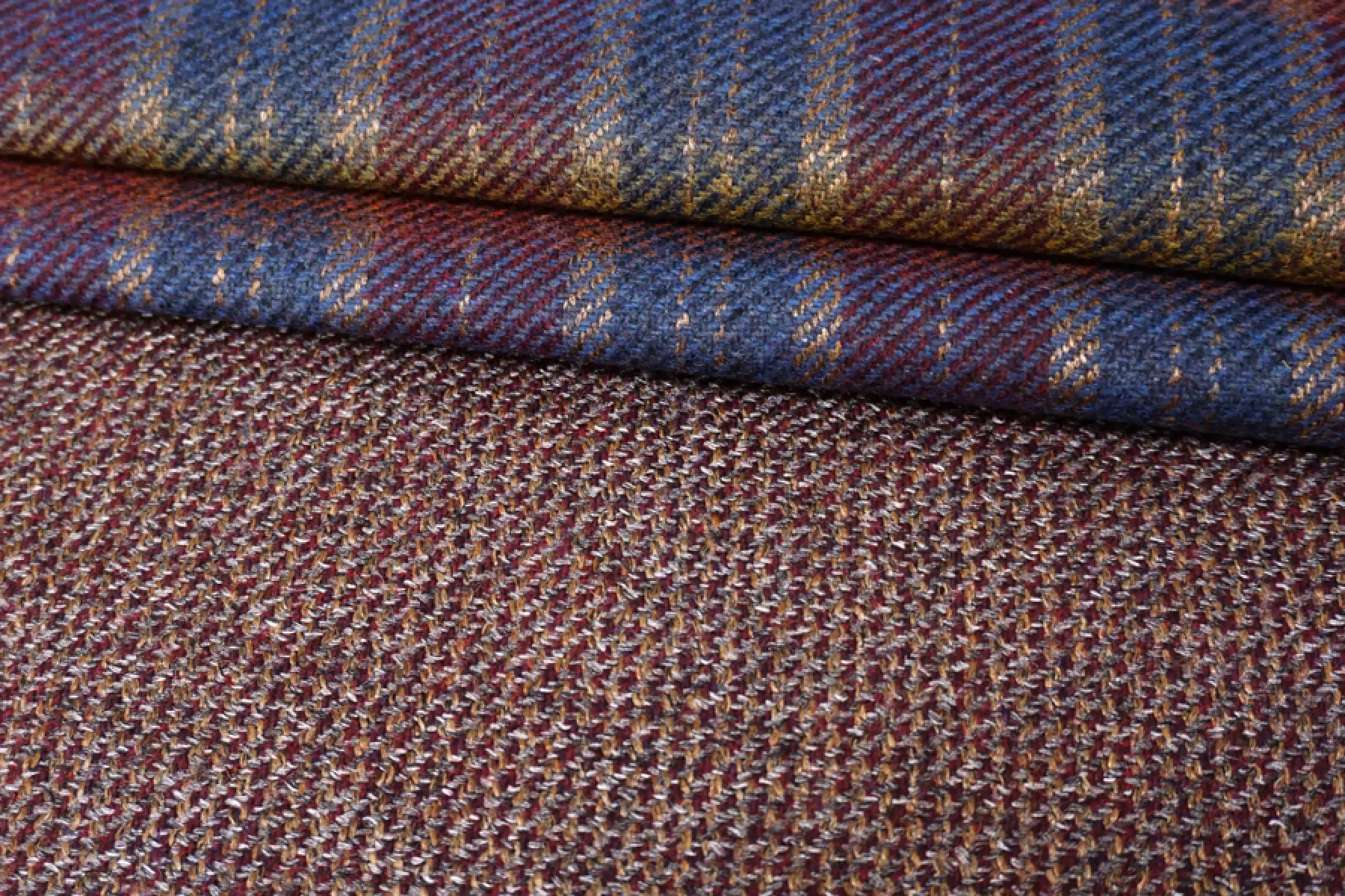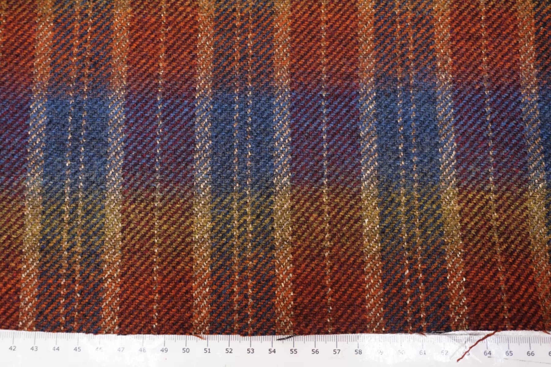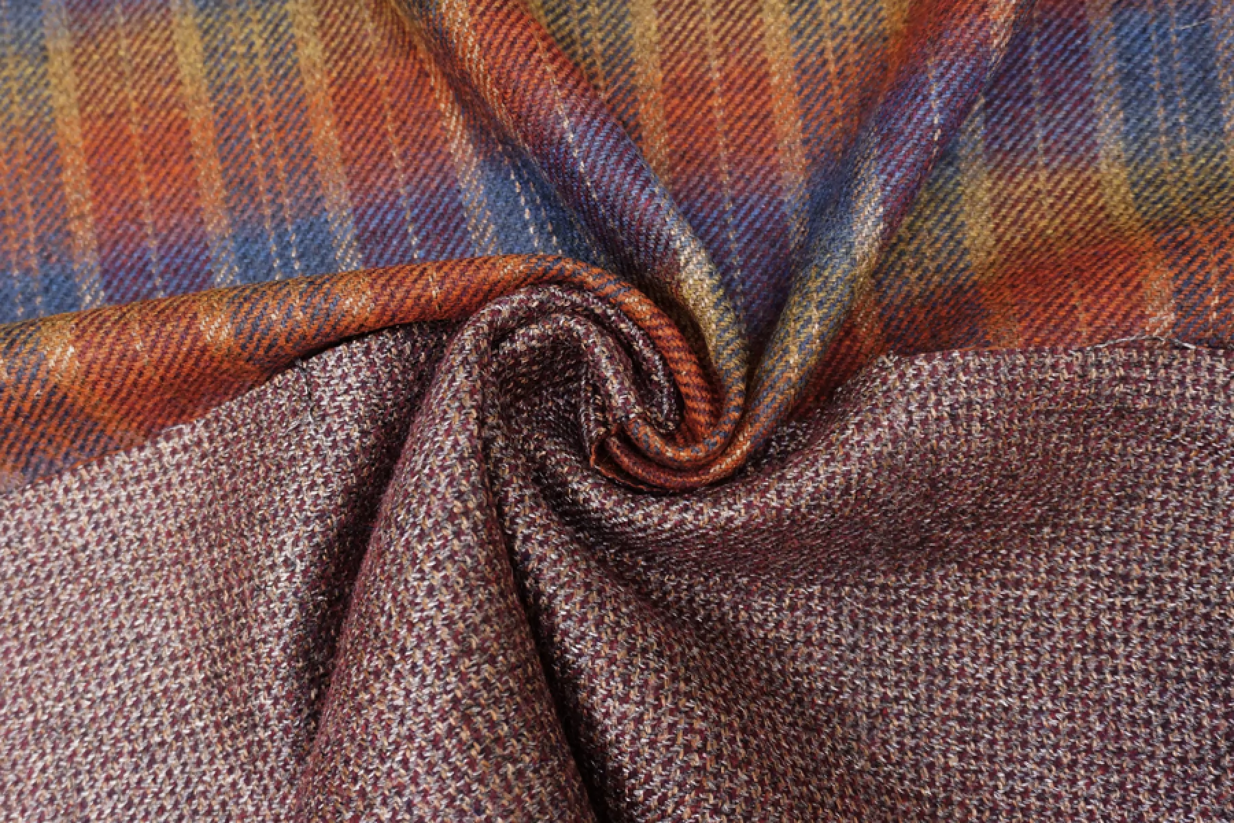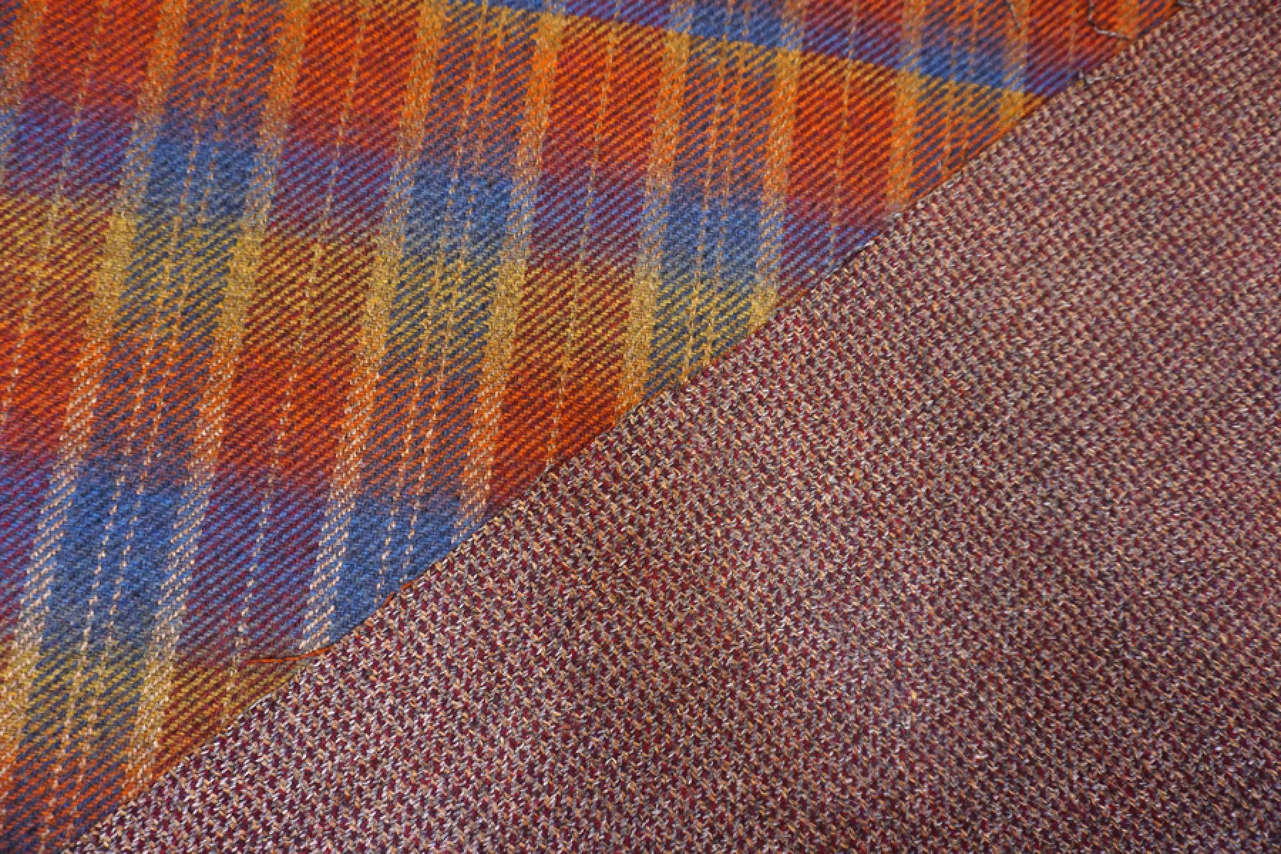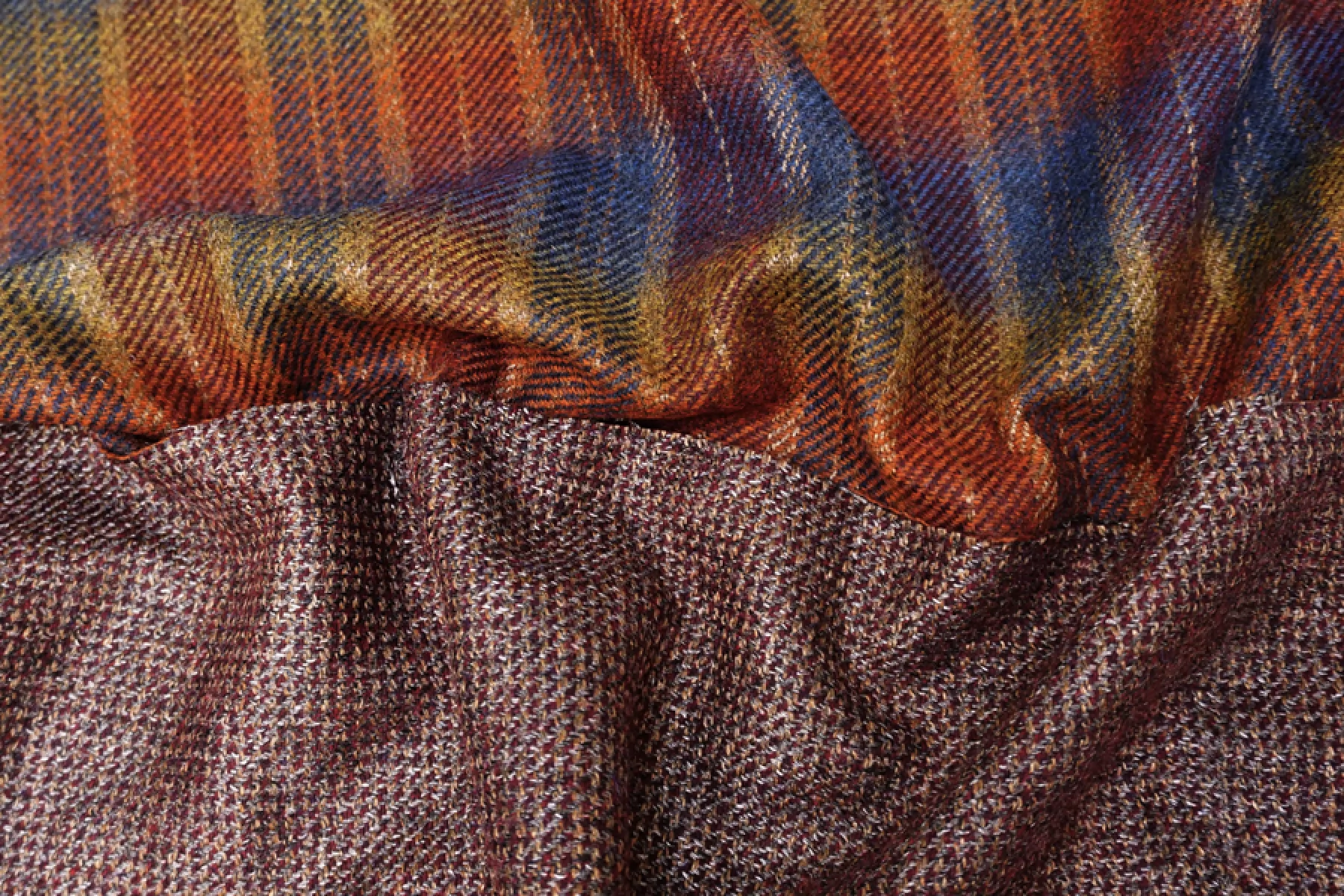 Прекрасная костюмная шерсть одна сторона в клетку приглушенных радужных цветов, другая сторона блестящая серебристо-бордовая. Мягкая, приятная, чувствуется, что шерсть, слегка сухая. Немного колется. С легким прижатым ворсом. Красиво смотрится в пластике и складках. Красиво блестит. Не тянется. Материал плотненький ~1,5 мм толщиной. Неплохо держит форму. Не тянется, но восстанавливается. Отлично подойдет для пошива костюма, жакета, юбки. Уход деликатный.