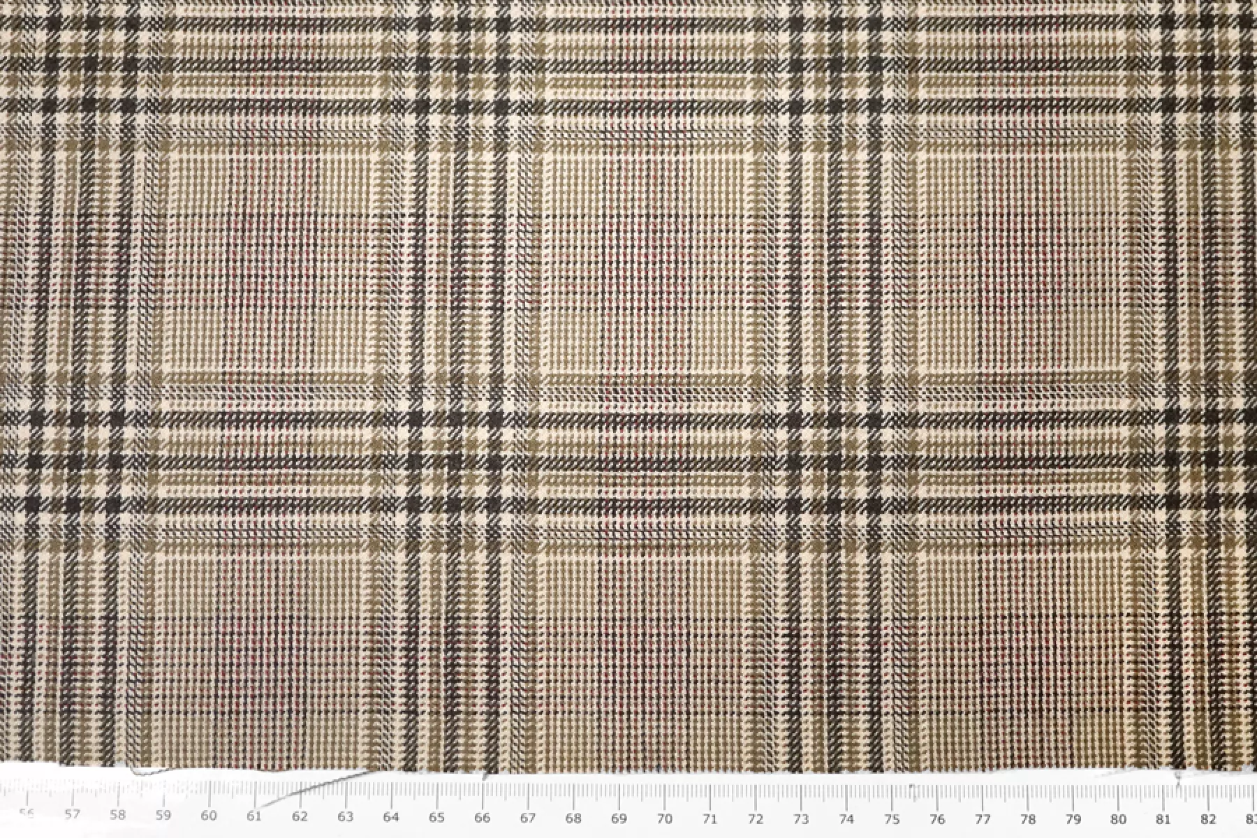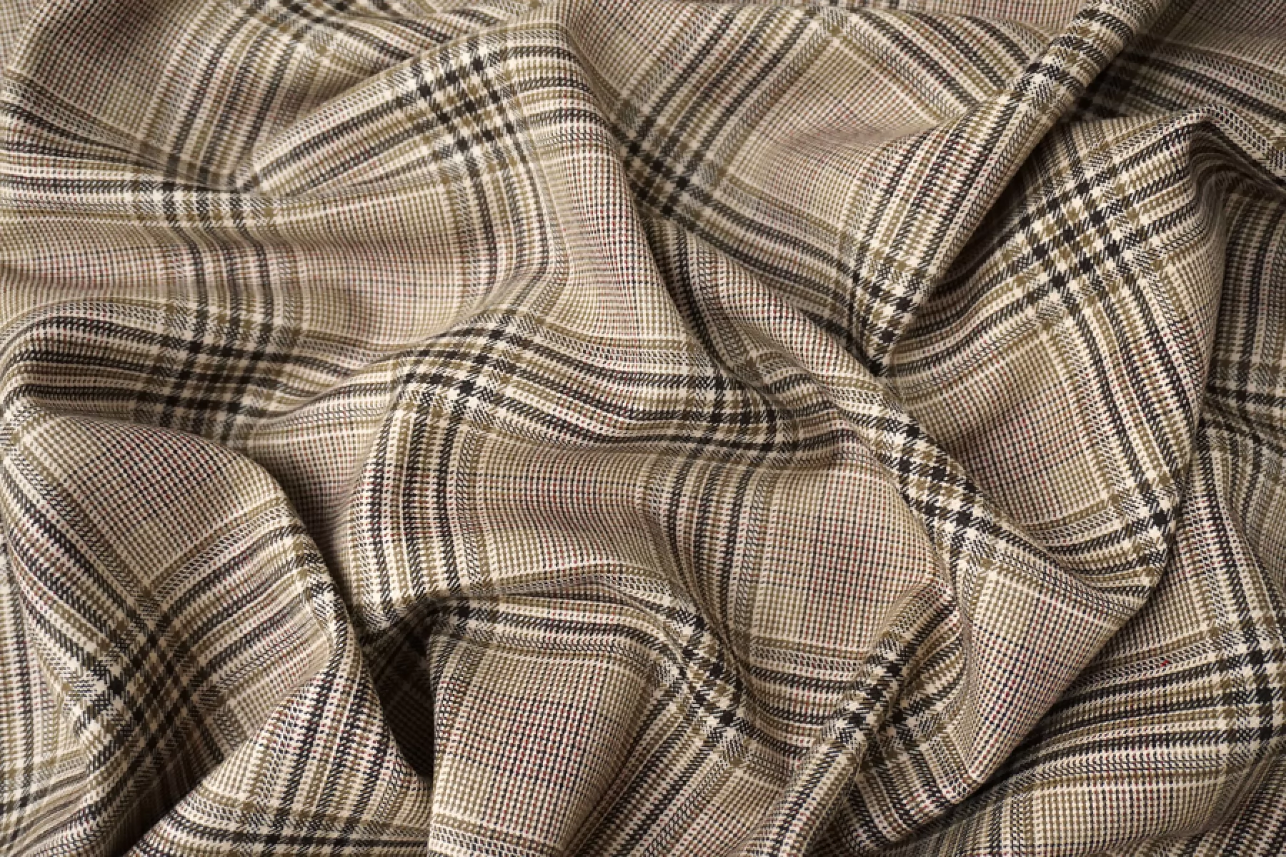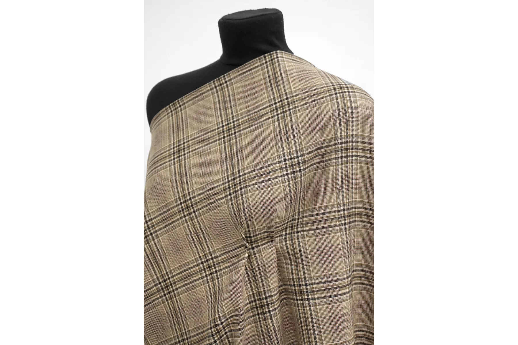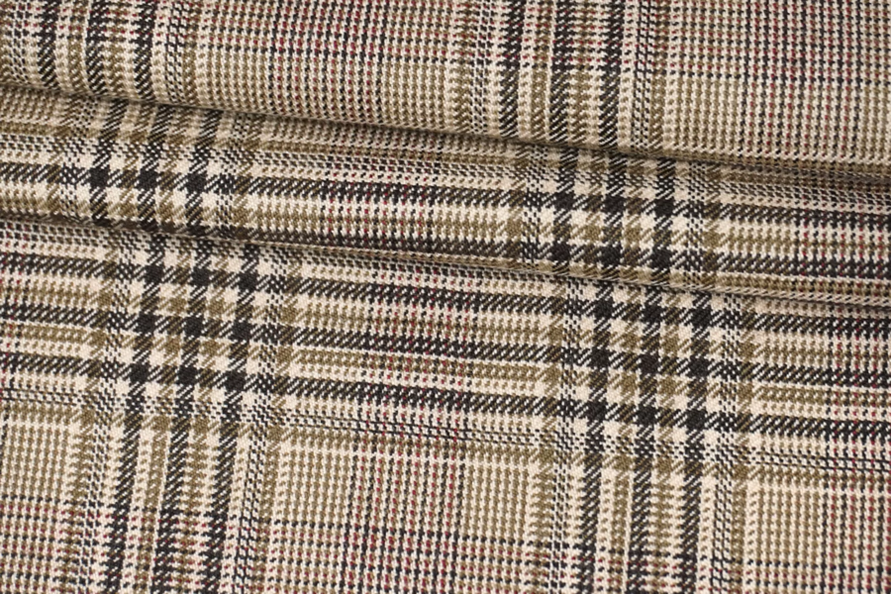Костюмная шерсть BURBERRY в клетку, которую образует переплетение нитей коричневого, бежевого и зеленовато-коричневых приглушенных оттенков с вплетением в полотно темно-красных оттенков. Тактильно приятная. Клетка достаточно крупная. Полотно плотное. Совсем не колется, но ощущается шерсть. Не просвечивает. Не тянется. Не мнется. Шерсть красива в своей пластике. Хорошо драпируется и держит форму. Прекрасно подойдет на жакеты, костюмные варианты, юбки и не только. Уход за шерстью деликатный.