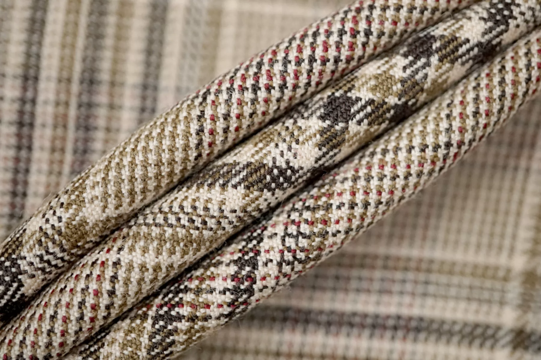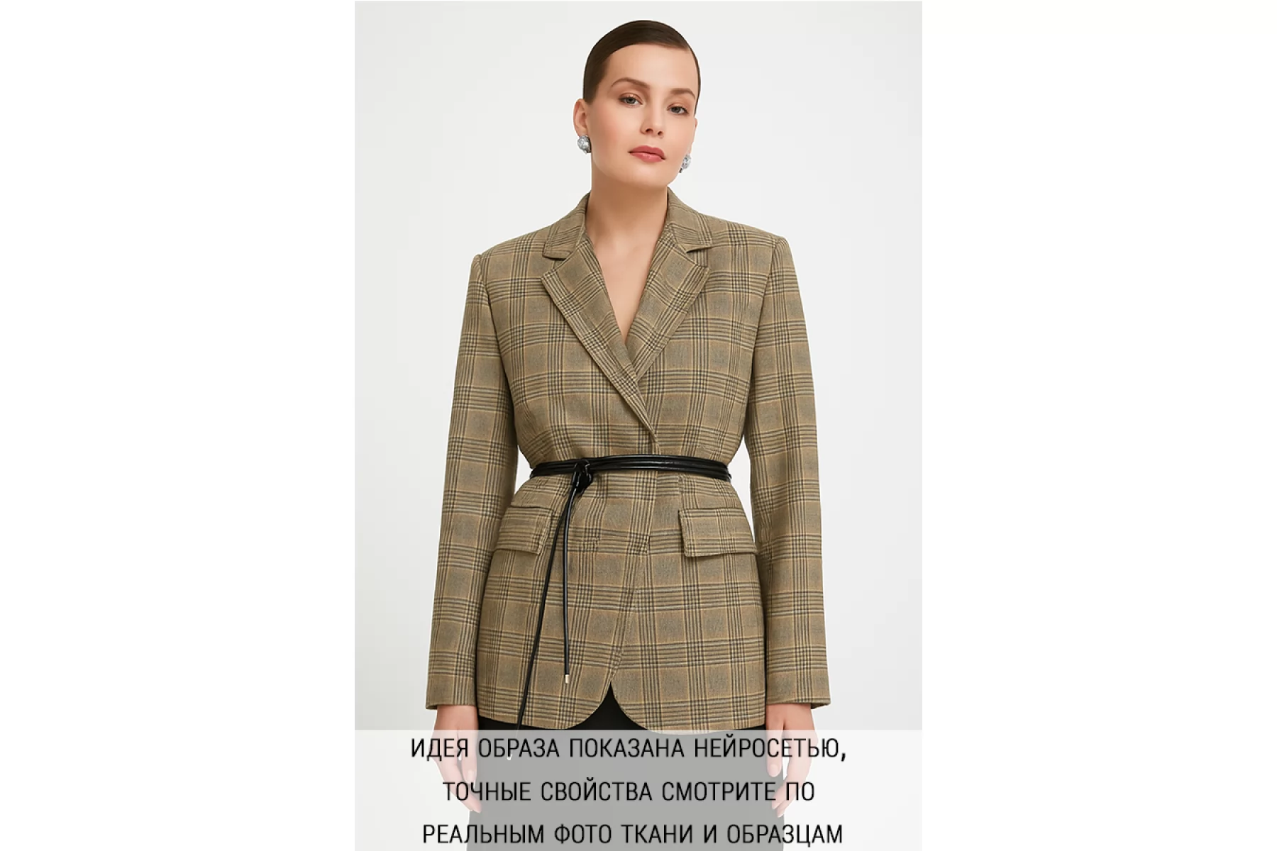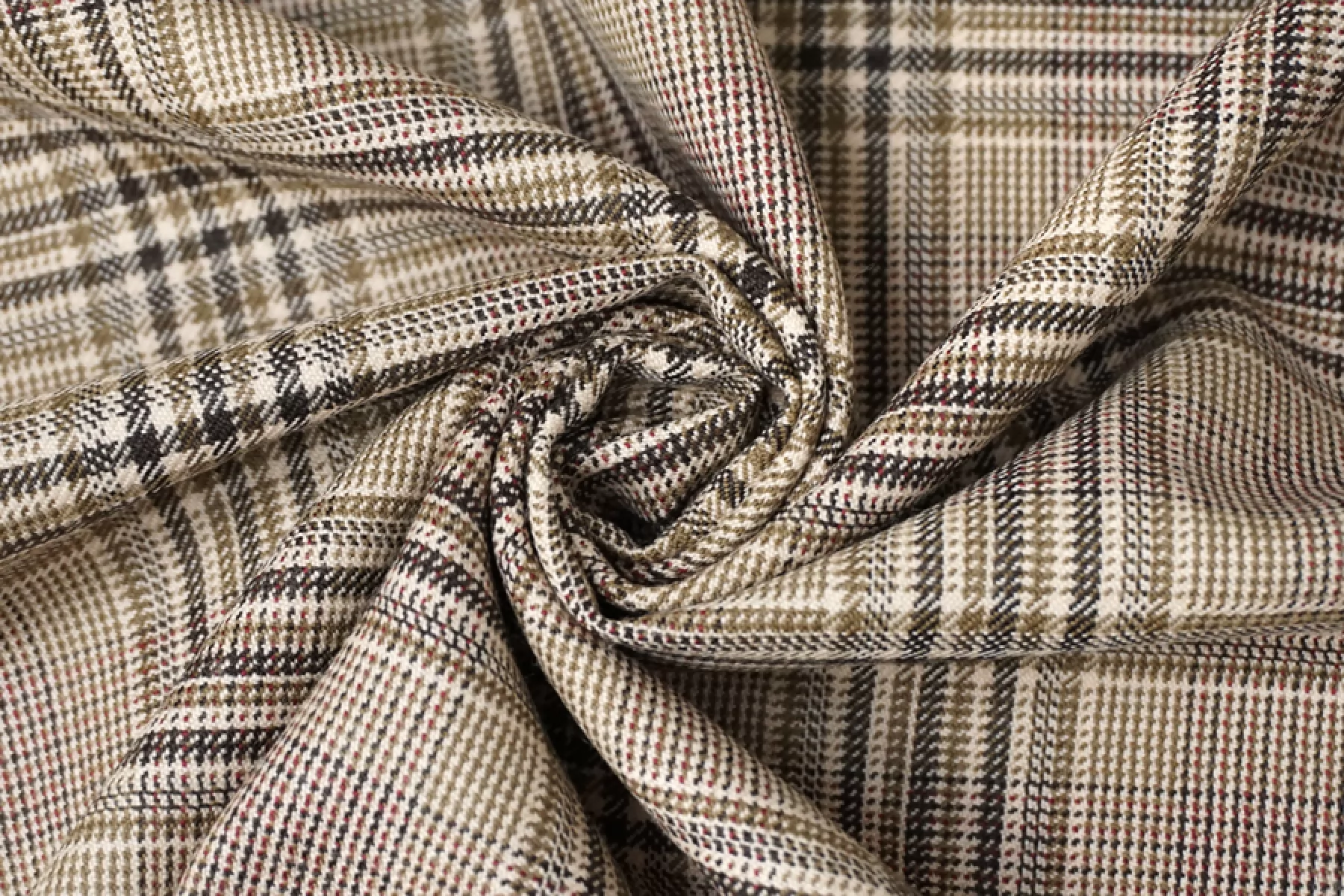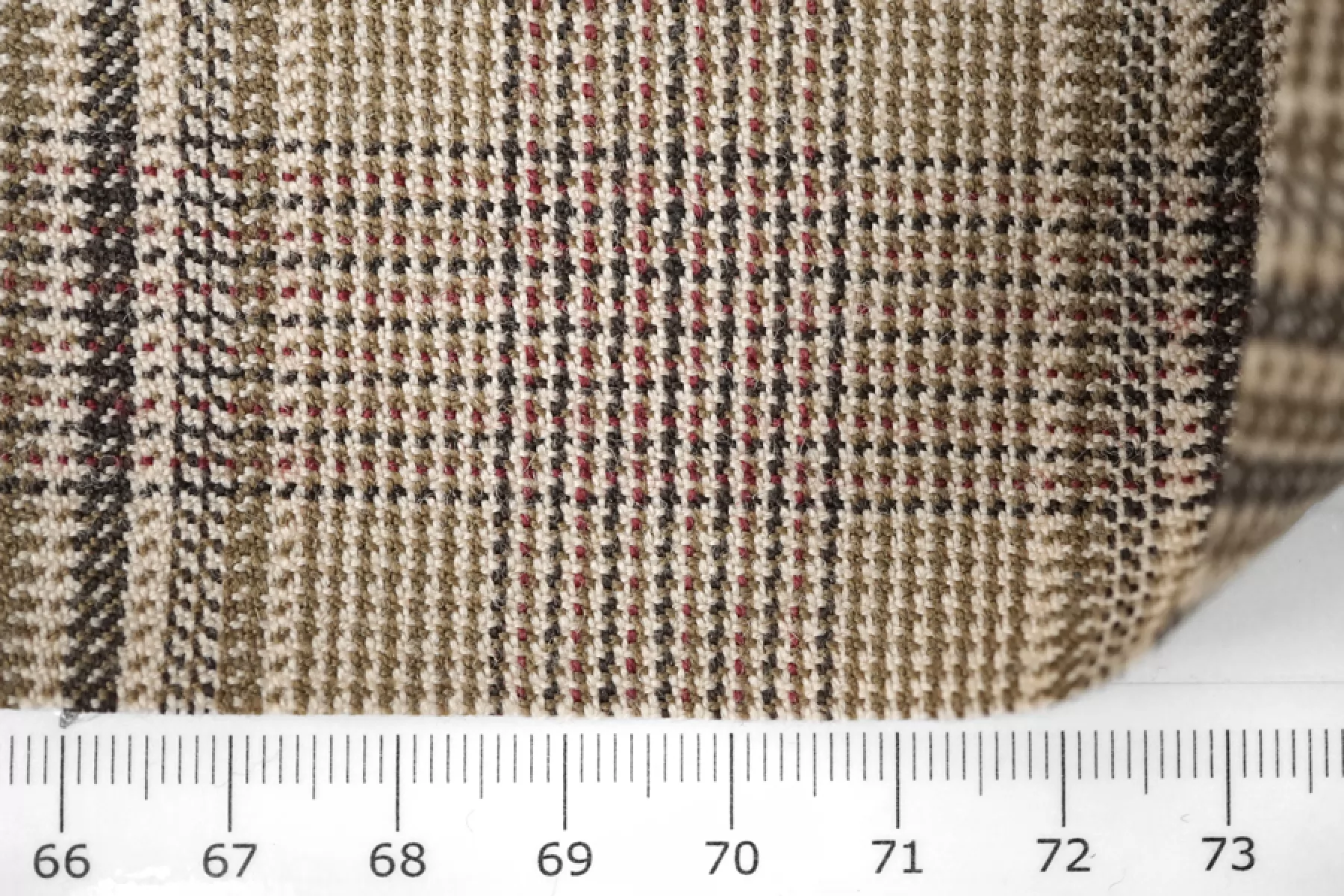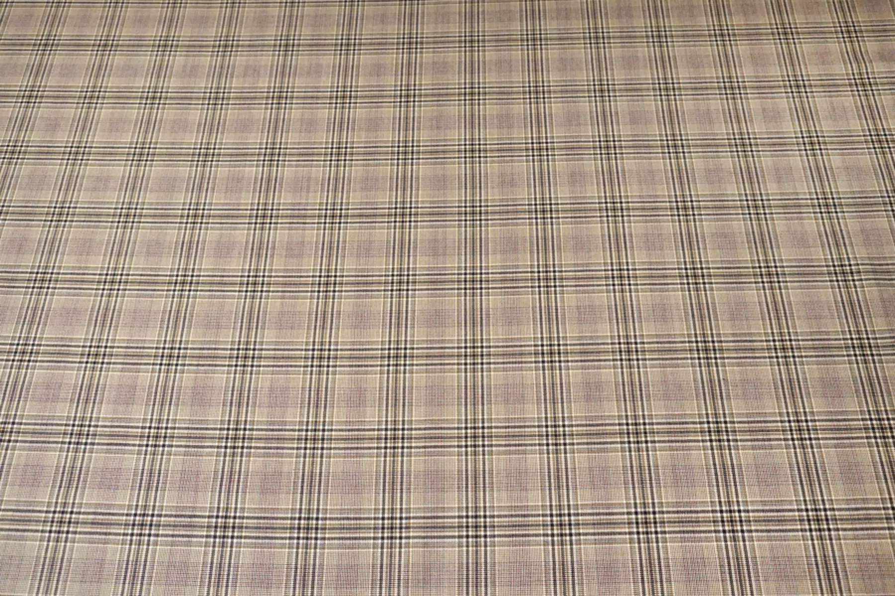 Костюмная шерсть BURBERRY в клетку, которую образует переплетение нитей коричневого, бежевого и зеленовато-коричневых приглушенных оттенков с вплетением в полотно темно-красных оттенков. Тактильно приятная. Клетка достаточно крупная. Полотно плотное. Совсем не колется, но ощущается шерсть. Не просвечивает. Не тянется. Не мнется. Шерсть красива в своей пластике. Хорошо драпируется и держит форму. Прекрасно подойдет на жакеты, костюмные варианты, юбки и не только. Уход за шерстью деликатный.