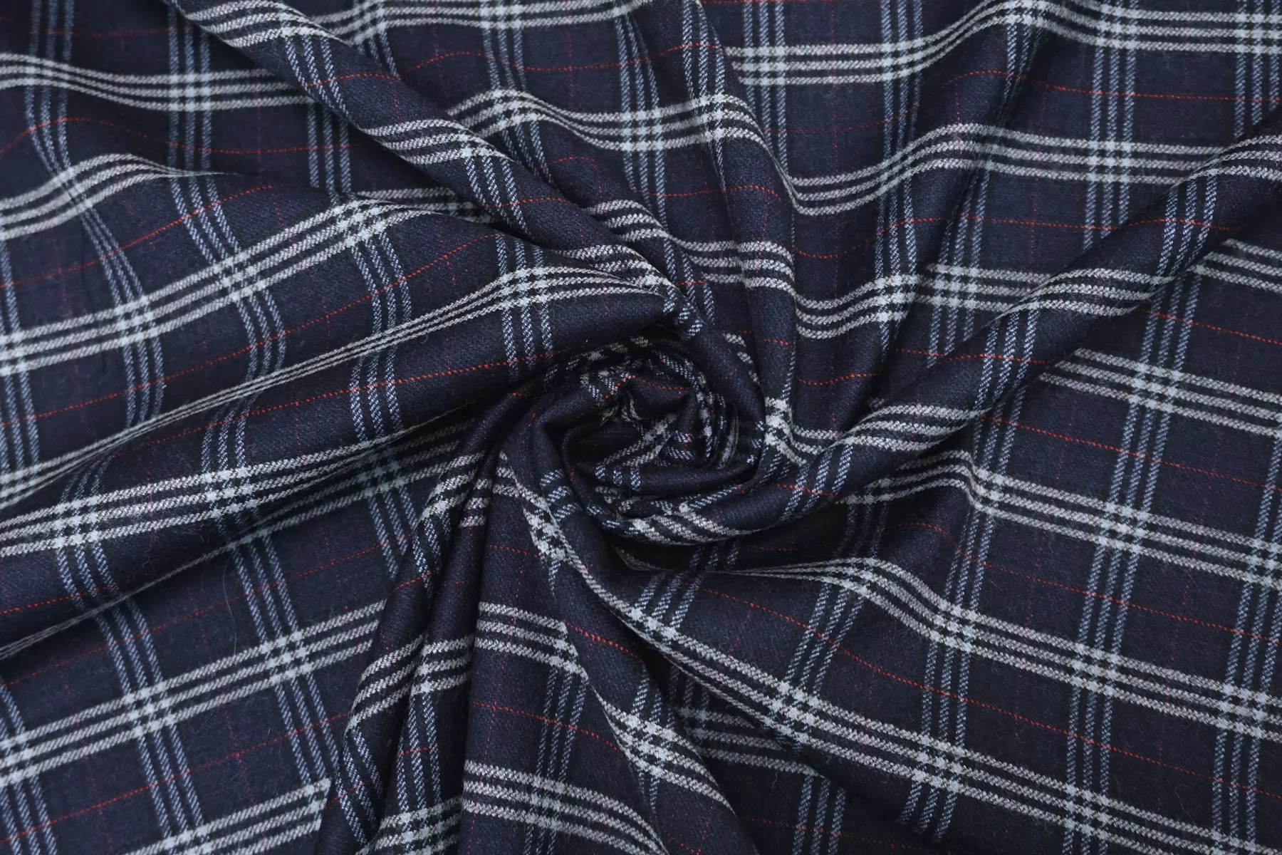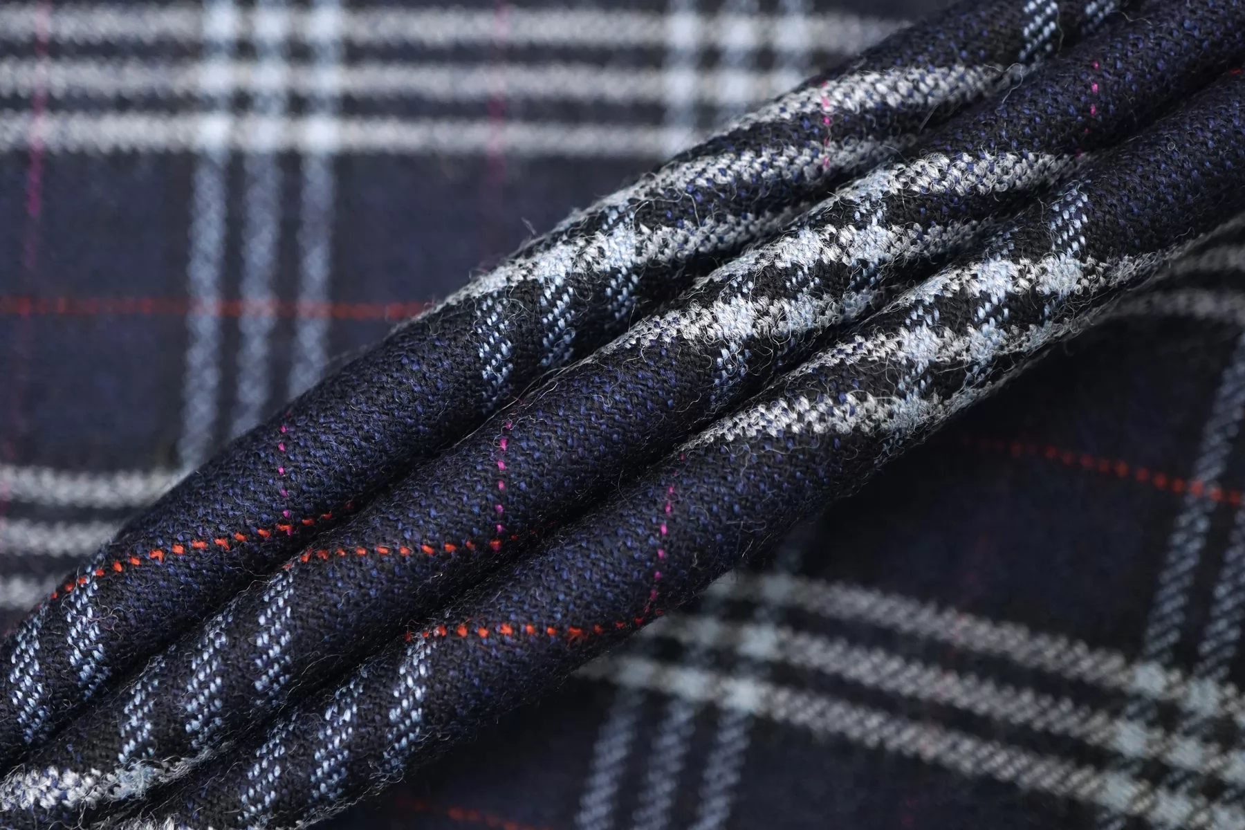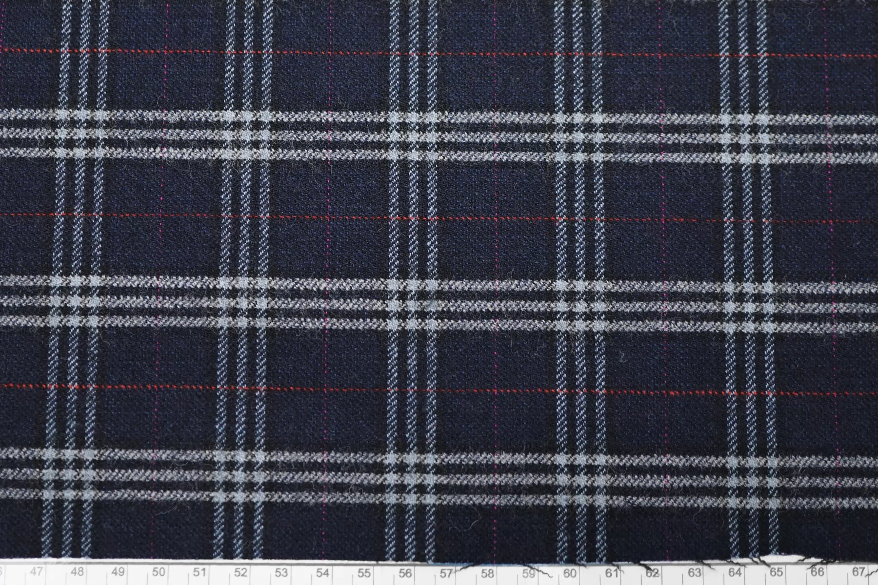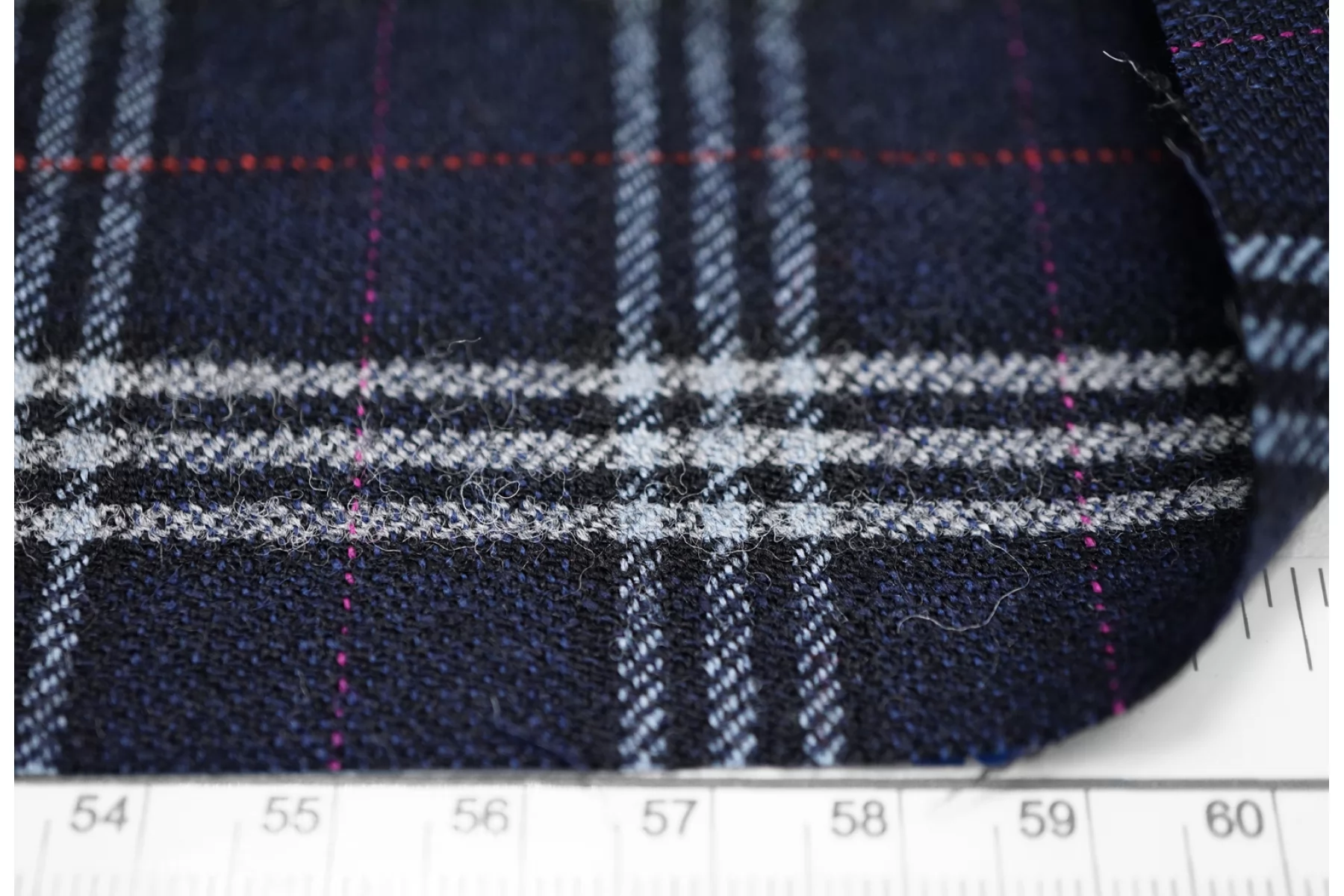 Классная костюмная вирджинская шерсть в клетку, основные нити тёмно-синего оттенка, плюс светло-серые, голубые, чёрные, красные и фиолетовые. Тактильно слегка шероховатая, покалывает. Тянется. Не просвечивает. Не мнется. Пластичная, но при этом держит форму. Шьем костюмы, юбки, брюки, или теплые рубашки верхнего слоя. Уход деликатный.