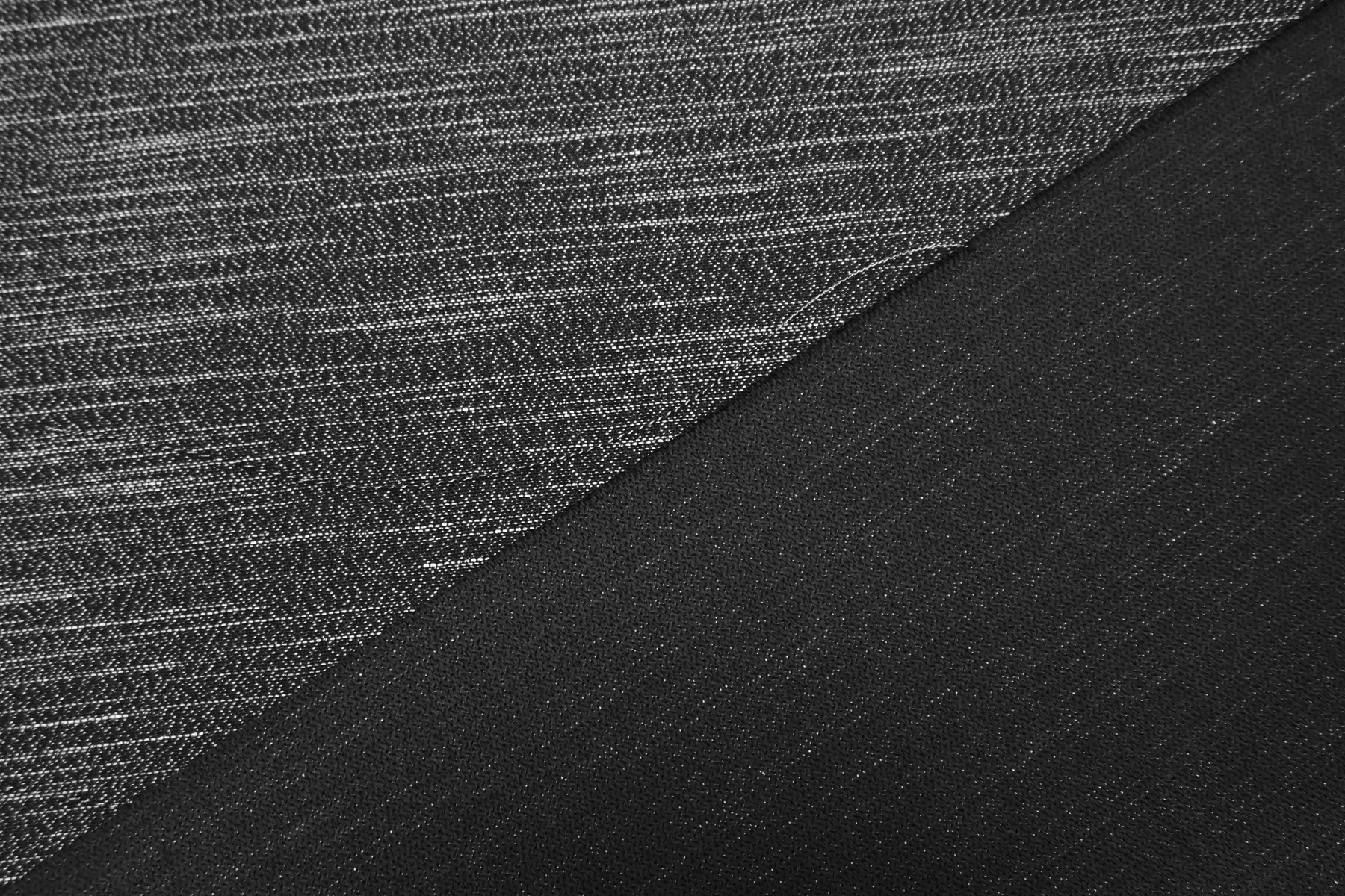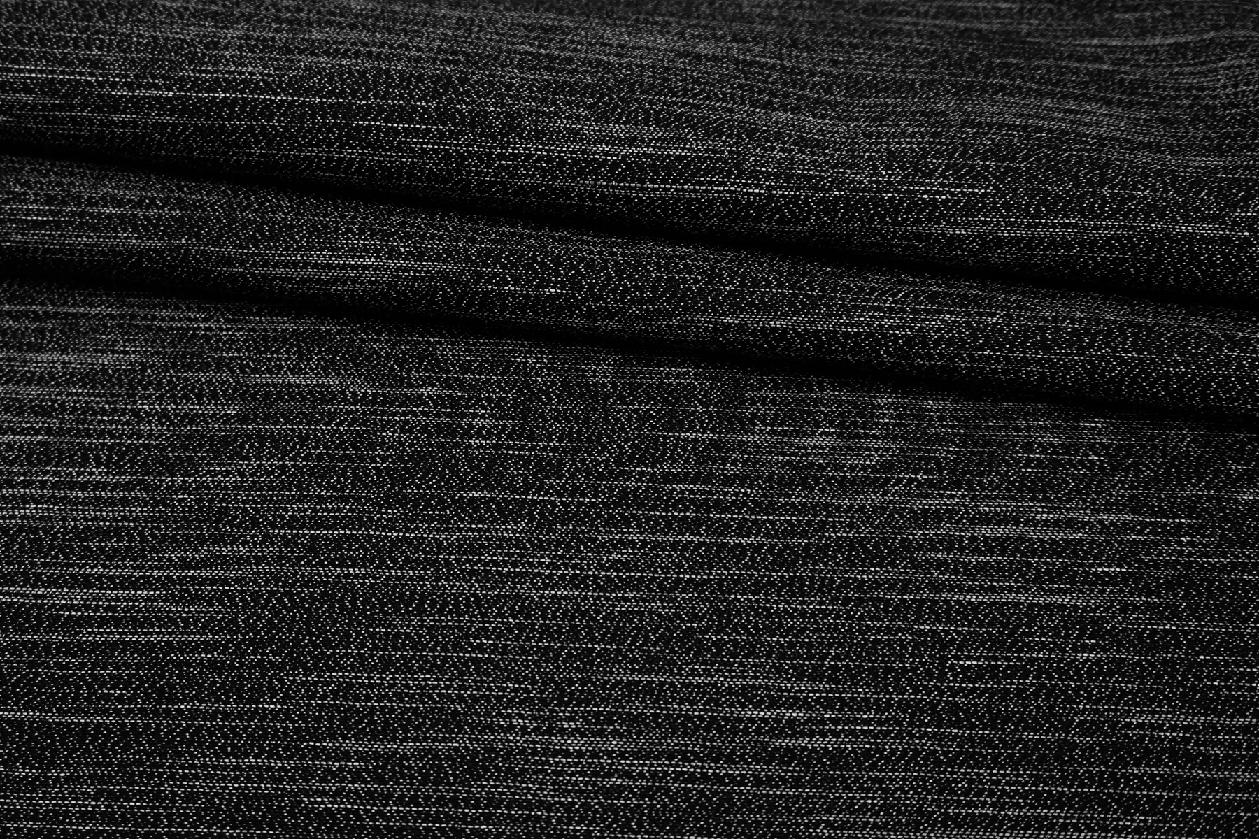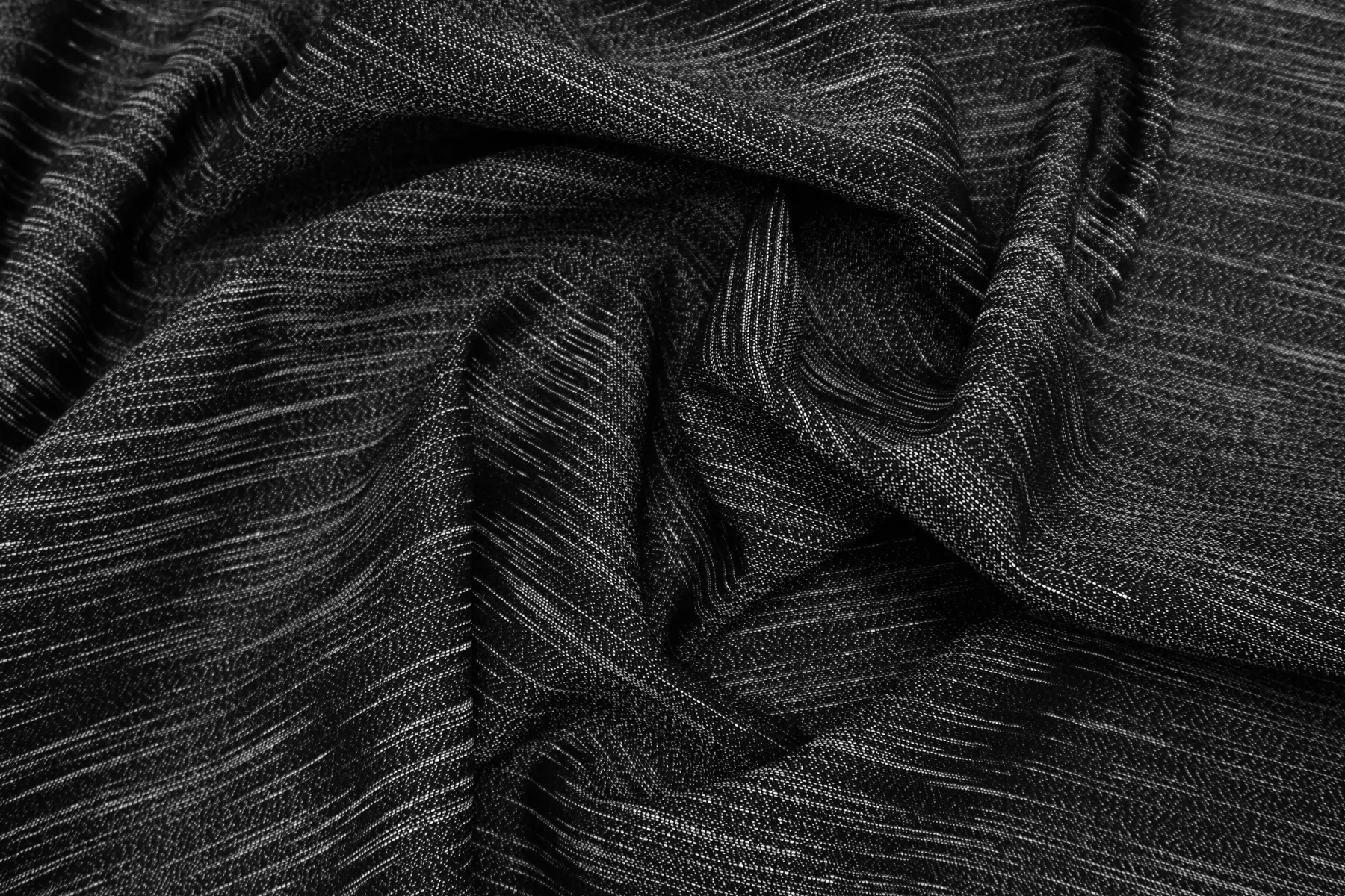 Очень интересная костюмная шерсть с добавлением льна из переплетения черных и светло-серых нитей образующих хаотичные поперечные полосы. Светло-серые нити - лен, черные - шерсть. Тактильно суховатая и шероховатая. Немного колется. Плотная, при этом достаточно пластичная. Держит складки. Не просвечивает. Не тянется. Не мнется. Идеальный осенний и зимний вариант на стильные костюмы, брюки, юбки или жакеты. Уход деликатный